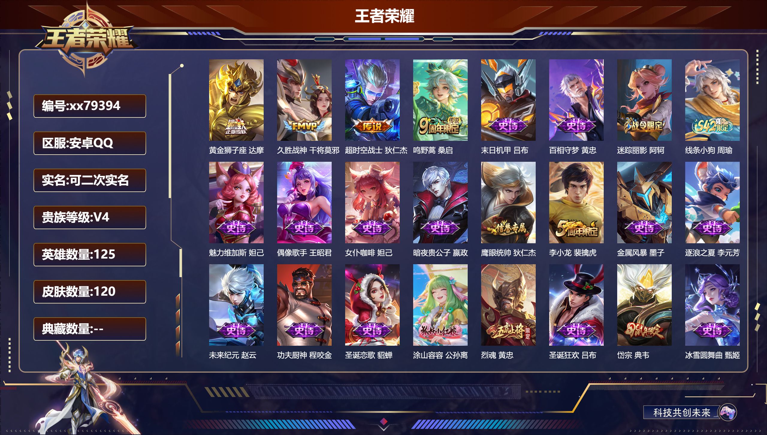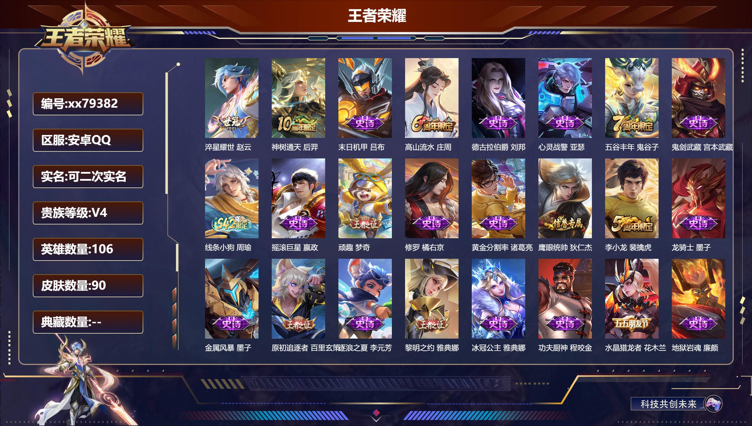 PX_2574457-,可二次,V4,贵族积分3682,安卓QQ/90皮肤/105英雄/0典藏/0珍品无双/0无双/0珍品传说/2传说/33史诗/7稀有英雄,打野32段 【2,传说皮肤】,淬星耀世,赵云,神树通天,后羿, 【33,史诗皮肤】,末日机甲,吕布,高山流水,庄周,德古拉伯爵,刘邦,心灵战警,亚瑟,五谷丰年,鬼谷子,鬼剑武藏,宫本武藏,线条小狗,周瑜,摇滚巨星,嬴政,顽趣,梦奇,修罗,橘右京,黄金分割率,诸葛亮,鹰眼统帅,狄仁杰,李小龙,裴擒虎,龙骑士,墨子,金属风暴,墨子,原初追逐者,百里玄策,逐浪之夏,李元芳,黎明之约,雅典娜,冰冠公主,雅典娜,功夫厨神,程咬金,水晶猎龙者,花木兰,地狱岩魂,廉颇,冰雪圆舞曲,甄姬,航海奇遇记,老夫子,千年之狐,李白,乱世虎臣,张飞,万物之道,弈星,真爱魔法,干将莫邪,水果甜心,孙尚香,江河有灵,阿古朵,幽灵船长,曹操,乘风破浪,夏侯惇,暗隐猎兽者,兰陵王, 【44,勇者皮肤】,爱心护理,阿轲,沙漠行僧,达摩,大漠名商,沈梦溪,拳王,达摩,丁香结,小乔,铁甲之心,典韦,海盐诗旅,桑启,归虚梦演,孙膑,阴阳师,狄仁杰,鲨炮海盗猫,沈梦溪,海滩派对,项羽,完美运算,后羿,万华元夜,狄仁杰,演武夺筹,程咬金,野性能量,吕布,天穹祈灯,鬼谷子,化身博士,扁鹊,潮玩牛仔,马可波罗,死亡骑士,亚瑟,胡桃狂想曲,蒙犽,玩偶对对碰,安琪拉,掌控之力,诸葛亮,圣弓游侠,后羿,忍·炎影,赵云,万事如意,刘备,擒涛扼浪,裴擒虎,乓乓大师,鲁班大师,探海日志,鲁班大师,兔女郎,花木兰,龙腾万里,关羽,金庭之子,兰陵王,千军破阵,苏烈,花好人间,甄姬,街头霸王,韩信,云中旅人,李元芳,西部大镖客,孙悟空,神迹守卫,墨子,进击墨子号,墨子,少女阿狸,妲己,春野闲踪,苏烈,驱傩正仪,钟馗,特工战影,狂铁,鹤鸣心笺,艾琳,线条小狗,周瑜, 【13,其他皮肤】,芝加哥教父,黄忠,极冰防御线,盾山,超能战警,曹操,冰刃幻境,镜,魇语军师,司马懿,午夜歌剧院,元歌,启蛰,司空震,范海辛,李白,激情绿茵,马可波罗,尼罗河女神,女娲,归虚梦演,曜,精灵公主,王昭君,西部大镖客,孙悟空, 【7,稀有英雄】,不知火舞,橘右京,夏洛特,娜可露露,韩信,艾琳,赵云, 营地ID:,