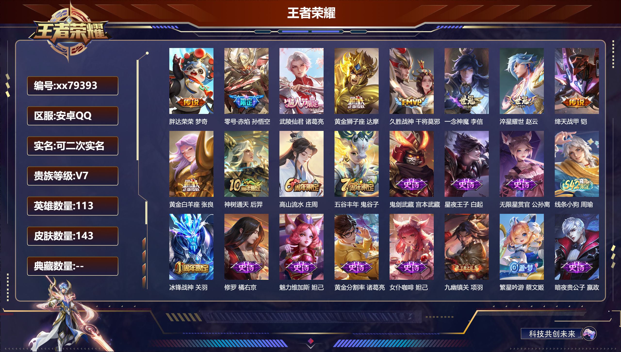 PX_2574458-,可二次,V7,贵族积分33541,安卓QQ/143皮肤/113英雄/0典藏/0珍品无双/0无双/0珍品传说/10传说/42史诗/7稀有英雄 【10,传说皮肤】,胖达荣荣,梦奇,零号·赤焰,孙悟空,武陵仙君,诸葛亮,黄金狮子座,达摩,久胜战神,干将莫邪,一念神魔,李信,淬星耀世,赵云,绛天战甲,铠,黄金白羊座,张良,神树通天,后羿, 【42,史诗皮肤】,高山流水,庄周,五谷丰年,鬼谷子,鬼剑武藏,宫本武藏,星夜王子,白起,无限星赏官,公孙离,线条小狗,周瑜,冰锋战神,关羽,修罗,橘右京,魅力维加斯,妲己,黄金分割率,诸葛亮,女仆咖啡,妲己,九幽镇关,项羽,繁星吟游,蔡文姬,暗夜贵公子,嬴政,鹰眼统帅,狄仁杰,大圣娶亲,孙悟空,孙行者,孙悟空,李小龙,裴擒虎,金属风暴,墨子,逐梦之影,韩信,傲雪梅枪,韩信,特工魅影,百里守约,朱雀志,百里守约,魔术师,狄仁杰,皇家上将,赵云,圣诞恋歌,貂蝉,百木心枪,赵云,一生所爱,露娜,白龙吟,韩信,蔷薇恋人,孙尚香,航海奇遇记,老夫子,万灵启世,女娲,青龙志,铠,箭羽风息,伽罗,乱世虎臣,张飞,绅士熊喵,刘禅,魔法小厨娘,安琪拉,时之恋人,孙尚香,水果甜心,孙尚香,幽灵船长,曹操,乘风破浪,夏侯惇,暗隐猎兽者,兰陵王, 【71,勇者皮肤】,圆桌骑士,盾山,爱心护理,阿轲,沙漠行僧,达摩,大漠名商,沈梦溪,缤纷绘卷,张良,纽约教父,刘备,拳王,达摩,大发明家,达摩,沉稳之力,孙尚香,醍醐杖,老夫子,白色死神,白起,黄金武士,典韦,阴阳师,狄仁杰,次元突破,哪吒,功夫老勺,老夫子,鲨炮海盗猫,沈梦溪,海滩派对,项羽,万华元夜,狄仁杰,无尽征程,廉颇,克喵,鬼谷子,制霸全明星,牛魔,踏浪烽翎,莱西奥,演武夺筹,程咬金,奇妙博物学,庄周,野性能量,吕布,哥特玫瑰,露娜,瓷语鉴心,露娜,原初探秘者,鬼谷子,疑决卦,明世隐,五福同心,张飞,次元傲视,杨戬,潮玩牛仔,马可波罗,赤莲之焰,周瑜,死亡骑士,亚瑟,敏锐之力,李白,胡桃狂想曲,蒙犽,掌控之力,诸葛亮,海滩丽影,钟无艳,忍·炎影,赵云,坚韧之力,苏烈,唤灵魔甲,刘禅,万事如意,刘备,乓乓大师,鲁班大师,溯影追猎,虞姬,兔女郎,花木兰,龙腾万里,关羽,金庭之子,兰陵王,千军破阵,苏烈,荣光之誓,亚瑟,花好人间,甄姬,教廷特使,韩信,街头霸王,韩信,云中旅人,李元芳,紫罗兰之誓,妲己,神迹守卫,墨子,重装意志,盘古,进击墨子号,墨子,少女阿狸,妲己,混沌棋,弈星,春野闲踪,苏烈,布丁狗之约,阿古朵,幻想奇妙夜,王昭君,灵野札记,张良,驱傩正仪,钟馗,神迹守卫,钟馗,死霸装,白起,特工战影,狂铁,白执事,赵云,鹤鸣心笺,艾琳,锦麟游梦,庄周,线条小狗,周瑜, 【21,其他皮肤】,伊势巫女,大乔,金属狂潮,高渐离,战争骑士,夏侯惇,三太子,哪吒,龙域领主,铠,第七人偶,干将莫邪,万圣前夜,小乔,灼热之刃,李信,精灵王,后羿,街头旋风,裴擒虎,范海辛,李白,占星师,明世隐,画中游,桑启,归虚梦演,曜,创世神祝,盘古,特种部队,李元芳,绝影神枪,百里守约,秩序猎龙将,蒙恬,精准探案法,米莱狄,赤焰之缨,云缨,地府判官,钟馗, 【7,稀有英雄】,不知火舞,橘右京,夏洛特,娜可露露,韩信,艾琳,赵云, 营地ID:,