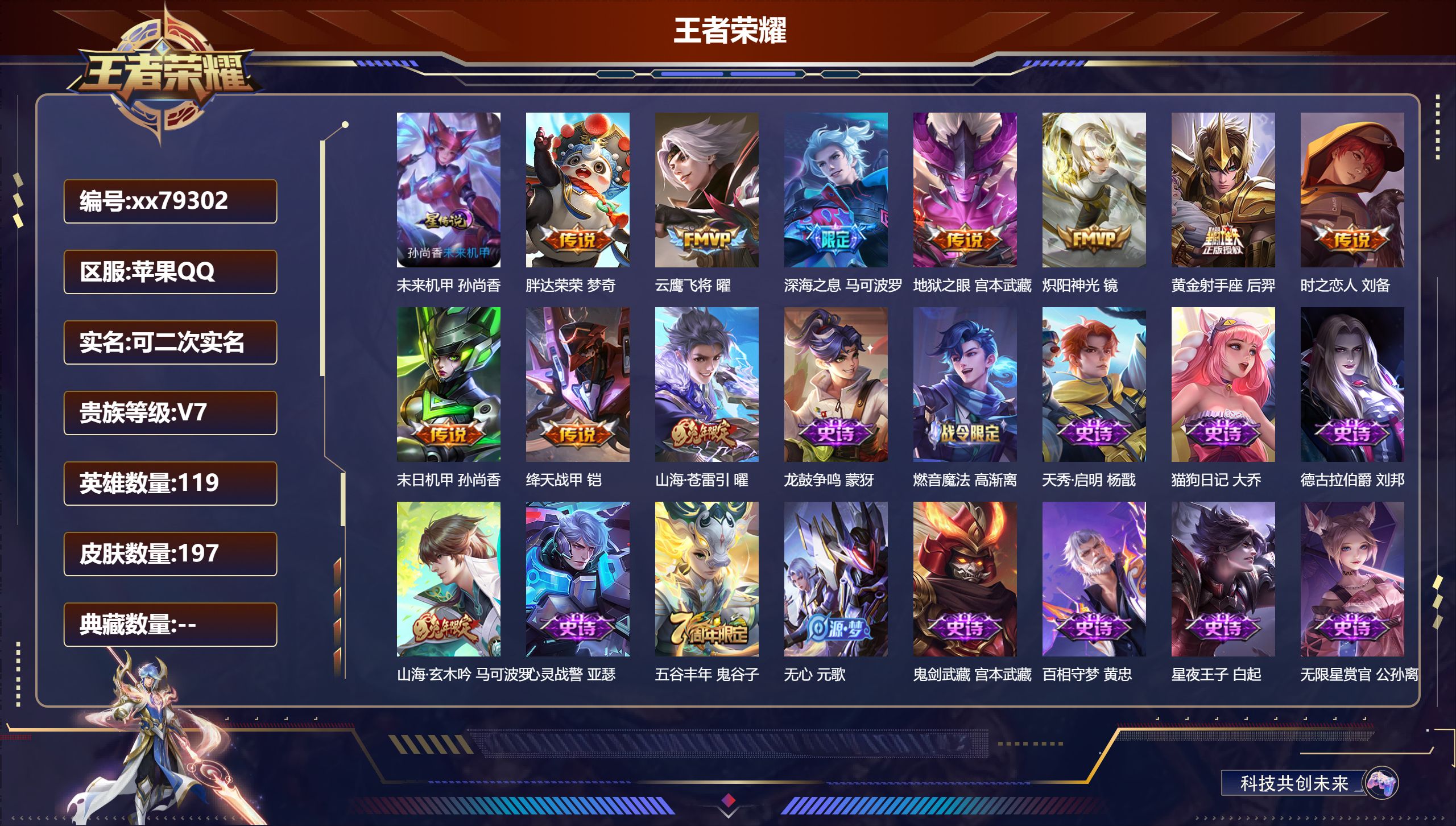 PX_2574072-,可二次,V7,贵族积分33259,苹果QQ/197皮肤/119英雄/0典藏/0珍品无双/0无双/0珍品传说/10传说/63史诗/8稀有英雄 【1,星传说皮肤】,未来机甲,孙尚香, 【10,传说皮肤】,胖达荣荣,梦奇,云鹰飞将,曜,深海之息,马可波罗,地狱之眼,宫本武藏,炽阳神光,镜,黄金射手座,后羿,时之恋人,刘备,末日机甲,孙尚香,绛天战甲,铠,山海·苍雷引,曜, 【63,史诗皮肤】,龙鼓争鸣,蒙犽,燃音魔法,高渐离,天秀·启明,杨戬,猫狗日记,大乔,德古拉伯爵,刘邦,山海·玄木吟,马可波罗,心灵战警,亚瑟,五谷丰年,鬼谷子,无心,元歌,鬼剑武藏,宫本武藏,百相守梦,黄忠,星夜王子,白起,无限星赏官,公孙离,线条小狗,周瑜,百相守梦,关羽,魅力维加斯,妲己,黄金分割率,诸葛亮,荣光圣徽,蒙恬,女仆咖啡,妲己,赏金猎手,澜,九幽镇关,项羽,星界游侠,暃,晚萤,娜可露露,鹰眼统帅,狄仁杰,纤云弄巧,云中君,降魔,墨子,玄嵩,庄周,特工魅影,百里守约,猫狗日记,孙策,逐浪之夏,李元芳,奇幻香踪,扁鹊,未来纪元,赵云,朱雀志,百里守约,黎明之约,雅典娜,魔术师,狄仁杰,热力回旋,百里玄策,唤灵魅影,貂蝉,皇家上将,赵云,至尊宝,孙悟空,功夫厨神,程咬金,梁祝,上官婉儿,电玩·爆裂旋风,刘禅,圣诞恋歌,貂蝉,水晶猎龙者,花木兰,圣诞狂欢,吕布,魅语,不知火舞,顽趣,阿古朵,白龙吟,韩信,地狱岩魂,廉颇,冰雪圆舞曲,甄姬,月团寄思,沈梦溪,千年之狐,李白,万灵启世,女娲,青龙志,铠,匿光破解者,沈梦溪,箭羽风息,伽罗,绅士熊喵,刘禅,缤纷独角兽,小乔,水果甜心,孙尚香,江河有灵,阿古朵,幽灵船长,曹操,乘风破浪,夏侯惇,暗隐猎兽者,兰陵王, 【83,勇者皮肤】,胡桃夹子,干将莫邪,爱心护理,阿轲,太极少年,赵怀真,沙漠行僧,达摩,大漠名商,沈梦溪,纽约教父,刘备,乐园追猎者,白起,丁香结,小乔,海盐诗旅,桑启,幻泉雾影,海月,白色死神,白起,黄金武士,典韦,阴阳师,狄仁杰,径山谋武,孙权,古海寻踪,张良,功夫老勺,老夫子,西部大镖客,牛魔,鲨炮海盗猫,沈梦溪,海滩派对,项羽,完美运算,后羿,踏浪烽翎,莱西奥,西部游侠,莱西奥,野性能量,吕布,百相守梦,影,潮玩探月行,猪八戒,天穹祈灯,鬼谷子,化身博士,扁鹊,阿尔法小队,后羿,东方不败,武则天,虹云星官,明世隐,赤刃凌霄,敖隐,潮玩骑兵,杨戬,死亡骑士,亚瑟,敏锐之力,李白,玩偶对对碰,安琪拉,忍·炎影,赵云,雪境奇遇,西施,坚韧之力,苏烈,唤灵魔甲,刘禅,万事如意,刘备,逐霄战戟,吕布,擒涛扼浪,裴擒虎,乓乓大师,鲁班大师,溯影追猎,虞姬,极光幻客,蚩奼,探海日志,鲁班大师,女武神,艾琳,兔女郎,花木兰,龙腾万里,关羽,金庭之子,兰陵王,未来纪元,宫本武藏,罗小黑战记,哪吒,零食大作战,姬小满,荣光之誓,亚瑟,花好人间,甄姬,万象初新,宫本武藏,时尚教父,姜子牙,春野之旅,钟无艳,街头霸王,韩信,云中旅人,李元芳,灵卜魔法,妲己,春野闲踪,苏烈,布丁狗之约,阿古朵,暖冬·兔眠,嫦娥,命运加冕,露娜,幻想奇妙夜,王昭君,特工战影,狂铁,虚灵犬护,钟馗,白执事,赵云,劲辣红锅,太乙真人,熔金海岸,周瑜,苍林狼骑,苍,天穹之誓,姜子牙,魅影绮裳,影,星梦巡礼,姜子牙,谧流熔炉,太乙真人,鹤鸣心笺,艾琳,锦麟游梦,庄周,云械蓝图,云中君,逆浪荇歌,甄姬,线条小狗,周瑜,噬灭天穹,东皇太一,景韶洛都,明世隐, 【42,其他皮肤】,伊势巫女,大乔,金属狂潮,高渐离,前尘,金蝉,战争骑士,夏侯惇,圣殿之光,刘邦,潮流仙人,老夫子,花见巫女,伽罗,第七人偶,干将莫邪,灼热之刃,李信,熊喵少女,阿古朵,海之征途,孙策,福禄兄弟,鲁班七号,绯红之刃,露娜,冰刃幻境,镜,碧珀绯影,暃,星航指挥官,诸葛亮,午夜歌剧院,元歌,启蛰,司空震,隐刃,兰陵王,霓裳曲,杨玉环,花间舞,公孙离,街头旋风,裴擒虎,归虚梦演,鲁班大师,修竹墨客,上官婉儿,剑舞者,花木兰,维京掠夺者,苍,归虚梦演,蒙犽,激情绿茵,马可波罗,埃及法老,杨戬,归虚梦演,西施,阿摩司公爵,鬼谷子,画中游,桑启,尼罗河女神,女娲,锦衣卫,狄仁杰,幸存者,马超,荷鲁斯之眼,云中君,创世神祝,盘古,绝影神枪,百里守约,孤猎,澜,加勒比小姐,虞姬,秩序猎龙将,蒙恬,露花倒影,嫦娥, 【8,稀有英雄】,敖隐,不知火舞,橘右京,夏洛特,娜可露露,韩信,艾琳,赵云, 营地ID:,