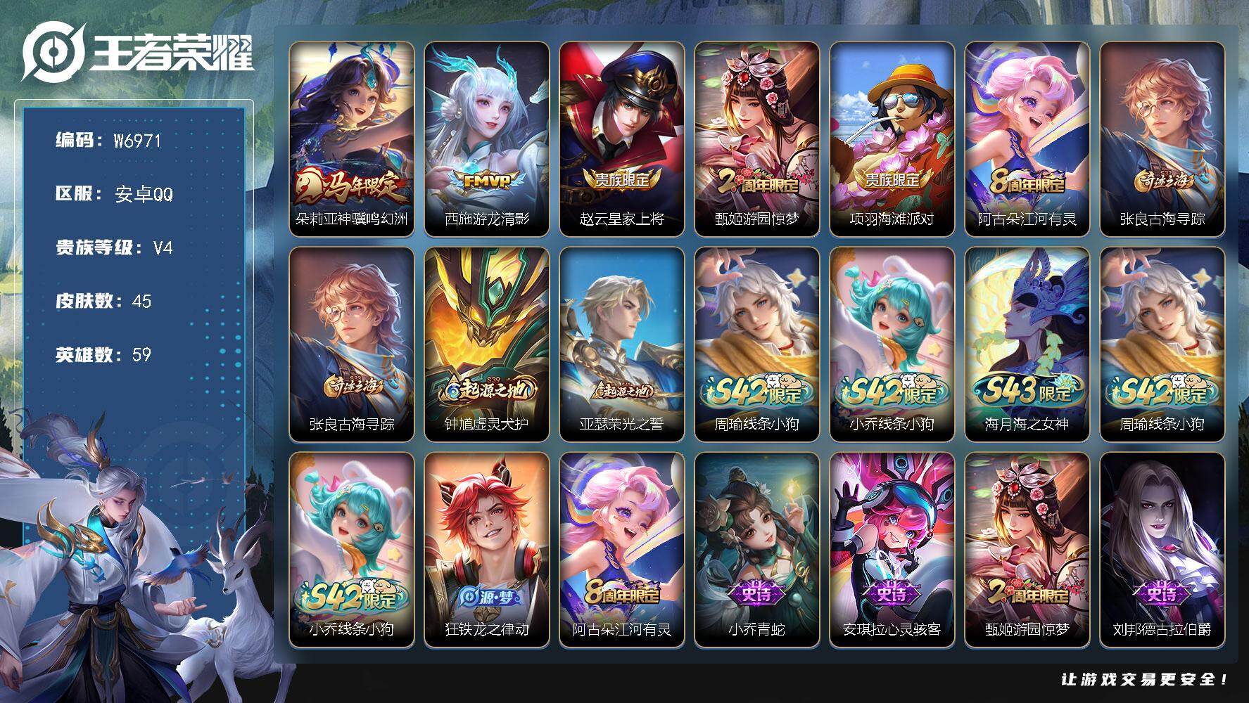 PX_2573857-【W6971】【亮点:354低场次开局妹子号-朵莉亚神骥鸣幻洲,西施游龙清影】安卓Q-不可二次-贵5-59英雄-45皮肤-2传说-18限定-4按键-贵族积分5977-营地ID:1635755399