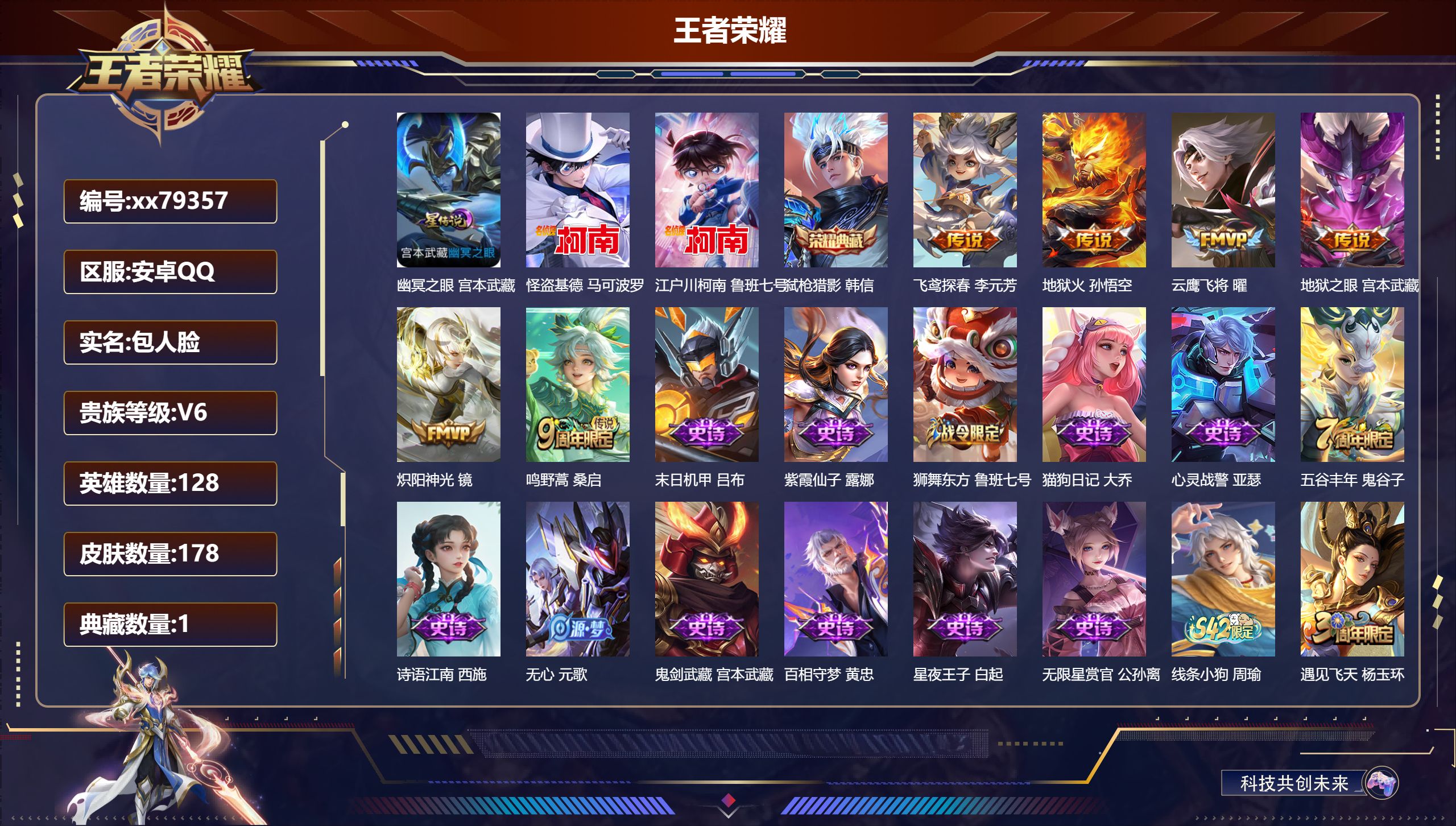 PX_2573076-,包人脸,V6,贵族积分14273,安卓QQ/178皮肤/128英雄/1典藏/0珍品无双/0无双/2珍品传说/6传说/60史诗/8稀有英雄,,对抗路33段,,打野30段,历史(省标典韦,) 【1,星传说皮肤】,幽冥之眼,宫本武藏, 【2,珍品传说】,怪盗基德,马可波罗,江户川柯南,鲁班七号, 【1,典藏皮肤】,弑枪猎影,韩信, 【6,传说皮肤】,飞鸢探春,李元芳,地狱火,孙悟空,云鹰飞将,曜,地狱之眼,宫本武藏,炽阳神光,镜,鸣野蒿,桑启, 【60,史诗皮肤】,末日机甲,吕布,紫霞仙子,露娜,狮舞东方,鲁班七号,猫狗日记,大乔,心灵战警,亚瑟,五谷丰年,鬼谷子,诗语江南,西施,无心,元歌,鬼剑武藏,宫本武藏,百相守梦,黄忠,星夜王子,白起,无限星赏官,公孙离,线条小狗,周瑜,遇见飞天,杨玉环,摇滚巨星,嬴政,电玩高手,狂铁,顽趣,梦奇,魅力维加斯,妲己,黄金分割率,诸葛亮,荣光圣徽,蒙恬,女仆咖啡,妲己,舞动绿茵,蔡文姬,鹰眼统帅,狄仁杰,李小龙,裴擒虎,纤云弄巧,云中君,金属风暴,墨子,特工魅影,百里守约,猫狗日记,孙策,原初追逐者,百里玄策,逐浪之夏,李元芳,未来纪元,赵云,灵蛊蚀心,扁鹊,黎明之约,雅典娜,魔术师,狄仁杰,皇家上将,赵云,功夫厨神,程咬金,电玩·爆裂旋风,刘禅,圣诞恋歌,貂蝉,水晶猎龙者,花木兰,破空之剑,亚连,心动手记,海诺,圣诞狂欢,吕布,青焰无极,镜,岱宗,典韦,永昼,夏洛特,地狱岩魂,廉颇,蔷薇恋人,孙尚香,冰雪圆舞曲,甄姬,月团寄思,沈梦溪,千年之狐,李白,节奏热浪,阿轲,曙光守护者,铠,万物之道,弈星,谪仙醉月,李白,绅士熊喵,刘禅,水果甜心,孙尚香,江河有灵,阿古朵,幽灵船长,曹操,乘风破浪,夏侯惇,暗隐猎兽者,兰陵王, 【84,勇者皮肤】,时空谍影,海诺,沙漠行僧,达摩,大漠名商,沈梦溪,缤纷绘卷,张良,拳王,达摩,功夫炙烤,廉颇,铁甲之心,典韦,沉稳之力,孙尚香,海盐诗旅,桑启,醍醐杖,老夫子,归虚梦演,孙膑,白色死神,白起,黄金武士,典韦,阴阳师,狄仁杰,次元突破,哪吒,古海寻踪,张良,戏梦巡演,空空儿,功夫老勺,老夫子,西部大镖客,牛魔,海滩派对,项羽,完美运算,后羿,万华元夜,狄仁杰,踏浪烽翎,莱西奥,演武夺筹,程咬金,野性能量,吕布,无双福将,程咬金,瓷语鉴心,露娜,百相守梦,影,原初探秘者,鬼谷子,潮玩探月行,猪八戒,天穹祈灯,鬼谷子,化身博士,扁鹊,五福同心,张飞,星际陆战队,程咬金,虹云星官,明世隐,赤刃凌霄,敖隐,死亡骑士,亚瑟,玩偶对对碰,安琪拉,掌控之力,诸葛亮,忍·炎影,赵云,雪境奇遇,西施,坚韧之力,苏烈,唤灵魔甲,刘禅,万事如意,刘备,擒涛扼浪,裴擒虎,溯影追猎,虞姬,极光幻客,蚩奼,探海日志,鲁班大师,龙腾万里,关羽,金庭之子,兰陵王,千军破阵,苏烈,荣光之誓,亚瑟,花好人间,甄姬,万象初新,宫本武藏,春野之旅,钟无艳,秘密基地,刘禅,教廷特使,韩信,街头霸王,韩信,云中旅人,李元芳,妄想特派,李元芳,进击墨子号,墨子,少女阿狸,妲己,蔚蓝守将,蒙恬,幻想奇妙夜,王昭君,驱傩正仪,钟馗,特工战影,狂铁,班班快跑,鲁班七号,劲辣红锅,太乙真人,神迹守卫,孙悟空,剑破天穹,刘邦,苍威无极,项羽,铁骨偃魂,典韦,熔金海岸,周瑜,苍林狼骑,苍,天穹之誓,姜子牙,魅影绮裳,影,星梦巡礼,姜子牙,谧流熔炉,太乙真人,暗都幽影,大司命,鹤鸣心笺,艾琳,锦麟游梦,庄周,逆浪荇歌,甄姬,线条小狗,周瑜,噬灭天穹,东皇太一, 【28,其他皮肤】,前尘,金蝉,三太子,哪吒,超能战警,曹操,花见巫女,伽罗,未来旅行,孙膑,第七人偶,干将莫邪,灼热之刃,李信,碧珀绯影,暃,魇语军师,司马懿,英喵野望,刘禅,午夜歌剧院,元歌,启蛰,司空震,霓裳曲,杨玉环,花间舞,公孙离,街头旋风,裴擒虎,修竹墨客,上官婉儿,埃及法老,杨戬,画中游,桑启,尼罗河女神,女娲,归虚梦演,曜,幸存者,马超,战争女神,雅典娜,创世神祝,盘古,特种部队,李元芳,孤猎,澜,赤焰之缨,云缨,怪盗基德,马可波罗,江户川柯南,鲁班七号, 【8,稀有英雄】,嬴政,不知火舞,橘右京,夏洛特,娜可露露,韩信,艾琳,赵云, 营地ID:,