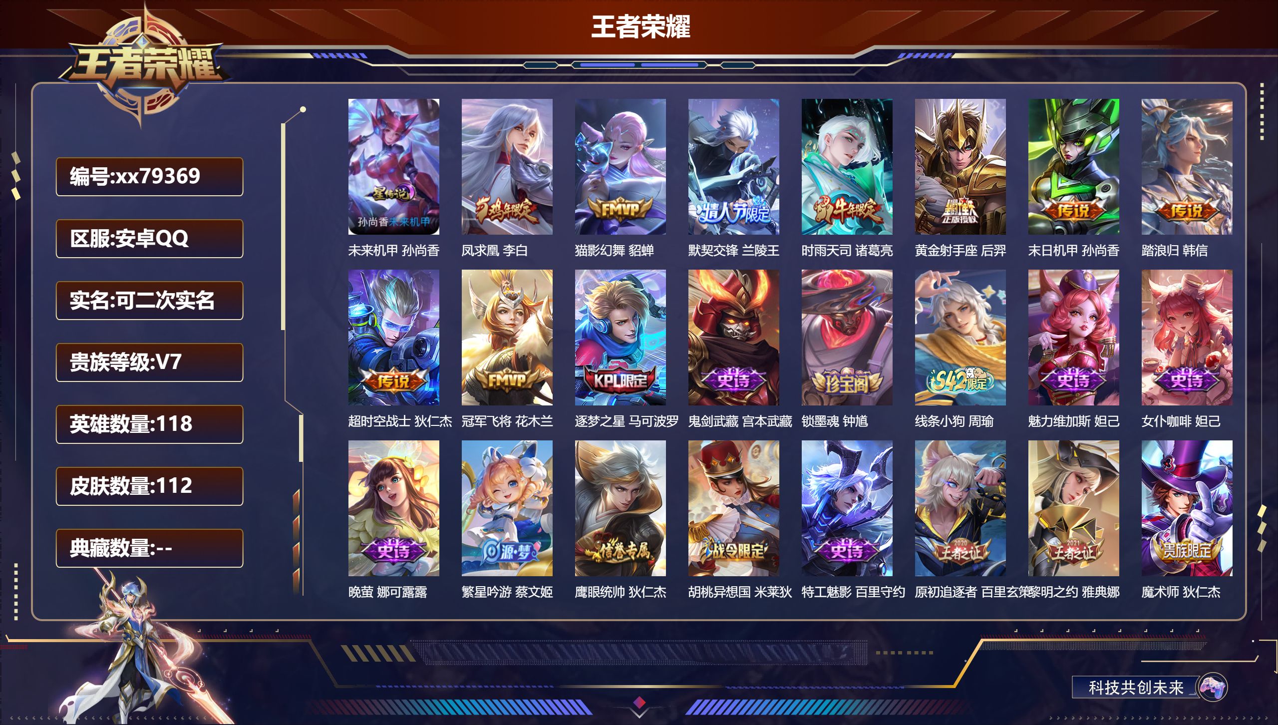 PX_2573080-,可二次,V7,贵族积分31795,安卓QQ/112皮肤/118英雄/0典藏/0珍品无双/0无双/0珍品传说/9传说/29史诗/7稀有英雄,历史(省标兰陵王) 【1,星传说皮肤】,未来机甲,孙尚香, 【9,传说皮肤】,凤求凰,李白,猫影幻舞,貂蝉,默契交锋,兰陵王,时雨天司,诸葛亮,黄金射手座,后羿,末日机甲,孙尚香,踏浪归,韩信,超时空战士,狄仁杰,冠军飞将,花木兰, 【29,史诗皮肤】,逐梦之星,马可波罗,鬼剑武藏,宫本武藏,锁墨魂,钟馗,线条小狗,周瑜,魅力维加斯,妲己,女仆咖啡,妲己,晚萤,娜可露露,繁星吟游,蔡文姬,鹰眼统帅,狄仁杰,胡桃异想国,米莱狄,特工魅影,百里守约,原初追逐者,百里玄策,黎明之约,雅典娜,魔术师,狄仁杰,热力回旋,百里玄策,皇家上将,赵云,梁祝,上官婉儿,水晶猎龙者,花木兰,魅语,不知火舞,群星魔术团,上官婉儿,天狼绘梦者,上官婉儿,白龙吟,韩信,星界战将,牛魔,青蛇,小乔,默契交锋,花木兰,节奏热浪,阿轲,水果甜心,孙尚香,幽灵船长,曹操,暗隐猎兽者,兰陵王, 【55,勇者皮肤】,圆桌骑士,盾山,星际陆战队,达摩,沙漠行僧,达摩,大漠名商,沈梦溪,缤纷绘卷,张良,海盐诗旅,桑启,朔风刀,夏侯惇,醍醐杖,老夫子,归虚梦演,孙膑,白色死神,白起,御旌,牛魔,阴阳师,狄仁杰,古海寻踪,张良,西部大镖客,牛魔,海滩派对,项羽,完美运算,后羿,万华元夜,狄仁杰,演武夺筹,程咬金,奇妙博物学,庄周,哥特玫瑰,露娜,守护之力,大乔,原初探秘者,鬼谷子,天穹祈灯,鬼谷子,疑决卦,明世隐,阿尔法小队,后羿,五福同心,张飞,死亡骑士,亚瑟,敏锐之力,李白,玩偶对对碰,安琪拉,掌控之力,诸葛亮,海滩丽影,钟无艳,忍·炎影,赵云,炽热元素使,姜子牙,坚韧之力,苏烈,万事如意,刘备,逐霄战戟,吕布,乓乓大师,鲁班大师,兔女郎,花木兰,龙腾万里,关羽,金庭之子,兰陵王,千军破阵,苏烈,零食大作战,姬小满,花好人间,甄姬,万象初新,宫本武藏,街头霸王,韩信,紫罗兰之誓,妲己,重装意志,盘古,混沌棋,弈星,幻想奇妙夜,王昭君,驱傩正仪,钟馗,剑破天穹,刘邦,天穹之誓,姜子牙,星梦巡礼,姜子牙,逆浪荇歌,甄姬,线条小狗,周瑜, 【20,其他皮肤】,伊势巫女,大乔,前尘,金蝉,芝加哥教父,黄忠,超能战警,曹操,万圣前夜,小乔,福禄兄弟,鲁班七号,精灵王,后羿,花间舞,公孙离,异域舞娘,貂蝉,街头旋风,裴擒虎,修竹墨客,上官婉儿,剑舞者,花木兰,归虚梦演,蒙犽,归虚梦演,西施,画中游,桑启,锦衣卫,狄仁杰,特种部队,李元芳,绝影神枪,百里守约,孤猎,澜,精准探案法,米莱狄, 【7,稀有英雄】,嬴政,不知火舞,橘右京,夏洛特,娜可露露,韩信,艾琳, 营地ID:,