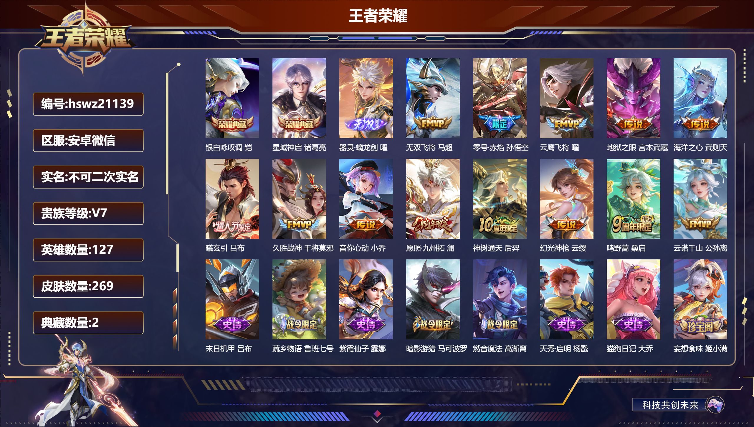 PX_2492575-Q/至尊星耀/78皮肤/89英雄/0典藏/0珍品无双/0无双/0珍品传说/9传说/28史诗/5稀有英雄 【9,传说皮肤】逐花归海,澜,神骥·逐星野,马超,地狱之眼,宫本武藏,炽阳神光,镜,战鼓燎原,典韦,淬星耀世,赵云,绛天战甲,铠,愿照·九州拓,澜,鸣野蒿,桑启, 【28,史诗皮肤】紫霞仙子,露娜,暗影游猎,马可波罗,天秀·启明,杨戬,鬼剑武藏,宫本武藏,线条小狗,周瑜,魅力维加斯,妲己,黄金分割率,诸葛亮,偶像歌手,王昭君,女仆咖啡,妲己,赏金猎手,澜,鹰眼统帅,狄仁杰,魔术师,狄仁杰,热力回旋,百里玄策,龙之律动,狂铁,皇家上将,赵云,水晶猎龙者,花木兰,圣诞狂欢,吕布,器灵·浮梦炉,赵怀真,茶境仙,孙膑,蔷薇恋人,孙尚香,心灵骇客,安琪拉,百相守梦,百里守约,线条小狗,小乔,水果甜心,孙尚香,化蝶舞,阿轲,绮世丹青,狄仁杰,幽灵船长,曹操,乘风破浪,夏侯惇, 【27,勇者皮肤】拳王,达摩,黄金武士,典韦,阴阳师,狄仁杰,海滩派对,项羽,舞狮寰,吕布,浪漫序章,刘备,破局者,亚连,掌控之力,诸葛亮,忍·炎影,赵云,雪境奇遇,西施,乓乓大师,鲁班大师,溯影追猎,虞姬,街头霸王,韩信,西部大镖客,孙悟空,虚灵犬护,钟馗,剑破天穹,刘邦,铁骨偃魂,典韦,苍林狼骑,苍,天穹之誓,姜子牙,访茗客,马超,谧流熔炉,太乙真人,线条小狗,周瑜,线条小狗,桑启,百相守梦,老夫子,噬灭天穹,东皇太一,玫蓝誓约,戈娅,景韶洛都,明世隐, 【16,其他皮肤】金属狂潮,高渐离,第七人偶,干将莫邪,灼热之刃,李信,福禄兄弟,鲁班七号,碧珀绯影,暃,星航指挥官,诸葛亮,午夜歌剧院,元歌,隐刃,兰陵王,占星师,明世隐,激情绿茵,马可波罗,归虚梦演,曜,幸存者,马超,创世神祝,盘古,孤猎,澜,露花倒影,嫦娥,西部大镖客,孙悟空, 【5,稀有英雄】橘右京,夏洛特,韩信,艾琳,赵云, 营地ID:,