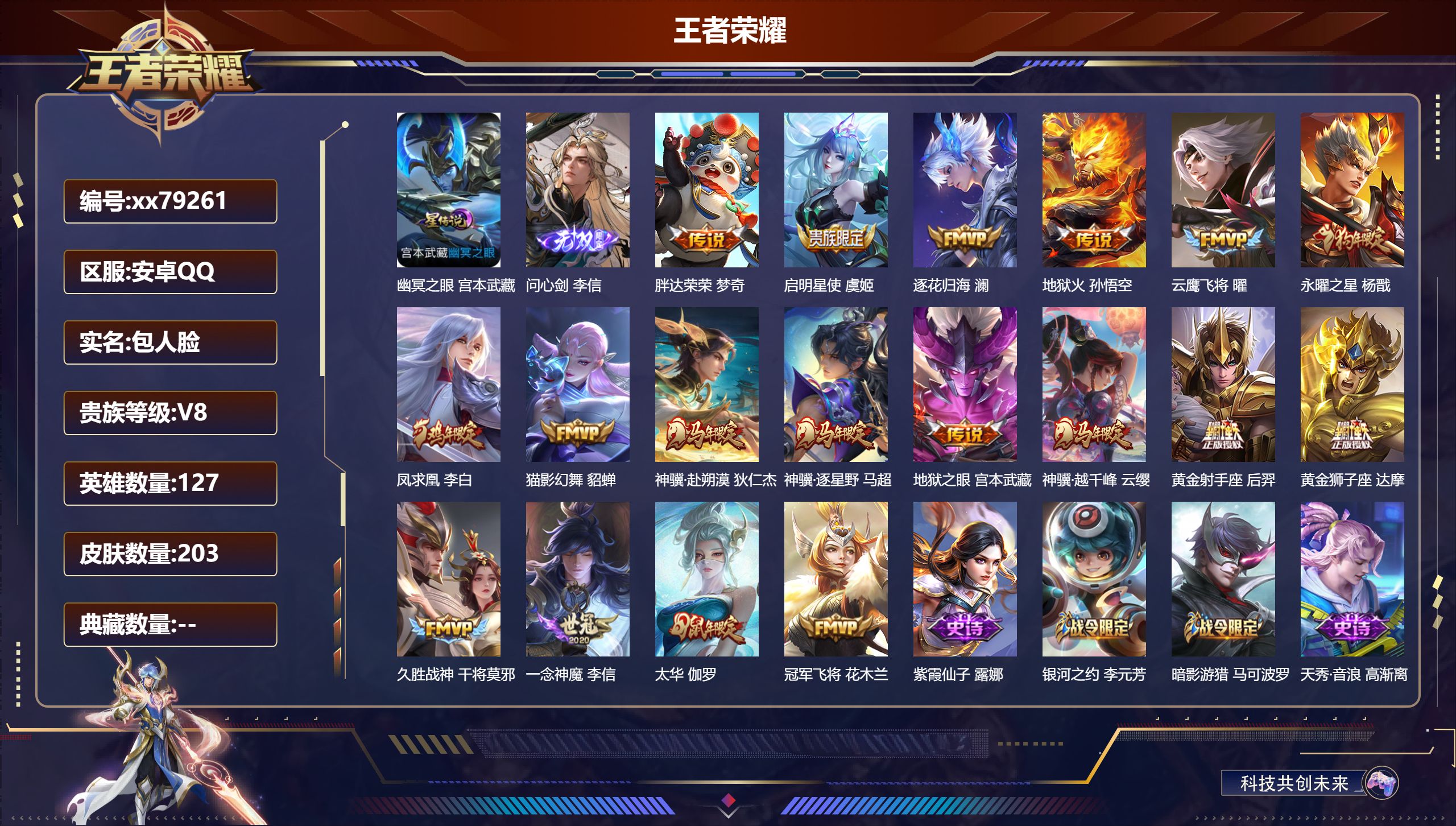 PX_2570934-,包人脸,V8,贵族积分63553,安卓QQ/203皮肤/127英雄/0典藏/0珍品无双/1无双/0珍品传说/18传说/55史诗/7稀有英雄 【1,星传说皮肤】,幽冥之眼,宫本武藏, 【1,无双皮肤】,问心剑,李信, 【18,传说皮肤】,胖达荣荣,梦奇,启明星使,虞姬,逐花归海,澜,地狱火,孙悟空,云鹰飞将,曜,永曜之星,杨戬,凤求凰,李白,猫影幻舞,貂蝉,神骥·赴朔漠,狄仁杰,神骥·逐星野,马超,地狱之眼,宫本武藏,神骥·越千峰,云缨,黄金射手座,后羿,黄金狮子座,达摩,久胜战神,干将莫邪,一念神魔,李信,太华,伽罗,冠军飞将,花木兰, 【55,史诗皮肤】,紫霞仙子,露娜,银河之约,李元芳,暗影游猎,马可波罗,天秀·音浪,高渐离,狮舞东方,鲁班七号,德古拉伯爵,刘邦,心灵战警,亚瑟,无心,元歌,鬼剑武藏,宫本武藏,百相守梦,黄忠,星夜王子,白起,无限星赏官,公孙离,线条小狗,周瑜,遇见飞天,杨玉环,冰锋战神,关羽,修罗,橘右京,拒霜思,嫦娥,魅力维加斯,妲己,黄金分割率,诸葛亮,偶像歌手,王昭君,舞动绿茵,蔡文姬,鹰眼统帅,狄仁杰,胡桃异想国,米莱狄,飞衡,韩信,李小龙,裴擒虎,纤云弄巧,云中君,驯魔猎人,兰陵王,龙骑士,墨子,特工魅影,百里守约,逐浪之夏,李元芳,魔术师,狄仁杰,龙之律动,狂铁,皇家上将,赵云,冰冠公主,雅典娜,辉光之辰,后羿,梁祝,上官婉儿,天才门将,刘禅,圣诞恋歌,貂蝉,白龙吟,韩信,岱宗,典韦,地狱岩魂,廉颇,冰雪圆舞曲,甄姬,千年之狐,李白,节奏热浪,阿轲,曙光守护者,铠,万灵启世,女娲,乱世虎臣,张飞,天狼征服者,曹操,天穹守望者,后羿,线条小狗,小乔,蓝屏警告,典韦,天狼狩猎者,裴擒虎,水果甜心,孙尚香,幽灵船长,曹操,乘风破浪,夏侯惇, 【82,勇者皮肤】,星际陆战队,达摩,沙漠行僧,达摩,缤纷绘卷,张良,拳王,达摩,大发明家,达摩,丁香结,小乔,沉稳之力,孙尚香,海盐诗旅,桑启,朔风刀,夏侯惇,醍醐杖,老夫子,朔望之晖,女娲,汉昭烈帝,刘备,白色死神,白起,黑桃队长,鲁班七号,黄金武士,典韦,阴阳师,狄仁杰,径山谋武,孙权,次元突破,哪吒,科学大爆炸,项羽,鲨炮海盗猫,沈梦溪,海滩派对,项羽,万华元夜,狄仁杰,演武夺筹,程咬金,红桃皇后,芈月,奇妙博物学,庄周,西部游侠,莱西奥,野性能量,吕布,哥特玫瑰,露娜,守护之力,大乔,瓷语鉴心,露娜,百相守梦,影,原初探秘者,鬼谷子,星空之诺,沈梦溪,西部大镖客,猪八戒,疑决卦,明世隐,化身博士,扁鹊,五福同心,张飞,次元傲视,杨戬,霸王丸,宫本武藏,雾影缉谜,兰陵王,舞狮寰,吕布,救世之瞳,扁鹊,赤刃凌霄,敖隐,赤莲之焰,周瑜,死亡骑士,亚瑟,掌控之力,诸葛亮,海滩丽影,钟无艳,忍·炎影,赵云,坚韧之力,苏烈,万事如意,刘备,乓乓大师,鲁班大师,溯影追猎,虞姬,极光幻客,蚩奼,玩趣恶龙,高渐离,兔女郎,花木兰,龙腾万里,关羽,罗小黑战记,哪吒,零食大作战,姬小满,荣光之誓,亚瑟,花好人间,甄姬,万象初新,宫本武藏,御銮,盾山,教廷特使,韩信,街头霸王,韩信,西部大镖客,孙悟空,少女阿狸,妲己,混沌棋,弈星,布丁狗之约,阿古朵,幻想奇妙夜,王昭君,驱傩正仪,钟馗,神迹守卫,钟馗,命运角斗场,狂铁,虚灵犬护,钟馗,魅影绮裳,影,星梦巡礼,姜子牙,谧流熔炉,太乙真人,鹤鸣心笺,艾琳,逆浪荇歌,甄姬,海之女神,海月,线条小狗,周瑜,爆裂喵拳,达摩,景韶洛都,明世隐, 【49,其他皮肤】,前尘,金蝉,战争骑士,夏侯惇,圣殿之光,刘邦,三太子,哪吒,棒球奇才,沈梦溪,龙域领主,铠,生化警戒,钟无艳,花见巫女,伽罗,爱与和平,苏烈,第七人偶,干将莫邪,万圣前夜,小乔,灼热之刃,李信,熊喵少女,阿古朵,海之征途,孙策,火炮千金,孙尚香,木偶奇遇记,鲁班七号,福禄兄弟,鲁班七号,精灵王,后羿,碧珀绯影,暃,星航指挥官,诸葛亮,魇语军师,司马懿,午夜歌剧院,元歌,启蛰,司空震,隐刃,兰陵王,异域舞娘,貂蝉,街头旋风,裴擒虎,归虚梦演,鲁班大师,东海龙王,东皇太一,修竹墨客,上官婉儿,维京掠夺者,苍,埃及法老,杨戬,年年有余,猪八戒,归虚梦演,曜,华尔街大亨,程咬金,威尼斯狂欢,百里玄策,幸存者,马超,神奇女侠,雅典娜,荷鲁斯之眼,云中君,创世神祝,盘古,特种部队,李元芳,绝影神枪,百里守约,蔷薇王座,蔡文姬,孤猎,澜,踏雪寻梅,弈星,秩序猎龙将,蒙恬,精灵公主,王昭君,露花倒影,嫦娥,地府判官,钟馗,西部大镖客,孙悟空, 【7,稀有英雄】,不知火舞,橘右京,夏洛特,娜可露露,韩信,艾琳,赵云, 营地ID:,