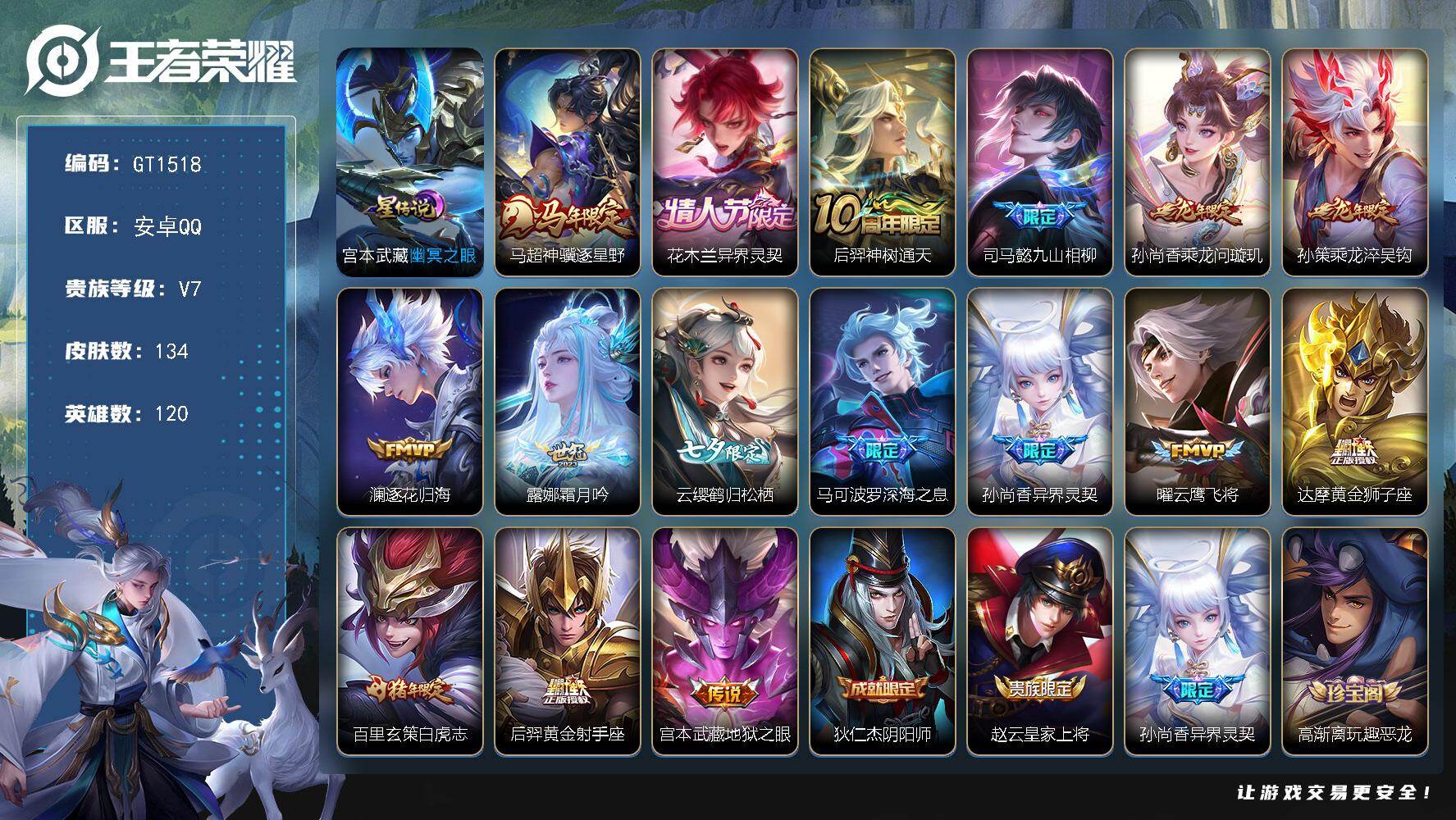 PX_2567547-40英雄-31皮肤-v6/非凡王者/40英雄/1珍品传说/8传说/11史诗/2稀有英雄 【1,珍品传说】沧流箭,伽罗, 【8,传说皮肤】飞鸢探春,李元芳,神骥·赴朔漠,狄仁杰,神骥·逐星野,马超,地狱之眼,宫本武藏,神骥·越千峰,云缨,炽阳神光,镜,山海·琳琅生,小乔,绛天战甲,铠, 【11,史诗皮肤】德古拉伯爵,刘邦,线条小狗,周瑜,魅力维加斯,妲己,热情桑巴,妲己,偶像歌手,王昭君,逐浪之夏,李元芳,魔术师,狄仁杰,皇家上将,赵云,龙胆,赵云,线条小狗,小乔,幽灵船长,曹操, 【9,勇者皮肤】径山谋武,孙权,海滩派对,项羽,阿尔法小队,后羿,舞狮寰,吕布,死亡骑士,亚瑟,玩偶对对碰,安琪拉,忍·炎影,赵云,班班快跑,鲁班七号,线条小狗,周瑜, 【3,其他皮肤】三太子,哪吒,龙域领主,铠,激情绿茵,马可波罗, 【2,稀有英雄】不知火舞,赵云, 营地ID: