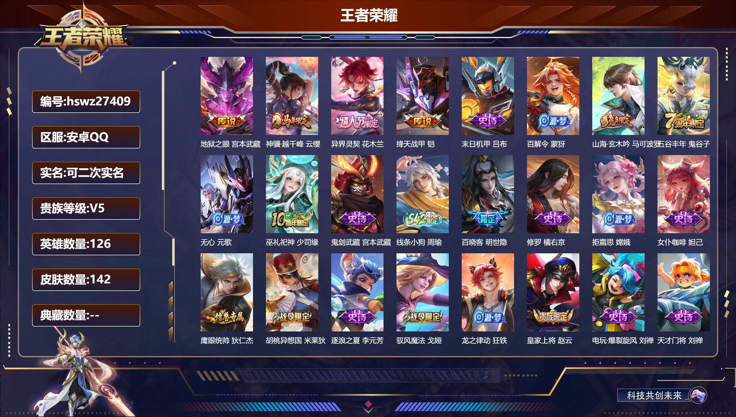 PX_2539701-Q/至尊星耀/152皮肤/126英雄/2典藏/0珍品无双/0无双/0珍品传说/4传说/33史诗/7稀有英雄 【2,典藏皮肤】天鹅之梦,小乔,九霄神辉,花木兰, 【4,传说皮肤】逐花归海,澜,久胜战神,干将莫邪,末日机甲,孙尚香,鸣野蒿,桑启, 【33,史诗皮肤】狮舞东方,鲁班七号,鬼剑武藏,宫本武藏,百相守梦,黄忠,线条小狗,周瑜,魅力维加斯,妲己,偶像歌手,王昭君,女仆咖啡,妲己,舞动绿茵,蔡文姬,繁星吟游,蔡文姬,鹰眼统帅,狄仁杰,李小龙,裴擒虎,纤云弄巧,云中君,金属风暴,墨子,特工魅影,百里守约,逐浪之夏,李元芳,魔术师,狄仁杰,龙之律动,狂铁,皇家上将,赵云,冰冠公主,雅典娜,至尊宝,孙悟空,梁祝,上官婉儿,天才门将,刘禅,圣诞恋歌,貂蝉,地狱岩魂,廉颇,冰雪圆舞曲,甄姬,千年之狐,李白,节奏热浪,阿轲,箭羽风息,伽罗,乱世虎臣,张飞,线条小狗,小乔,蓝屏警告,典韦,水果甜心,孙尚香,幽灵船长,曹操, 【77,勇者皮肤】圆桌骑士,盾山,拳王,达摩,大发明家,达摩,丁香结,小乔,功夫炙烤,廉颇,沉稳之力,孙尚香,海盐诗旅,桑启,朔风刀,夏侯惇,醍醐杖,老夫子,朔望之晖,女娲,归虚梦演,孙膑,汉昭烈帝,刘备,白色死神,白起,黄金武士,典韦,御旌,牛魔,阴阳师,狄仁杰,径山谋武,孙权,古海寻踪,张良,西部大镖客,牛魔,海滩派对,项羽,万华元夜,狄仁杰,克喵,鬼谷子,踏浪烽翎,莱西奥,奇妙博物学,庄周,西部游侠,莱西奥,野性能量,吕布,哥特玫瑰,露娜,原初探秘者,鬼谷子,潮玩探月行,猪八戒,天穹祈灯,鬼谷子,疑决卦,明世隐,化身博士,扁鹊,阿尔法小队,后羿,五福同心,张飞,幻乐之宴,鬼谷子,霸王丸,宫本武藏,虹云星官,明世隐,死亡骑士,亚瑟,敏锐之力,李白,幽兰居士,张良,玩偶对对碰,安琪拉,海滩丽影,钟无艳,坚韧之力,苏烈,万事如意,刘备,擒涛扼浪,裴擒虎,探海日志,鲁班大师,天使之翼,孙膑,玩趣恶龙,高渐离,兔女郎,花木兰,花好人间,甄姬,聚星闪耀,钟无艳,御銮,盾山,时尚教父,姜子牙,教廷特使,韩信,街头霸王,韩信,重装意志,盘古,少女阿狸,妲己,灵卜魔法,妲己,混沌棋,弈星,御霄,米莱狄,布丁狗之约,阿古朵,命运加冕,露娜,小满鸭,姬小满,幻想奇妙夜,王昭君,神迹守卫,钟馗,死霸装,白起,特工战影,狂铁,虚灵犬护,钟馗,御狮,狂铁,劲辣红锅,太乙真人,神迹守卫,孙悟空,熔金海岸,周瑜,天穹之誓,姜子牙,星梦巡礼,姜子牙,暗都幽影,大司命,逆浪荇歌,甄姬,线条小狗,周瑜, 【37,其他皮肤】伊势巫女,大乔,圣殿之光,刘邦,棒球奇才,沈梦溪,龙域领主,铠,生化警戒,钟无艳,第七人偶,干将莫邪,万圣前夜,小乔,灼热之刃,李信,木偶奇遇记,鲁班七号,精灵王,后羿,星航指挥官,诸葛亮,午夜歌剧院,元歌,霓裳曲,杨玉环,花间舞,公孙离,异域舞娘,貂蝉,东海龙王,东皇太一,修竹墨客,上官婉儿,范海辛,李白,激情绿茵,马可波罗,埃及法老,杨戬,阿摩司公爵,鬼谷子,尼罗河女神,女娲,归虚梦演,曜,威尼斯狂欢,百里玄策,战争女神,雅典娜,荷鲁斯之眼,云中君,创世神祝,盘古,绝影神枪,百里守约,蔷薇王座,蔡文姬,孤猎,澜,加勒比小姐,虞姬,踏雪寻梅,弈星,仙境爱丽丝,妲己,精灵公主,王昭君,露花倒影,嫦娥,美梦成真,梦奇,天启骑士,关羽, 【7,稀有英雄】不知火舞,橘右京,夏洛特,娜可露露,韩信,艾琳,赵云, 营地ID:,