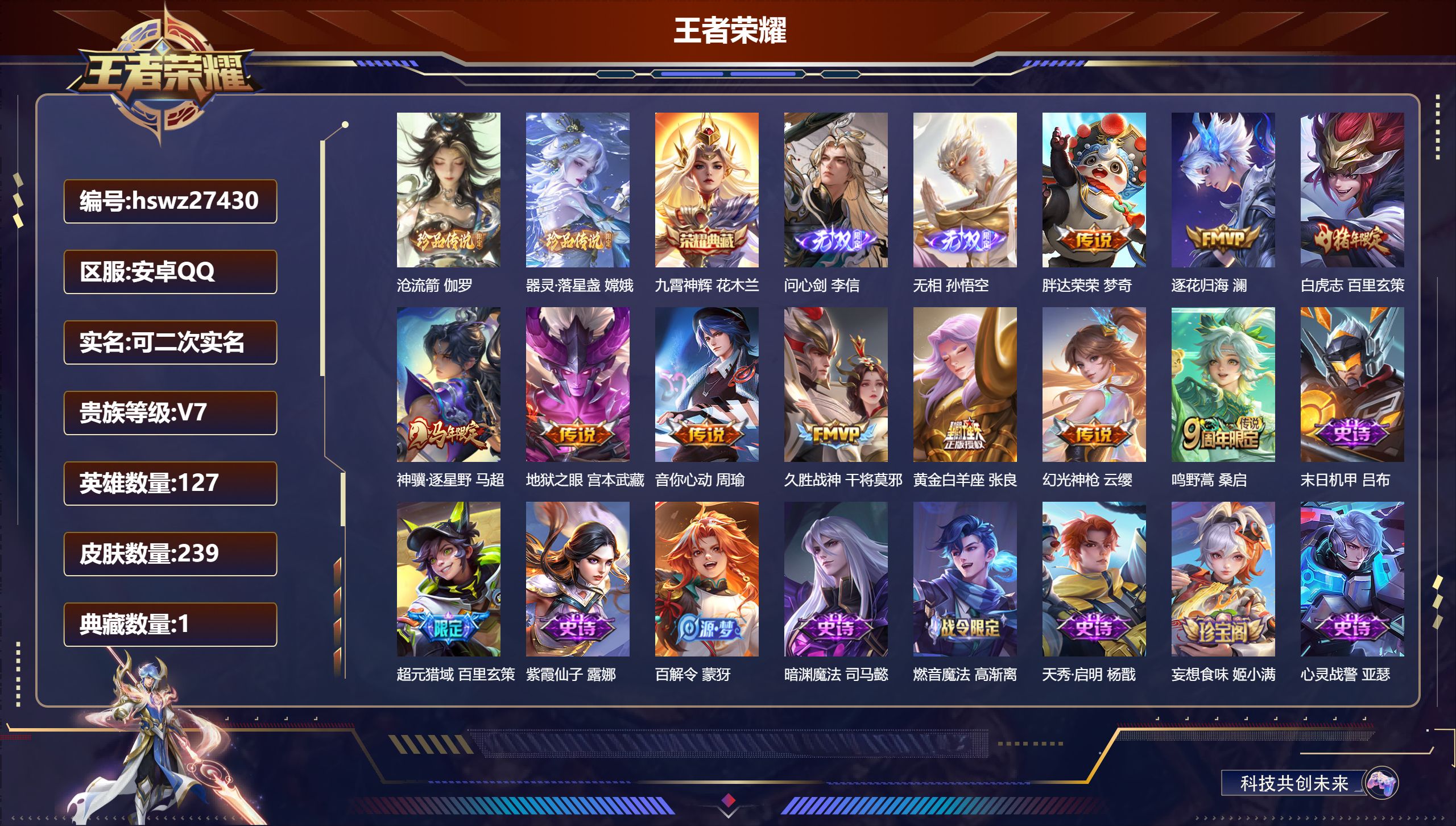 PX_2539683-Q/最强王者/239皮肤/127英雄/1典藏/0珍品无双/2无双/2珍品传说/10传说/73史诗/8稀有英雄 【2,珍品传说】沧流箭,伽罗,器灵·落星盏,嫦娥, 【1,典藏皮肤】九霄神辉,花木兰, 【2,无双皮肤】问心剑,李信,无相,孙悟空, 【10,传说皮肤】胖达荣荣,梦奇,逐花归海,澜,白虎志,百里玄策,神骥·逐星野,马超,地狱之眼,宫本武藏,音你心动,周瑜,久胜战神,干将莫邪,黄金白羊座,张良,幻光神枪,云缨,鸣野蒿,桑启, 【73,史诗皮肤】末日机甲,吕布,超元猎域,百里玄策,紫霞仙子,露娜,百解令,蒙犽,暗渊魔法,司马懿,燃音魔法,高渐离,天秀·启明,杨戬,妄想食味,姬小满,心灵战警,亚瑟,五谷丰年,鬼谷子,无心,元歌,巫礼祀神,少司缘,鬼剑武藏,宫本武藏,百相守梦,黄忠,星夜王子,白起,线条小狗,周瑜,撼世英歌,盘古,摇滚巨星,嬴政,修罗,橘右京,魅力维加斯,妲己,黄金分割率,诸葛亮,乐园奇幻夜,钟馗,偶像歌手,王昭君,荣光圣徽,蒙恬,女仆咖啡,妲己,晚萤,娜可露露,鹰眼统帅,狄仁杰,胡桃异想国,米莱狄,光弋星穹,莱西奥,纤云弄巧,云中君,金属风暴,墨子,特工魅影,百里守约,猫狗日记,孙策,逐浪之夏,李元芳,奇幻香踪,扁鹊,未来纪元,赵云,黎明之约,雅典娜,魔术师,狄仁杰,龙之律动,狂铁,皇家上将,赵云,至尊宝,孙悟空,功夫厨神,程咬金,电玩·爆裂旋风,刘禅,圣诞恋歌,貂蝉,水晶猎龙者,花木兰,涂山容容,公孙离,破空之剑,亚连,魅语,不知火舞,器灵·浮梦炉,赵怀真,星界战将,牛魔,地狱岩魂,廉颇,茶境仙,孙膑,冰雪圆舞曲,甄姬,航海奇遇记,老夫子,千年之狐,李白,节奏热浪,阿轲,织梦人,西施,曙光守护者,铠,万灵启世,女娲,心灵骇客,安琪拉,箭羽风息,伽罗,乱世虎臣,张飞,绅士熊喵,刘禅,缤纷独角兽,小乔,百相守梦,百里守约,线条小狗,小乔,时之恋人,孙尚香,水果甜心,孙尚香,化蝶舞,阿轲,江河有灵,阿古朵,幽灵船长,曹操,乘风破浪,夏侯惇,暗隐猎兽者,兰陵王, 【117,勇者皮肤】时空谍影,海诺,圆桌骑士,盾山,爱心护理,阿轲,沙漠行僧,达摩,大漠名商,沈梦溪,纽约教父,刘备,拳王,达摩,大发明家,达摩,龙舞盛年,沈梦溪,乐园追猎者,白起,丁香结,小乔,功夫炙烤,廉颇,海盐诗旅,桑启,幻泉雾影,海月,汉昭烈帝,刘备,白色死神,白起,黄金武士,典韦,阴阳师,狄仁杰,径山谋武,孙权,次元突破,哪吒,古海寻踪,张良,西部大镖客,牛魔,鲨炮海盗猫,沈梦溪,海滩派对,项羽,完美运算,后羿,克喵,鬼谷子,踏浪烽翎,莱西奥,红桃皇后,芈月,西部游侠,莱西奥,野性能量,吕布,无双福将,程咬金,原初探秘者,鬼谷子,潮玩探月行,猪八戒,鸿运当头,亚瑟,天穹祈灯,鬼谷子,疑决卦,明世隐,阿尔法小队,后羿,五福同心,张飞,金色潮汐,朵莉亚,幻乐之宴,鬼谷子,潮玩牛仔,马可波罗,赤刃凌霄,敖隐,潮玩骑兵,杨戬,死亡骑士,亚瑟,浪漫序章,刘备,危途狂花,戈娅,掌控之力,诸葛亮,海滩丽影,钟无艳,忍·炎影,赵云,雪境奇遇,西施,坚韧之力,苏烈,唤灵魔甲,刘禅,万事如意,刘备,擒涛扼浪,裴擒虎,乓乓大师,鲁班大师,溯影追猎,虞姬,极光幻客,蚩奼,探海日志,鲁班大师,女武神,艾琳,雾都夜雨,干将莫邪,兔女郎,花木兰,龙腾万里,关羽,金庭之子,兰陵王,未来纪元,宫本武藏,罗小黑战记,哪吒,往忆晖光,明世隐,零食大作战,姬小满,荣光之誓,亚瑟,花好人间,甄姬,聚星闪耀,钟无艳,御銮,盾山,时尚教父,姜子牙,春野之旅,钟无艳,教廷特使,韩信,街头霸王,韩信,云中旅人,李元芳,妄想特派,李元芳,西部大镖客,孙悟空,少女阿狸,妲己,灵卜魔法,妲己,混沌棋,弈星,蔚蓝守将,蒙恬,布丁狗之约,阿古朵,命运加冕,露娜,小满鸭,姬小满,灵野札记,张良,死霸装,白起,特工战影,狂铁,虚灵犬护,钟馗,白执事,赵云,劲辣红锅,太乙真人,神迹守卫,孙悟空,罗小黑战记,张良,剑破天穹,刘邦,铁骨偃魂,典韦,熔金海岸,周瑜,苍林狼骑,苍,天穹之誓,姜子牙,魅影绮裳,影,访茗客,马超,星梦巡礼,姜子牙,破阵·退雄兵,杨戬,谧流熔炉,太乙真人,暗都幽影,大司命,鹤鸣心笺,艾琳,线条小狗,妲己,锦麟游梦,庄周,云械蓝图,云中君,逆浪荇歌,甄姬,线条小狗,周瑜,百相守梦,老夫子,噬灭天穹,东皇太一,灵卦秘语,少司缘,敬我三分,盘古,爆裂喵拳,达摩,玫蓝誓约,戈娅,景韶洛都,明世隐, 【38,其他皮肤】沧流箭,伽罗,伊势巫女,大乔,金属狂潮,高渐离,前尘,金蝉,芝加哥教父,黄忠,潮流仙人,老夫子,三太子,哪吒,棒球奇才,沈梦溪,龙域领主,铠,超能战警,曹操,灼热之刃,李信,熊喵少女,阿古朵,海之征途,孙策,木偶奇遇记,鲁班七号,精灵王,后羿,绯红之刃,露娜,海军大将,周瑜,魇语军师,司马懿,启蛰,司空震,异域舞娘,貂蝉,街头旋风,裴擒虎,归虚梦演,鲁班大师,修竹墨客,上官婉儿,剑舞者,花木兰,范海辛,李白,占星师,明世隐,激情绿茵,马可波罗,尼罗河女神,女娲,归虚梦演,曜,幸存者,马超,特种部队,李元芳,森,瑶,孤猎,澜,赤焰之缨,云缨,露花倒影,嫦娥,美梦成真,梦奇,西部大镖客,孙悟空,器灵·落星盏,嫦娥, 【8,稀有英雄】敖隐,不知火舞,橘右京,夏洛特,娜可露露,韩信,艾琳,赵云, 营地ID:,