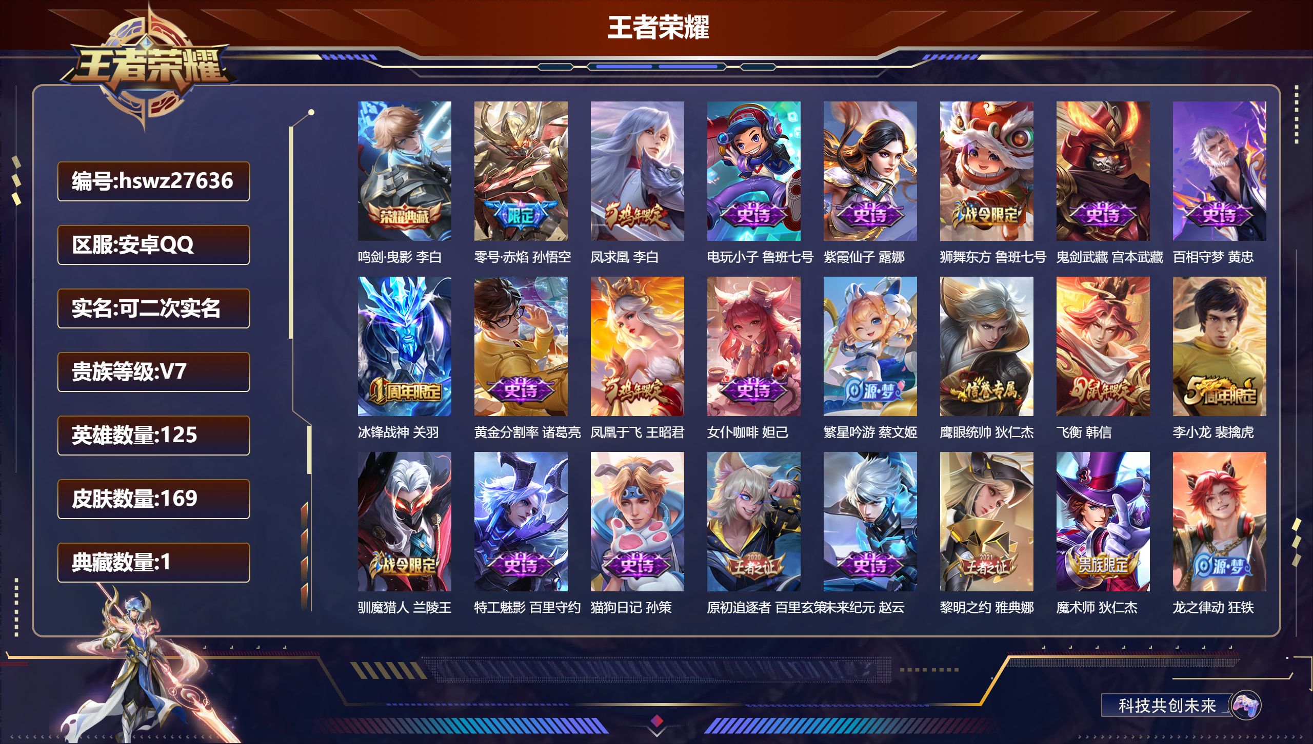 PX_2543531-Q/尊贵铂金/169皮肤/125英雄/1典藏/0珍品无双/0无双/0珍品传说/2传说/37史诗/8稀有英雄 【1,典藏皮肤】鸣剑·曳影,李白, 【2,传说皮肤】零号·赤焰,孙悟空,凤求凰,李白, 【37,史诗皮肤】电玩小子,鲁班七号,紫霞仙子,露娜,狮舞东方,鲁班七号,鬼剑武藏,宫本武藏,百相守梦,黄忠,冰锋战神,关羽,黄金分割率,诸葛亮,凤凰于飞,王昭君,女仆咖啡,妲己,繁星吟游,蔡文姬,鹰眼统帅,狄仁杰,飞衡,韩信,李小龙,裴擒虎,驯魔猎人,兰陵王,特工魅影,百里守约,猫狗日记,孙策,原初追逐者,百里玄策,未来纪元,赵云,黎明之约,雅典娜,魔术师,狄仁杰,龙之律动,狂铁,皇家上将,赵云,功夫厨神,程咬金,梁祝,上官婉儿,圣诞恋歌,貂蝉,云间偶戏,元歌,水晶猎龙者,花木兰,涂山容容,公孙离,圣诞狂欢,吕布,魅语,不知火舞,千年之狐,李白,曙光守护者,铠,心灵骇客,安琪拉,水果甜心,孙尚香,狂想玩偶喵,蒙犽,乘风破浪,夏侯惇,暗隐猎兽者,兰陵王, 【92,勇者皮肤】胡桃夹子,干将莫邪,圆桌骑士,盾山,烛龙,曹操,爱心护理,阿轲,沙漠行僧,达摩,缤纷绘卷,张良,纽约教父,刘备,拳王,达摩,大发明家,达摩,龙舞盛年,沈梦溪,丁香结,小乔,功夫炙烤,廉颇,铁甲之心,典韦,沉稳之力,孙尚香,海盐诗旅,桑启,朔风刀,夏侯惇,醍醐杖,老夫子,归虚梦演,孙膑,白色死神,白起,黑桃队长,鲁班七号,黄金武士,典韦,御旌,牛魔,阴阳师,狄仁杰,次元突破,哪吒,古海寻踪,张良,戏梦巡演,空空儿,功夫老勺,老夫子,鲨炮海盗猫,沈梦溪,海滩派对,项羽,万华元夜,狄仁杰,克喵,鬼谷子,踏浪烽翎,莱西奥,演武夺筹,程咬金,野性能量,吕布,哥特玫瑰,露娜,守护之力,大乔,无双福将,程咬金,原初探秘者,鬼谷子,潮玩探月行,猪八戒,天穹祈灯,鬼谷子,疑决卦,明世隐,化身博士,扁鹊,潮玩骑士王,亚瑟,五福同心,张飞,幻乐之宴,鬼谷子,霸王丸,宫本武藏,虹云星官,明世隐,赤莲之焰,周瑜,敏锐之力,李白,海滩丽影,钟无艳,忍·炎影,赵云,狰,白起,重明,芈月,坚韧之力,苏烈,万事如意,刘备,乓乓大师,鲁班大师,妖精王,孙膑,天使之翼,孙膑,兔女郎,花木兰,龙腾万里,关羽,未来纪元,宫本武藏,千军破阵,苏烈,花好人间,甄姬,万象初新,宫本武藏,御銮,盾山,单词大作战,雅典娜,秘密基地,刘禅,穷奇,典韦,教廷特使,韩信,街头霸王,韩信,云中旅人,李元芳,西部大镖客,孙悟空,凯尔特女王,虞姬,少女阿狸,妲己,混沌棋,弈星,御霄,米莱狄,春野闲踪,苏烈,布丁狗之约,阿古朵,命运加冕,露娜,小满鸭,姬小满,幻想奇妙夜,王昭君,灵野札记,张良,驱傩正仪,钟馗,神迹守卫,钟馗,命运角斗场,狂铁,死霸装,白起,虚灵犬护,钟馗,御狮,狂铁,饕餮,太乙真人,星梦巡礼,姜子牙,锦麟游梦,庄周,逆浪荇歌,甄姬, 【38,其他皮肤】伊势巫女,大乔,前尘,金蝉,战争骑士,夏侯惇,芝加哥教父,黄忠,棒球奇才,沈梦溪,死神来了,曹操,花见巫女,伽罗,爱与和平,苏烈,第七人偶,干将莫邪,灼热之刃,李信,熊喵少女,阿古朵,精灵王,后羿,碧珀绯影,暃,魇语军师,司马懿,午夜歌剧院,元歌,启蛰,司空震,隐刃,兰陵王,花间舞,公孙离,街头旋风,裴擒虎,归虚梦演,鲁班大师,剑舞者,花木兰,范海辛,李白,维京掠夺者,苍,归虚梦演,蒙犽,激情绿茵,马可波罗,埃及法老,杨戬,归虚梦演,曜,华尔街大亨,程咬金,威尼斯狂欢,百里玄策,幸存者,马超,战争女神,雅典娜,绝影神枪,百里守约,孤猎,澜,秩序猎龙将,蒙恬,赤焰之缨,云缨,美梦成真,梦奇,天启骑士,关羽,西部大镖客,孙悟空, 【8,稀有英雄】嬴政,不知火舞,橘右京,夏洛特,娜可露露,韩信,艾琳,赵云, 营地ID:,
