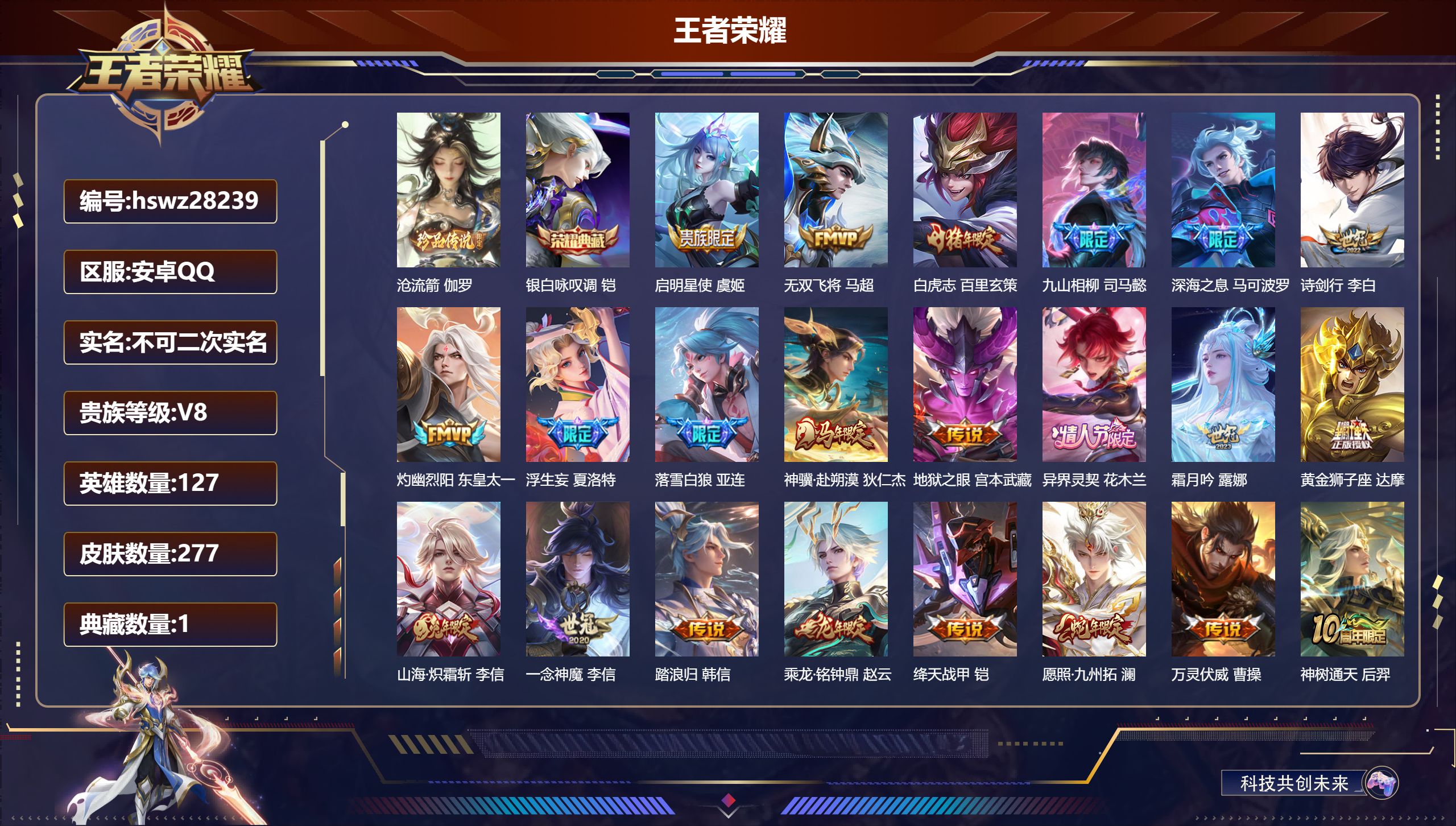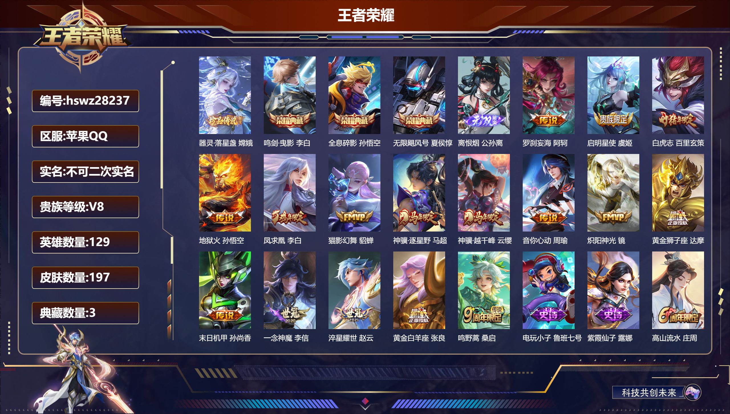 PX_2557847-Q/至尊星耀/197皮肤/129英雄/3典藏/0珍品无双/1无双/1珍品传说/16传说/43史诗/9稀有英雄 【1,珍品传说】器灵·落星盏,嫦娥, 【3,典藏皮肤】鸣剑·曳影,李白,全息碎影,孙悟空,无限飓风号,夏侯惇, 【1,无双皮肤】离恨烟,公孙离, 【16,传说皮肤】罗刹妄海,阿轲,启明星使,虞姬,白虎志,百里玄策,地狱火,孙悟空,凤求凰,李白,猫影幻舞,貂蝉,神骥·逐星野,马超,神骥·越千峰,云缨,音你心动,周瑜,炽阳神光,镜,黄金狮子座,达摩,末日机甲,孙尚香,一念神魔,李信,淬星耀世,赵云,黄金白羊座,张良,鸣野蒿,桑启, 【43,史诗皮肤】电玩小子,鲁班七号,紫霞仙子,露娜,高山流水,庄周,银河之约,李元芳,五谷丰年,鬼谷子,无心,元歌,鬼剑武藏,宫本武藏,线条小狗,周瑜,魅力维加斯,妲己,黄金分割率,诸葛亮,女仆咖啡,妲己,舞动绿茵,蔡文姬,鹰眼统帅,狄仁杰,大圣娶亲,孙悟空,李小龙,裴擒虎,金属风暴,墨子,傲雪梅枪,韩信,特工魅影,百里守约,原初追逐者,百里玄策,逐浪之夏,李元芳,未来纪元,赵云,黎明之约,雅典娜,魔术师,狄仁杰,皇家上将,赵云,冰冠公主,雅典娜,功夫厨神,程咬金,梁祝,上官婉儿,云间偶戏,元歌,水晶猎龙者,花木兰,圣诞狂欢,吕布,魅语,不知火舞,白龙吟,韩信,地狱岩魂,廉颇,冰雪圆舞曲,甄姬,默契交锋,花木兰,千年之狐,李白,节奏热浪,阿轲,曙光守护者,铠,绅士熊喵,刘禅,水果甜心,孙尚香,狂想玩偶喵,蒙犽,幽灵船长,曹操,暗隐猎兽者,兰陵王, 【90,勇者皮肤】爱心护理,阿轲,沙漠行僧,达摩,大漠名商,沈梦溪,缤纷绘卷,张良,纽约教父,刘备,拳王,达摩,大发明家,达摩,龙舞盛年,沈梦溪,丁香结,小乔,功夫炙烤,廉颇,海盐诗旅,桑启,幻泉雾影,海月,朔风刀,夏侯惇,醍醐杖,老夫子,归虚梦演,孙膑,汉昭烈帝,刘备,黄金武士,典韦,御旌,牛魔,阴阳师,狄仁杰,炼金王,扁鹊,次元突破,哪吒,牛运亨通,牛魔,功夫老勺,老夫子,鲨炮海盗猫,沈梦溪,海滩派对,项羽,万华元夜,狄仁杰,演武夺筹,程咬金,红桃皇后,芈月,野性能量,吕布,哥特玫瑰,露娜,无双福将,程咬金,瓷语鉴心,露娜,百相守梦,影,原初探秘者,鬼谷子,星空之诺,沈梦溪,潮玩探月行,猪八戒,疑决卦,明世隐,化身博士,扁鹊,潮玩骑士王,亚瑟,阿尔法小队,后羿,五福同心,张飞,次元傲视,杨戬,幻乐之宴,鬼谷子,霸王丸,宫本武藏,虹云星官,明世隐,赤刃凌霄,敖隐,死亡骑士,亚瑟,敏锐之力,李白,危途狂花,戈娅,玩偶对对碰,安琪拉,掌控之力,诸葛亮,海滩丽影,钟无艳,忍·炎影,赵云,狰,白起,重明,芈月,炽热元素使,姜子牙,坚韧之力,苏烈,万事如意,刘备,女武神,艾琳,天使之翼,孙膑,兔女郎,花木兰,龙腾万里,关羽,金庭之子,兰陵王,千军破阵,苏烈,花好人间,甄姬,万象初新,宫本武藏,御銮,盾山,单词大作战,雅典娜,秘密基地,刘禅,穷奇,典韦,教廷特使,韩信,街头霸王,韩信,云中旅人,李元芳,西部大镖客,孙悟空,凯尔特女王,虞姬,少女阿狸,妲己,混沌棋,弈星,御霄,米莱狄,幻想奇妙夜,王昭君,驱傩正仪,钟馗,特工战影,狂铁,御狮,狂铁,剑破天穹,刘邦,苍威无极,项羽,天穹之誓,姜子牙,星梦巡礼,姜子牙,海之女神,海月,线条小狗,周瑜,噬灭天穹,东皇太一,怪诞之夜,米莱狄, 【46,其他皮肤】芝加哥教父,黄忠,潮流仙人,老夫子,三太子,哪吒,棒球奇才,沈梦溪,龙域领主,铠,超能战警,曹操,花见巫女,伽罗,爱与和平,苏烈,万圣前夜,小乔,木偶奇遇记,鲁班七号,福禄兄弟,鲁班七号,帝国元帅,项羽,精灵王,后羿,冰刃幻境,镜,魇语军师,司马懿,启蛰,司空震,隐刃,兰陵王,霓裳曲,杨玉环,花间舞,公孙离,异域舞娘,貂蝉,街头旋风,裴擒虎,归虚梦演,鲁班大师,东海龙王,东皇太一,修竹墨客,上官婉儿,剑舞者,花木兰,范海辛,李白,归虚梦演,蒙犽,激情绿茵,马可波罗,埃及法老,杨戬,画中游,桑启,尼罗河女神,女娲,一千零一夜,张良,归虚梦演,曜,威尼斯狂欢,百里玄策,特种部队,李元芳,绝影神枪,百里守约,蔷薇王座,蔡文姬,森,瑶,孤猎,澜,加勒比小姐,虞姬,精准探案法,米莱狄,精灵公主,王昭君,赤焰之缨,云缨,地府判官,钟馗,西部大镖客,孙悟空,器灵·落星盏,嫦娥, 【9,稀有英雄】敖隐,嬴政,不知火舞,橘右京,夏洛特,娜可露露,韩信,艾琳,赵云, 营地ID:,