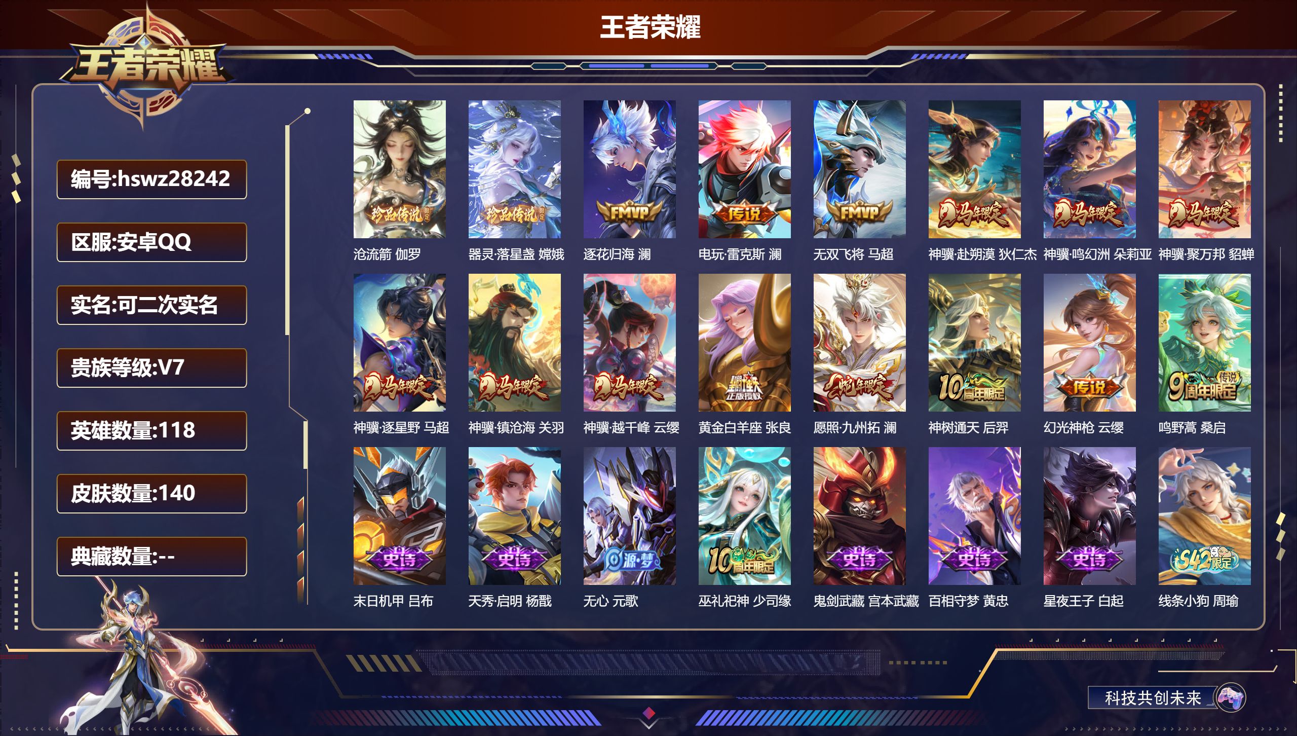 PX_2557862-Q/至尊星耀/140皮肤/118英雄/0典藏/0珍品无双/0无双/2珍品传说/14传说/40史诗/9稀有英雄 【2,珍品传说】沧流箭,伽罗,器灵·落星盏,嫦娥, 【14,传说皮肤】逐花归海,澜,电玩·雷克斯,澜,无双飞将,马超,神骥·赴朔漠,狄仁杰,神骥·鸣幻洲,朵莉亚,神骥·聚万邦,貂蝉,神骥·逐星野,马超,神骥·镇沧海,关羽,神骥·越千峰,云缨,黄金白羊座,张良,愿照·九州拓,澜,神树通天,后羿,幻光神枪,云缨,鸣野蒿,桑启, 【40,史诗皮肤】末日机甲,吕布,天秀·启明,杨戬,无心,元歌,巫礼祀神,少司缘,鬼剑武藏,宫本武藏,百相守梦,黄忠,星夜王子,白起,线条小狗,周瑜,百晓客,明世隐,摇滚巨星,嬴政,苍鳞隐世,白起,偶像歌手,王昭君,赏金猎手,澜,鹰眼统帅,狄仁杰,傩神司,兰陵王,光弋星穹,莱西奥,猫狗日记,孙策,真我赫兹,百里守约,未来纪元,赵云,时之彼端,妲己,石田雨龙,后羿,魔术师,狄仁杰,龙之律动,狂铁,皇家上将,赵云,圣诞恋歌,貂蝉,器灵·浮梦炉,赵怀真,冰雪圆舞曲,甄姬,千年之狐,李白,曙光守护者,铠,万灵启世,女娲,箭羽风息,伽罗,乱世虎臣,张飞,百相守梦,周瑜,万物之道,弈星,星界特工,马可波罗,线条小狗,小乔,水果甜心,孙尚香,狼魂孤将,苍,乘风破浪,夏侯惇,暗隐猎兽者,兰陵王, 【64,勇者皮肤】太极少年,赵怀真,缤纷绘卷,张良,拳王,达摩,沉稳之力,孙尚香,白色死神,白起,黄金武士,典韦,阴阳师,狄仁杰,径山谋武,孙权,戏梦巡演,空空儿,海滩派对,项羽,完美运算,后羿,踏浪烽翎,莱西奥,百相守梦,影,天穹祈灯,鬼谷子,阿尔法小队,后羿,潮玩牛仔,马可波罗,救世之瞳,扁鹊,赤刃凌霄,敖隐,死亡骑士,亚瑟,敏锐之力,李白,危途狂花,戈娅,忍·炎影,赵云,雪境奇遇,西施,苍云破阵,蒙恬,糖果风暴,安琪拉,逐霄之志,曹操,溯影追猎,虞姬,极光幻客,蚩奼,天使之翼,孙膑,雾都夜雨,干将莫邪,未来纪元,宫本武藏,罗小黑战记,哪吒,往忆晖光,明世隐,荣光之誓,亚瑟,时尚教父,姜子牙,教廷特使,韩信,云中旅人,李元芳,紫罗兰之誓,妲己,少女阿狸,妲己,蔚蓝守将,蒙恬,布丁狗之约,阿古朵,小满鸭,姬小满,灵野札记,张良,死霸装,白起,虚灵犬护,钟馗,罗小黑战记,张良,剑破天穹,刘邦,异域游侠,刘备,铁骨偃魂,典韦,苍林狼骑,苍,天穹之誓,姜子牙,谧流熔炉,太乙真人,暗都幽影,大司命,鹤鸣心笺,艾琳,线条小狗,妲己,锦麟游梦,庄周,逆浪荇歌,甄姬,百相守梦,孙策,海之女神,海月,线条小狗,周瑜,线条小狗,桑启,噬灭天穹,东皇太一,灵卦秘语,少司缘,敬我三分,盘古, 【23,其他皮肤】沧流箭,伽罗,金属狂潮,高渐离,灼热之刃,李信,海之征途,孙策,冰刃幻境,镜,碧珀绯影,暃,星航指挥官,诸葛亮,魇语军师,司马懿,霓裳曲,杨玉环,花间舞,公孙离,街头旋风,裴擒虎,归虚梦演,鲁班大师,维京掠夺者,苍,年年有余,猪八戒,归虚梦演,曜,威尼斯狂欢,百里玄策,幸存者,马超,森,瑶,孤猎,澜,踏雪寻梅,弈星,赤焰之缨,云缨,地府判官,钟馗,器灵·落星盏,嫦娥, 【9,稀有英雄】敖隐,嬴政,不知火舞,橘右京,夏洛特,娜可露露,韩信,艾琳,赵云, 营地ID:,