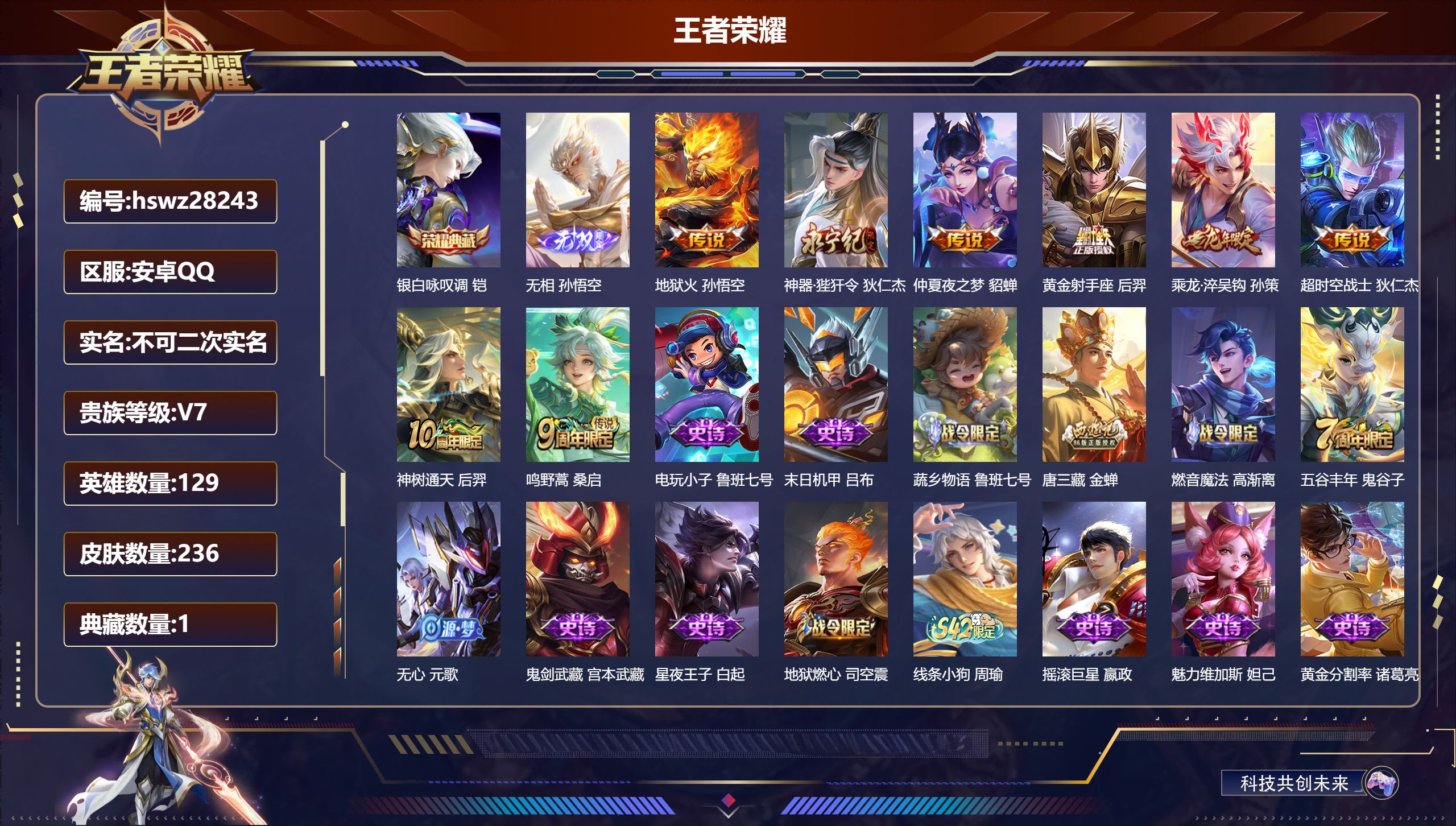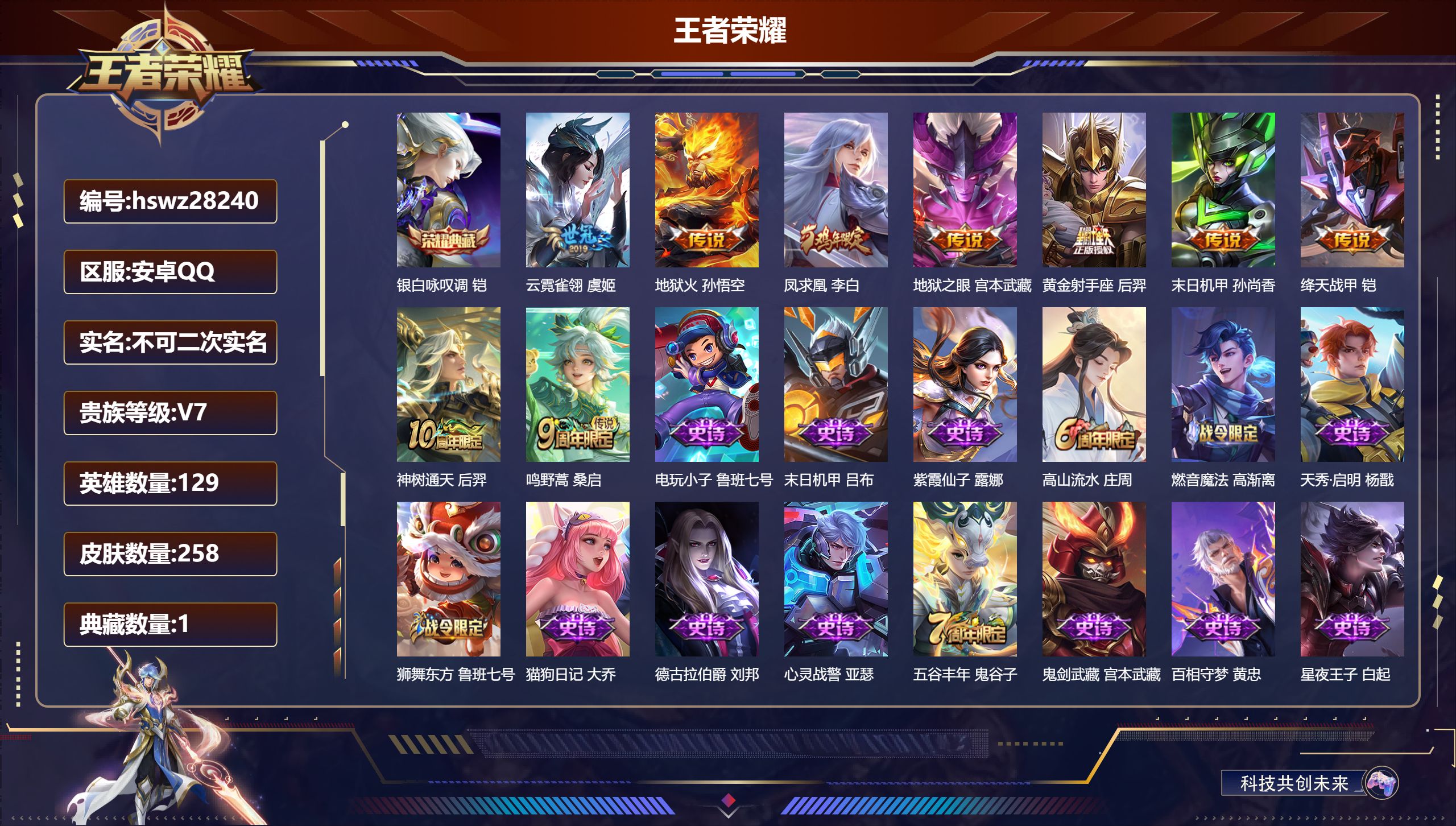 PX_2557867-Q/至尊星耀/236皮肤/129英雄/1典藏/0珍品无双/1无双/0珍品传说/8传说/53史诗/9稀有英雄 【1,典藏皮肤】银白咏叹调,铠, 【1,无双皮肤】无相,孙悟空, 【8,传说皮肤】地狱火,孙悟空,神器·狴犴令,狄仁杰,仲夏夜之梦,貂蝉,黄金射手座,后羿,乘龙·淬吴钩,孙策,超时空战士,狄仁杰,神树通天,后羿,鸣野蒿,桑启, 【53,史诗皮肤】电玩小子,鲁班七号,末日机甲,吕布,蔬乡物语,鲁班七号,唐三藏,金蝉,燃音魔法,高渐离,五谷丰年,鬼谷子,无心,元歌,鬼剑武藏,宫本武藏,星夜王子,白起,地狱燃心,司空震,线条小狗,周瑜,摇滚巨星,嬴政,魅力维加斯,妲己,黄金分割率,诸葛亮,偶像歌手,王昭君,猪悟能,猪八戒,舞动绿茵,蔡文姬,繁星吟游,蔡文姬,鹰眼统帅,狄仁杰,孙行者,孙悟空,傩神司,兰陵王,李小龙,裴擒虎,光弋星穹,莱西奥,纤云弄巧,云中君,如梦令,后羿,金属风暴,墨子,特工魅影,百里守约,猫狗日记,孙策,未来纪元,赵云,石田雨龙,后羿,魔术师,狄仁杰,龙之律动,狂铁,皇家上将,赵云,功夫厨神,程咬金,梁祝,上官婉儿,天才门将,刘禅,水晶猎龙者,花木兰,职棒王牌,项羽,浮光幕影,芈月,白龙吟,韩信,地狱岩魂,廉颇,蔷薇恋人,孙尚香,月团寄思,沈梦溪,千年之狐,李白,节奏热浪,阿轲,暗夜猫娘,阿轲,曙光守护者,铠,心灵骇客,安琪拉,乱世虎臣,张飞,绅士熊喵,刘禅,线条小狗,小乔,水果甜心,孙尚香,幽灵船长,曹操, 【119,勇者皮肤】时空谍影,海诺,圆桌骑士,盾山,爱心护理,阿轲,沙漠行僧,达摩,大漠名商,沈梦溪,缤纷绘卷,张良,纽约教父,刘备,拳王,达摩,大发明家,达摩,龙舞盛年,沈梦溪,乐园追猎者,白起,丁香结,小乔,功夫炙烤,廉颇,铁甲之心,典韦,沉稳之力,孙尚香,海盐诗旅,桑启,幻泉雾影,海月,朔风刀,夏侯惇,醍醐杖,老夫子,归虚梦演,孙膑,汉昭烈帝,刘备,白色死神,白起,黄金武士,典韦,御旌,牛魔,阴阳师,狄仁杰,致命风华,阿轲,次元突破,哪吒,古海寻踪,张良,牛运亨通,牛魔,功夫老勺,老夫子,西部大镖客,牛魔,鲨炮海盗猫,沈梦溪,海滩派对,项羽,完美运算,后羿,万华元夜,狄仁杰,制霸全明星,牛魔,红桃皇后,芈月,奇妙博物学,庄周,野性能量,吕布,哥特玫瑰,露娜,守护之力,大乔,无双福将,程咬金,瓷语鉴心,露娜,原初探秘者,鬼谷子,潮玩探月行,猪八戒,鸿运当头,亚瑟,天穹祈灯,鬼谷子,疑决卦,明世隐,化身博士,扁鹊,阿尔法小队,后羿,无尽旅途,扁鹊,五福同心,张飞,金色潮汐,朵莉亚,星际陆战队,程咬金,幻乐之宴,鬼谷子,霸王丸,宫本武藏,虹云星官,明世隐,死亡骑士,亚瑟,胡桃狂想曲,蒙犽,幽兰居士,张良,玩偶对对碰,安琪拉,掌控之力,诸葛亮,海滩丽影,钟无艳,圣弓游侠,后羿,忍·炎影,赵云,炽热元素使,姜子牙,坚韧之力,苏烈,唤灵魔甲,刘禅,万事如意,刘备,逐霄战戟,吕布,擒涛扼浪,裴擒虎,苍云破阵,蒙恬,糖果风暴,安琪拉,乓乓大师,鲁班大师,溯影追猎,虞姬,极光幻客,蚩奼,天使之翼,孙膑,玩趣恶龙,高渐离,兔女郎,花木兰,龙腾万里,关羽,金庭之子,兰陵王,千军破阵,苏烈,往忆晖光,明世隐,荣光之誓,亚瑟,花好人间,甄姬,万象初新,宫本武藏,潮玩造梦师,刘备,御銮,盾山,时尚教父,姜子牙,春野之旅,钟无艳,秘密基地,刘禅,教廷特使,韩信,街头霸王,韩信,云中旅人,李元芳,西部大镖客,孙悟空,蔬乡物语,李元芳,少女阿狸,妲己,灵卜魔法,妲己,混沌棋,弈星,御霄,米莱狄,驱傩正仪,钟馗,特工战影,狂铁,御狮,狂铁,班班快跑,鲁班七号,漠中幻影,嫦娥,剑破天穹,刘邦,异域游侠,刘备,熔金海岸,周瑜,长夏之忆,貂蝉,星梦巡礼,姜子牙,破阵·退雄兵,杨戬,群星魔术团,程咬金,经纬探寻者,盘古,夏日便利店,虞姬,鹤鸣心笺,艾琳,线条小狗,妲己,海之女神,海月,线条小狗,周瑜,线条小狗,桑启, 【56,其他皮肤】伊势巫女,大乔,金属狂潮,高渐离,前尘,金蝉,战争骑士,夏侯惇,圣殿之光,刘邦,三太子,哪吒,棒球奇才,沈梦溪,龙域领主,铠,超能战警,曹操,花见巫女,伽罗,爱与和平,苏烈,第七人偶,干将莫邪,万圣前夜,小乔,灼热之刃,李信,熊喵少女,阿古朵,海之征途,孙策,火炮千金,孙尚香,木偶奇遇记,鲁班七号,帝国元帅,项羽,精灵王,后羿,冰刃幻境,镜,海军大将,周瑜,星航指挥官,诸葛亮,午夜歌剧院,元歌,启蛰,司空震,隐刃,兰陵王,异域舞娘,貂蝉,街头旋风,裴擒虎,修竹墨客,上官婉儿,剑舞者,花木兰,范海辛,李白,维京掠夺者,苍,占星师,明世隐,归虚梦演,蒙犽,激情绿茵,马可波罗,埃及法老,杨戬,年年有余,猪八戒,尼罗河女神,女娲,锦衣卫,狄仁杰,归虚梦演,曜,华尔街大亨,程咬金,幸存者,马超,战争女神,雅典娜,荷鲁斯之眼,云中君,创世神祝,盘古,特种部队,李元芳,绝影神枪,百里守约,孤猎,澜,加勒比小姐,虞姬,踏雪寻梅,弈星,精灵公主,王昭君,赤焰之缨,云缨,地府判官,钟馗,美梦成真,梦奇,天启骑士,关羽,西部大镖客,孙悟空, 【9,稀有英雄】敖隐,嬴政,不知火舞,橘右京,夏洛特,娜可露露,韩信,艾琳,赵云, 营地ID:,