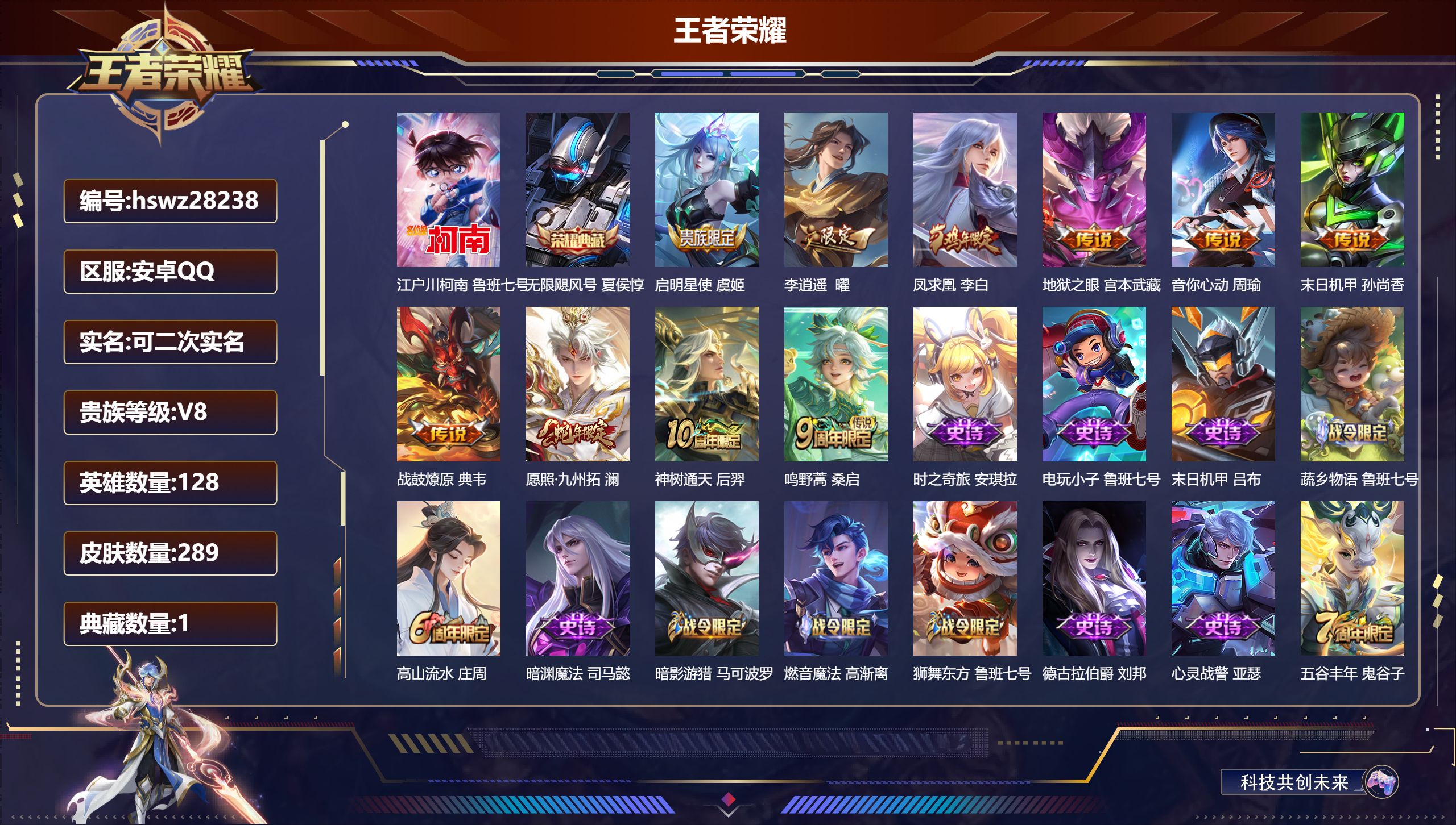PX_2557907-Q/最强王者/289皮肤/128英雄/1典藏/0珍品无双/0无双/1珍品传说/10传说/80史诗/8稀有英雄 【1,珍品传说】江户川柯南,鲁班七号, 【1,典藏皮肤】无限飓风号,夏侯惇, 【10,传说皮肤】启明星使,虞姬,李逍遥,,曜,凤求凰,李白,地狱之眼,宫本武藏,音你心动,周瑜,末日机甲,孙尚香,战鼓燎原,典韦,愿照·九州拓,澜,神树通天,后羿,鸣野蒿,桑启, 【80,史诗皮肤】时之奇旅,安琪拉,电玩小子,鲁班七号,末日机甲,吕布,蔬乡物语,鲁班七号,高山流水,庄周,暗渊魔法,司马懿,暗影游猎,马可波罗,燃音魔法,高渐离,狮舞东方,鲁班七号,德古拉伯爵,刘邦,心灵战警,亚瑟,五谷丰年,鬼谷子,无心,元歌,鬼剑武藏,宫本武藏,星夜王子,白起,地狱燃心,司空震,线条小狗,周瑜,摇滚巨星,嬴政,顽趣,梦奇,冰锋战神,关羽,修罗,橘右京,拒霜思,嫦娥,魅力维加斯,妲己,偶像歌手,王昭君,荣光圣徽,蒙恬,女仆咖啡,妲己,赏金猎手,澜,九幽镇关,项羽,星界游侠,暃,猪悟能,猪八戒,暗夜贵公子,嬴政,鹰眼统帅,狄仁杰,胡桃异想国,米莱狄,白晶晶,芈月,大圣娶亲,孙悟空,孙行者,孙悟空,李小龙,裴擒虎,纤云弄巧,云中君,如梦令,后羿,金属风暴,墨子,傲雪梅枪,韩信,猫狗日记,孙策,原初追逐者,百里玄策,逐浪之夏,李元芳,朱雀志,百里守约,黎明之约,雅典娜,魔术师,狄仁杰,皇家上将,赵云,至尊宝,孙悟空,功夫厨神,程咬金,梁祝,上官婉儿,天才门将,刘禅,圣诞恋歌,貂蝉,云间偶戏,元歌,破空之剑,亚连,百木心枪,赵云,怒海争锋,黄忠,圣诞狂欢,吕布,器灵·浮梦炉,赵怀真,星界战将,牛魔,永昼,夏洛特,天狼溯光者,伽罗,冰雪圆舞曲,甄姬,火炮绅士,黄忠,航海奇遇记,老夫子,千年之狐,李白,节奏热浪,阿轲,暗夜猫娘,阿轲,超时空战士,钟无艳,曙光守护者,铠,万灵启世,女娲,心灵骇客,安琪拉,吟游魔法,明世隐,缤纷独角兽,小乔,真爱魔法,干将莫邪,时之恋人,孙尚香,水果甜心,孙尚香,狂想玩偶喵,蒙犽,乘风破浪,夏侯惇,暗隐猎兽者,兰陵王, 【145,勇者皮肤】胡桃夹子,干将莫邪,圆桌骑士,盾山,烛龙,曹操,太极少年,赵怀真,星际陆战队,达摩,沙漠行僧,达摩,大漠名商,沈梦溪,缤纷绘卷,张良,纽约教父,刘备,拳王,达摩,大发明家,达摩,乐园追猎者,白起,丁香结,小乔,功夫炙烤,廉颇,铁甲之心,典韦,沉稳之力,孙尚香,幻夜卜梦,芈月,海盐诗旅,桑启,朔风刀,夏侯惇,醍醐杖,老夫子,归虚梦演,孙膑,汉昭烈帝,刘备,白色死神,白起,黄金武士,典韦,落雪兰心,甄姬,御旌,牛魔,阴阳师,狄仁杰,次元突破,哪吒,古海寻踪,张良,戏梦巡演,空空儿,功夫老勺,老夫子,西部大镖客,牛魔,鲨炮海盗猫,沈梦溪,虎啸剑宗,刘邦,海滩派对,项羽,万华元夜,狄仁杰,无尽征程,廉颇,制霸全明星,牛魔,踏浪烽翎,莱西奥,演武夺筹,程咬金,奇妙博物学,庄周,西部游侠,莱西奥,野性能量,吕布,哥特玫瑰,露娜,守护之力,大乔,无双福将,程咬金,瓷语鉴心,露娜,原初探秘者,鬼谷子,潮玩探月行,猪八戒,天穹祈灯,鬼谷子,决胜大满贯,曹操,西部大镖客,猪八戒,疑决卦,明世隐,化身博士,扁鹊,潮玩骑士王,亚瑟,阿尔法小队,后羿,五福同心,张飞,夜都怪侠,白起,星际陆战队,程咬金,幻乐之宴,鬼谷子,东方不败,武则天,霸王丸,宫本武藏,虹云星官,明世隐,救世之瞳,扁鹊,死亡骑士,亚瑟,敏锐之力,李白,破局者,亚连,玩偶对对碰,安琪拉,掌控之力,诸葛亮,海滩丽影,钟无艳,圣弓游侠,后羿,忍·炎影,赵云,狰,白起,雪境奇遇,西施,重明,芈月,炽热元素使,姜子牙,坚韧之力,苏烈,万事如意,刘备,逐霄战戟,吕布,擒涛扼浪,裴擒虎,乓乓大师,鲁班大师,死亡摇滚,高渐离,探海日志,鲁班大师,女武神,艾琳,天使之翼,孙膑,雾都夜雨,干将莫邪,兔女郎,花木兰,龙腾万里,关羽,流音漫舞,艾琳,金庭之子,兰陵王,罗小黑战记,哪吒,千军破阵,苏烈,零食大作战,姬小满,荣光之誓,亚瑟,花好人间,甄姬,万象初新,宫本武藏,御銮,盾山,单词大作战,雅典娜,秘密基地,刘禅,穷奇,典韦,教廷特使,韩信,街头霸王,韩信,云中旅人,李元芳,西部大镖客,孙悟空,紫罗兰之誓,妲己,神迹守卫,墨子,重装意志,盘古,凯尔特女王,虞姬,进击墨子号,墨子,蔬乡物语,李元芳,少女阿狸,妲己,灵卜魔法,妲己,混沌棋,弈星,御霄,米莱狄,蔚蓝守将,蒙恬,契约魔法,米莱狄,暖冬·兔眠,嫦娥,幻想奇妙夜,王昭君,驱傩正仪,钟馗,神迹守卫,钟馗,命运角斗场,狂铁,特工战影,狂铁,虚灵犬护,钟馗,御狮,狂铁,班班快跑,鲁班七号,白执事,赵云,饕餮,太乙真人,华丽摇滚,太乙真人,劲辣红锅,太乙真人,神迹守卫,孙悟空,罗小黑战记,张良,剑破天穹,刘邦,异域游侠,刘备,熔金海岸,周瑜,天穹之誓,姜子牙,星梦巡礼,姜子牙,谧流熔炉,太乙真人,暗都幽影,大司命,鹤鸣心笺,艾琳,逆浪荇歌,甄姬,线条小狗,周瑜,噬灭天穹,东皇太一,灵卦秘语,少司缘,爆裂喵拳,达摩,玫蓝誓约,戈娅, 【55,其他皮肤】金属狂潮,高渐离,前尘,金蝉,战争骑士,夏侯惇,芝加哥教父,黄忠,潮流仙人,老夫子,三太子,哪吒,龙域领主,铠,死神来了,曹操,超能战警,曹操,爱与和平,苏烈,未来旅行,孙膑,第七人偶,干将莫邪,灼热之刃,李信,熊喵少女,阿古朵,木偶奇遇记,鲁班七号,福禄兄弟,鲁班七号,帝国元帅,项羽,精灵王,后羿,绯红之刃,露娜,冰刃幻境,镜,碧珀绯影,暃,魇语军师,司马懿,启蛰,司空震,隐刃,兰陵王,花间舞,公孙离,街头旋风,裴擒虎,归虚梦演,鲁班大师,东海龙王,东皇太一,剑舞者,花木兰,范海辛,李白,维京掠夺者,苍,归虚梦演,蒙犽,激情绿茵,马可波罗,