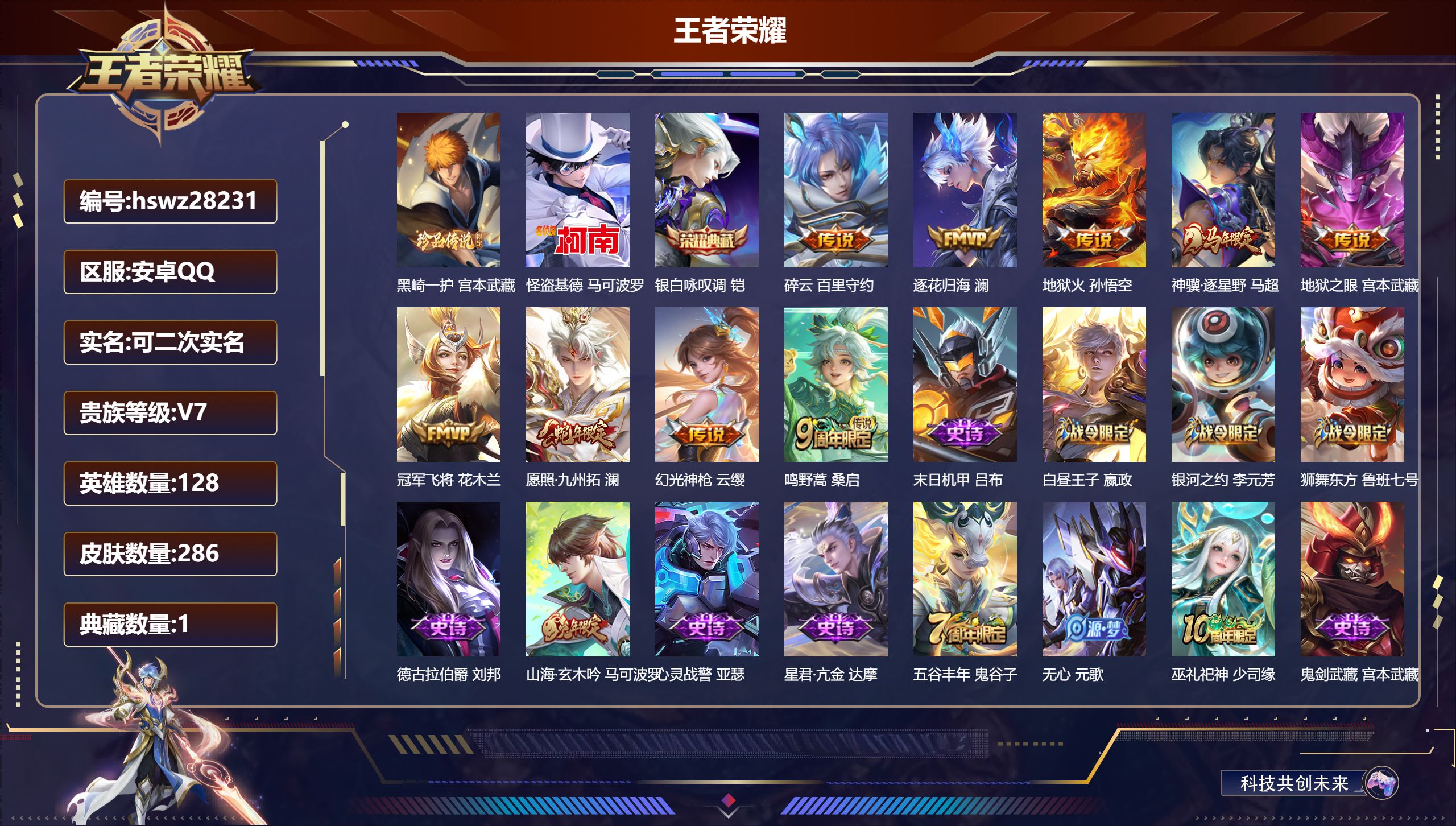 PX_2557787-Q/至尊星耀/286皮肤/128英雄/1典藏/0珍品无双/0无双/2珍品传说/9传说/70史诗/8稀有英雄 【2,珍品传说】黑崎一护,宫本武藏,怪盗基德,马可波罗, 【1,典藏皮肤】银白咏叹调,铠, 【9,传说皮肤】碎云,百里守约,逐花归海,澜,地狱火,孙悟空,神骥·逐星野,马超,地狱之眼,宫本武藏,冠军飞将,花木兰,愿照·九州拓,澜,幻光神枪,云缨,鸣野蒿,桑启, 【70,史诗皮肤】末日机甲,吕布,白昼王子,嬴政,银河之约,李元芳,狮舞东方,鲁班七号,德古拉伯爵,刘邦,山海·玄木吟,马可波罗,心灵战警,亚瑟,星君·亢金,达摩,五谷丰年,鬼谷子,无心,元歌,巫礼祀神,少司缘,鬼剑武藏,宫本武藏,百相守梦,黄忠,星夜王子,白起,线条小狗,周瑜,摇滚巨星,嬴政,魅力维加斯,妲己,黄金分割率,诸葛亮,女仆咖啡,妲己,舞动绿茵,蔡文姬,鹰眼统帅,狄仁杰,大圣娶亲,孙悟空,李小龙,裴擒虎,光弋星穹,莱西奥,驯魔猎人,兰陵王,如梦令,后羿,金属风暴,墨子,特工魅影,百里守约,猫狗日记,孙策,原初追逐者,百里玄策,逐浪之夏,李元芳,未来纪元,赵云,鸭鸭历险记,刘禅,魔术师,狄仁杰,龙之律动,狂铁,顽岩魄,蒙犽,皇家上将,赵云,冰冠公主,雅典娜,至尊宝,孙悟空,功夫厨神,程咬金,梁祝,上官婉儿,天才门将,刘禅,圣诞恋歌,貂蝉,云间偶戏,元歌,水晶猎龙者,花木兰,涂山容容,公孙离,心动手记,海诺,圣诞狂欢,吕布,器灵·浮梦炉,赵怀真,白龙吟,韩信,地狱岩魂,廉颇,蔷薇恋人,孙尚香,冰雪圆舞曲,甄姬,千年之狐,李白,节奏热浪,阿轲,曙光守护者,铠,心灵骇客,安琪拉,箭羽风息,伽罗,乱世虎臣,张飞,百相守梦,周瑜,真我赫兹,镜,绅士熊喵,刘禅,缤纷独角兽,小乔,蓝屏警告,典韦,水果甜心,孙尚香,化蝶舞,阿轲,江河有灵,阿古朵,幽灵船长,曹操,乘风破浪,夏侯惇,暗隐猎兽者,兰陵王, 【148,勇者皮肤】时空谍影,海诺,圆桌骑士,盾山,烛龙,曹操,星际陆战队,达摩,沙漠行僧,达摩,大漠名商,沈梦溪,缤纷绘卷,张良,纽约教父,刘备,拳王,达摩,大发明家,达摩,龙舞盛年,沈梦溪,丁香结,小乔,功夫炙烤,廉颇,铁甲之心,典韦,海盐诗旅,桑启,朔风刀,夏侯惇,醍醐杖,老夫子,朔望之晖,女娲,归虚梦演,孙膑,汉昭烈帝,刘备,白色死神,白起,黑桃队长,鲁班七号,黄金武士,典韦,御旌,牛魔,阴阳师,狄仁杰,径山谋武,孙权,致命风华,阿轲,次元突破,哪吒,牛运亨通,牛魔,戏梦巡演,空空儿,功夫老勺,老夫子,西部大镖客,牛魔,鲨炮海盗猫,沈梦溪,虎啸剑宗,刘邦,海滩派对,项羽,万华元夜,狄仁杰,克喵,鬼谷子,踏浪烽翎,莱西奥,演武夺筹,程咬金,红桃皇后,芈月,奇妙博物学,庄周,西部游侠,莱西奥,猎兽之王,吕布,野性能量,吕布,哥特玫瑰,露娜,守护之力,大乔,无双福将,程咬金,原初探秘者,鬼谷子,星空之诺,沈梦溪,潮玩探月行,猪八戒,天穹祈灯,鬼谷子,疑决卦,明世隐,化身博士,扁鹊,潮玩骑士王,亚瑟,阿尔法小队,后羿,金色潮汐,朵莉亚,幻乐之宴,鬼谷子,东方不败,武则天,霸王丸,宫本武藏,虹云星官,明世隐,雾影缉谜,兰陵王,潮玩牛仔,马可波罗,舞狮寰,吕布,救世之瞳,扁鹊,赤刃凌霄,敖隐,赤莲之焰,周瑜,死亡骑士,亚瑟,浪漫序章,刘备,胡桃狂想曲,蒙犽,幽兰居士,张良,玩偶对对碰,安琪拉,掌控之力,诸葛亮,海滩丽影,钟无艳,忍·炎影,赵云,狰,白起,雪境奇遇,西施,炽热元素使,姜子牙,坚韧之力,苏烈,唤灵魔甲,刘禅,万事如意,刘备,擒涛扼浪,裴擒虎,乓乓大师,鲁班大师,逐霄之志,曹操,溯影追猎,虞姬,探海日志,鲁班大师,雾都夜雨,干将莫邪,玩趣恶龙,高渐离,兔女郎,花木兰,龙腾万里,关羽,金庭之子,兰陵王,未来纪元,宫本武藏,罗小黑战记,哪吒,千军破阵,苏烈,往忆晖光,明世隐,零食大作战,姬小满,荣光之誓,亚瑟,花好人间,甄姬,万象初新,宫本武藏,御銮,盾山,时尚教父,姜子牙,秘密基地,刘禅,穷奇,典韦,教廷特使,韩信,街头霸王,韩信,云中旅人,李元芳,西部大镖客,孙悟空,重装意志,盘古,少女阿狸,妲己,混沌棋,弈星,御霄,米莱狄,秘证寻踪,小乔,蔚蓝守将,蒙恬,春野闲踪,苏烈,布丁狗之约,阿古朵,命运加冕,露娜,小满鸭,姬小满,幻想奇妙夜,王昭君,灵野札记,张良,驱傩正仪,钟馗,潮玩士官长,雅典娜,神迹守卫,钟馗,鸭鸭历险记,沈梦溪,命运角斗场,狂铁,死霸装,白起,虚灵犬护,钟馗,御狮,狂铁,白执事,赵云,饕餮,太乙真人,罗小黑战记,张良,铁骨偃魂,典韦,熔金海岸,周瑜,苍林狼骑,苍,天穹之誓,姜子牙,星梦巡礼,姜子牙,谧流熔炉,太乙真人,金福满堂,东皇太一,鹤鸣心笺,艾琳,锦麟游梦,庄周,云械蓝图,云中君,逆浪荇歌,甄姬,百相守梦,孙策,线条小狗,周瑜,噬灭天穹,东皇太一,灵卦秘语,少司缘,敬我三分,盘古,爆裂喵拳,达摩,玫蓝誓约,戈娅,景韶洛都,明世隐, 【60,其他皮肤】伊势巫女,大乔,金属狂潮,高渐离,前尘,金蝉,战争骑士,夏侯惇,芝加哥教父,黄忠,潮流仙人,老夫子,三太子,哪吒,龙域领主,铠,生化警戒,钟无艳,死神来了,曹操,花见巫女,伽罗,爱与和平,苏烈,第七人偶,干将莫邪,海之征途,孙策,福禄兄弟,鲁班七号,帝国元帅,项羽,精灵王,后羿,绯红之刃,露娜,冰刃幻境,镜,碧珀绯影,暃,星航指挥官,诸葛亮,魇语军师,司马懿,午夜歌剧院,元歌,启蛰,司空震,隐刃,兰陵王,花间舞,公孙离,异域舞娘,貂蝉,街头旋风,裴擒虎,东海龙王,东皇太一,修竹墨客,上官婉儿,剑舞者,花木兰,范海辛,李白,维京掠夺者,苍,占星师,明世隐,归虚梦演,蒙犽,激情绿茵,马可波罗,埃及法老,杨戬,年年有余,猪八戒,尼罗河女神,女娲,锦衣卫,狄仁杰,一千