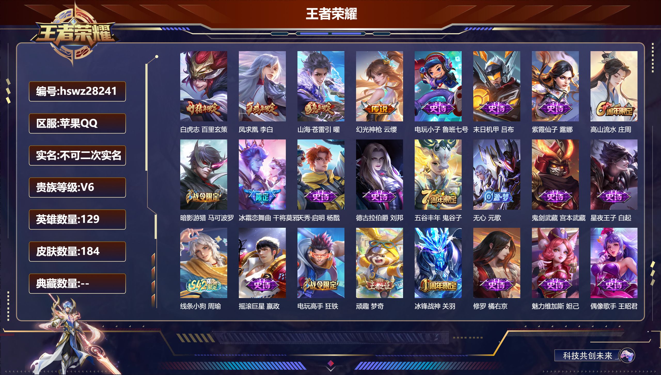 PX_2557860-Q/无双王者/184皮肤/129英雄/0典藏/0珍品无双/0无双/0珍品传说/4传说/62史诗/9稀有英雄 【4,传说皮肤】白虎志,百里玄策,凤求凰,李白,山海·苍雷引,曜,幻光神枪,云缨, 【62,史诗皮肤】电玩小子,鲁班七号,末日机甲,吕布,紫霞仙子,露娜,高山流水,庄周,暗影游猎,马可波罗,冰霜恋舞曲,干将莫邪,天秀·启明,杨戬,德古拉伯爵,刘邦,五谷丰年,鬼谷子,无心,元歌,鬼剑武藏,宫本武藏,星夜王子,白起,线条小狗,周瑜,摇滚巨星,嬴政,电玩高手,狂铁,顽趣,梦奇,冰锋战神,关羽,修罗,橘右京,魅力维加斯,妲己,偶像歌手,王昭君,霸王别姬,虞姬,舞动绿茵,蔡文姬,繁星吟游,蔡文姬,鹰眼统帅,狄仁杰,胡桃异想国,米莱狄,飞衡,韩信,李小龙,裴擒虎,光弋星穹,莱西奥,纤云弄巧,云中君,金属风暴,墨子,猫狗日记,孙策,原初追逐者,百里玄策,逐浪之夏,李元芳,未来纪元,赵云,朱雀志,百里守约,黎明之约,雅典娜,魔术师,狄仁杰,皇家上将,赵云,至尊宝,孙悟空,天才门将,刘禅,圣诞恋歌,貂蝉,云间偶戏,元歌,水晶猎龙者,花木兰,圣诞狂欢,吕布,岱宗,典韦,星界战将,牛魔,冰雪圆舞曲,甄姬,航海奇遇记,老夫子,超时空战士,钟无艳,游园惊梦,甄姬,青龙志,铠,心灵骇客,安琪拉,乱世虎臣,张飞,万物之道,弈星,百相守梦,百里守约,线条小狗,小乔,水果甜心,孙尚香,狂想玩偶喵,蒙犽,江河有灵,阿古朵,幽灵船长,曹操,乘风破浪,夏侯惇,暗隐猎兽者,兰陵王, 【93,勇者皮肤】圆桌骑士,盾山,爱心护理,阿轲,星际陆战队,达摩,沙漠行僧,达摩,大漠名商,沈梦溪,缤纷绘卷,张良,拳王,达摩,大发明家,达摩,功夫炙烤,廉颇,沉稳之力,孙尚香,海盐诗旅,桑启,朔风刀,夏侯惇,醍醐杖,老夫子,汉昭烈帝,刘备,白色死神,白起,黄金武士,典韦,落雪兰心,甄姬,御旌,牛魔,阴阳师,狄仁杰,次元突破,哪吒,古海寻踪,张良,功夫老勺,老夫子,鲨炮海盗猫,沈梦溪,海滩派对,项羽,万华元夜,狄仁杰,演武夺筹,程咬金,红桃皇后,芈月,西部游侠,莱西奥,哥特玫瑰,露娜,守护之力,大乔,无双福将,程咬金,原初探秘者,鬼谷子,潮玩探月行,猪八戒,天穹祈灯,鬼谷子,西部大镖客,猪八戒,疑决卦,明世隐,化身博士,扁鹊,潮玩骑士王,亚瑟,阿尔法小队,后羿,五福同心,张飞,次元傲视,杨戬,幻乐之宴,鬼谷子,虹云星官,明世隐,雾影缉谜,兰陵王,死亡骑士,亚瑟,玩偶对对碰,安琪拉,掌控之力,诸葛亮,海滩丽影,钟无艳,雪境奇遇,西施,坚韧之力,苏烈,擒涛扼浪,裴擒虎,乓乓大师,鲁班大师,死亡摇滚,高渐离,溯影追猎,虞姬,探海日志,鲁班大师,天使之翼,孙膑,雾都夜雨,干将莫邪,玩趣恶龙,高渐离,兔女郎,花木兰,未来纪元,宫本武藏,千军破阵,苏烈,往忆晖光,明世隐,荣光之誓,亚瑟,花好人间,甄姬,万象初新,宫本武藏,御銮,盾山,单词大作战,雅典娜,时尚教父,姜子牙,秘密基地,刘禅,教廷特使,韩信,街头霸王,韩信,云中旅人,李元芳,神迹守卫,墨子,重装意志,盘古,少女阿狸,妲己,灵卜魔法,妲己,混沌棋,弈星,御霄,米莱狄,蔚蓝守将,蒙恬,午后时光,王昭君,幻想奇妙夜,王昭君,驱傩正仪,钟馗,华丽摇滚,太乙真人,铁骨偃魂,典韦,苍林狼骑,苍,魅影绮裳,影,星梦巡礼,姜子牙,谧流熔炉,太乙真人,线条小狗,周瑜,线条小狗,桑启,百相守梦,老夫子,噬灭天穹,东皇太一,爆裂喵拳,达摩, 【26,其他皮肤】伊势巫女,大乔,芝加哥教父,黄忠,潮流仙人,老夫子,龙域领主,铠,生化警戒,钟无艳,灼热之刃,李信,帝国元帅,项羽,碧珀绯影,暃,星航指挥官,诸葛亮,启蛰,司空震,异域舞娘,貂蝉,街头旋风,裴擒虎,东海龙王,东皇太一,维京掠夺者,苍,占星师,明世隐,激情绿茵,马可波罗,威尼斯狂欢,百里玄策,幸存者,马超,战争女神,雅典娜,神奇女侠,雅典娜,荷鲁斯之眼,云中君,特种部队,李元芳,孤猎,澜,赤焰之缨,云缨,地府判官,钟馗,天启骑士,关羽, 【9,稀有英雄】敖隐,嬴政,不知火舞,橘右京,夏洛特,娜可露露,韩信,艾琳,赵云, 营地ID:,