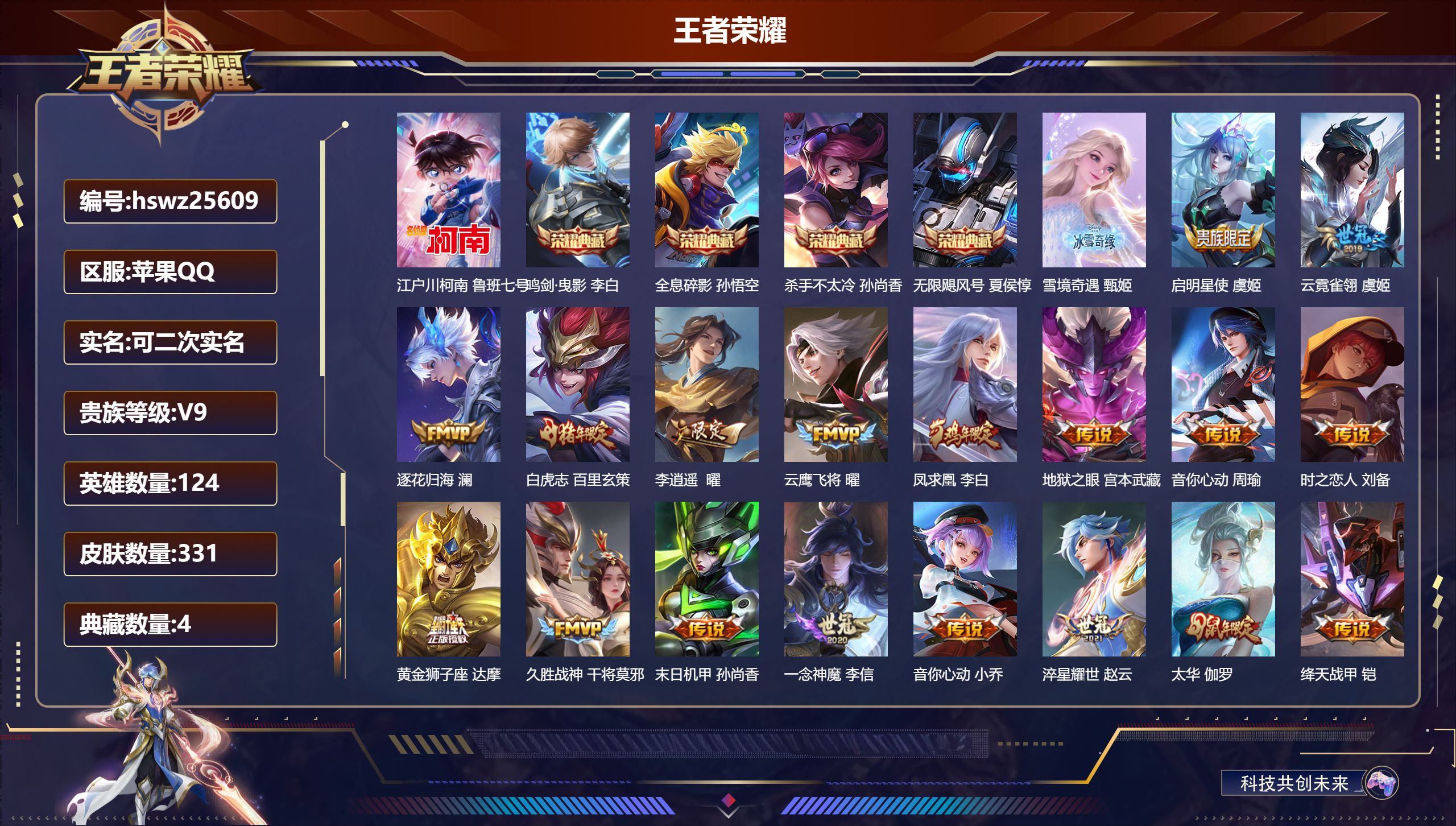 PX_2498200-Q/荣耀黄金/331皮肤/124英雄/4典藏/0珍品无双/1无双/1珍品传说/20传说/98史诗/8稀有英雄 【1,珍品传说】江户川柯南,鲁班七号, 【4,典藏皮肤】鸣剑·曳影,李白,全息碎影,孙悟空,杀手不太冷,孙尚香,无限飓风号,夏侯惇, 【1,无双皮肤】雪境奇遇,甄姬, 【20,传说皮肤】启明星使,虞姬,云霓雀翎,虞姬,逐花归海,澜,白虎志,百里玄策,李逍遥,,曜,云鹰飞将,曜,凤求凰,李白,地狱之眼,宫本武藏,音你心动,周瑜,时之恋人,刘备,黄金狮子座,达摩,久胜战神,干将莫邪,末日机甲,孙尚香,一念神魔,李信,音你心动,小乔,淬星耀世,赵云,太华,伽罗,绛天战甲,铠,超时空战士,狄仁杰,鸣野蒿,桑启, 【98,史诗皮肤】奔雷神使,牛魔,龙鼓争鸣,蒙犽,乒乒小将,鲁班七号,电玩小子,鲁班七号,末日机甲,吕布,白昼王子,嬴政,逐梦之星,马可波罗,紫霞仙子,露娜,银河之约,李元芳,暗渊魔法,司马懿,暗影游猎,马可波罗,苍穹之光,项羽,天秀·启明,杨戬,狮舞东方,鲁班七号,德古拉伯爵,刘邦,心灵战警,亚瑟,诗语江南,西施,鬼剑武藏,宫本武藏,迷踪丽影,阿轲,星夜王子,白起,遇见飞天,杨玉环,摇滚巨星,嬴政,蜜橘之夏,公孙离,修罗,橘右京,魅力维加斯,妲己,黄金分割率,诸葛亮,乐园奇幻夜,钟馗,偶像歌手,王昭君,女仆咖啡,妲己,白蛇,大乔,晚萤,娜可露露,舞动绿茵,蔡文姬,繁星吟游,蔡文姬,暗夜贵公子,嬴政,鹰眼统帅,狄仁杰,胡桃异想国,米莱狄,白晶晶,芈月,大圣娶亲,孙悟空,飞衡,韩信,李小龙,裴擒虎,驯魔猎人,兰陵王,如梦令,后羿,龙骑士,墨子,金属风暴,墨子,嘻哈天王,赵云,玄嵩,庄周,特工魅影,百里守约,猫狗日记,孙策,原初追逐者,百里玄策,逐浪之夏,李元芳,未来纪元,赵云,朱雀志,百里守约,黎明之约,雅典娜,魔术师,狄仁杰,热力回旋,百里玄策,龙之律动,狂铁,神威,马超,皇家上将,赵云,冰冠公主,雅典娜,功夫厨神,程咬金,梁祝,上官婉儿,天才门将,刘禅,圣诞恋歌,貂蝉,云间偶戏,元歌,水晶猎龙者,花木兰,破空之剑,亚连,烈魂,黄忠,圣诞狂欢,吕布,魅语,不知火舞,岱宗,典韦,天狼溯光者,伽罗,地狱岩魂,廉颇,茶境仙,孙膑,蔷薇恋人,孙尚香,冰雪圆舞曲,甄姬,青蛇,小乔,航海奇遇记,老夫子,千年之狐,李白,节奏热浪,阿轲,暗夜猫娘,阿轲,曙光守护者,铠,青龙志,铠,心灵骇客,安琪拉,箭羽风息,伽罗,乱世虎臣,张飞,天狼征服者,曹操,龙胆,赵云,绅士熊喵,刘禅,缤纷独角兽,小乔,百相守梦,百里守约,蓝屏警告,典韦,时之恋人,孙尚香,水果甜心,孙尚香,狂想玩偶喵,蒙犽,化蝶舞,阿轲,幽灵船长,曹操,乘风破浪,夏侯惇,暗隐猎兽者,兰陵王, 【130,勇者皮肤】时空谍影,海诺,圆桌骑士,盾山,烛龙,曹操,爱心护理,阿轲,太极少年,赵怀真,星际陆战队,达摩,沙漠行僧,达摩,缤纷绘卷,张良,纽约教父,刘备,拳王,达摩,大发明家,达摩,龙舞盛年,沈梦溪,丁香结,小乔,功夫炙烤,廉颇,幻泉雾影,海月,朔风刀,夏侯惇,醍醐杖,老夫子,朔望之晖,女娲,归虚梦演,孙膑,汉昭烈帝,刘备,白色死神,白起,黑桃队长,鲁班七号,黄金武士,典韦,夺宝奇兵,刘邦,御旌,牛魔,阴阳师,狄仁杰,致命风华,阿轲,次元突破,哪吒,科学大爆炸,项羽,功夫老勺,老夫子,西部大镖客,牛魔,鲨炮海盗猫,沈梦溪,海滩派对,项羽,完美运算,后羿,万华元夜,狄仁杰,无尽征程,廉颇,演武夺筹,程咬金,红桃皇后,芈月,奇妙博物学,庄周,西部游侠,莱西奥,猎兽之王,吕布,野性能量,吕布,哥特玫瑰,露娜,守护之力,大乔,无双福将,程咬金,瓷语鉴心,露娜,原初探秘者,鬼谷子,星空之诺,沈梦溪,潮玩探月行,猪八戒,西部大镖客,猪八戒,疑决卦,明世隐,化身博士,扁鹊,潮玩骑士王,亚瑟,阿尔法小队,后羿,五福同心,张飞,次元傲视,杨戬,星际陆战队,程咬金,幻乐之宴,鬼谷子,东方不败,武则天,霸王丸,宫本武藏,虹云星官,明世隐,救世之瞳,扁鹊,赤莲之焰,周瑜,死亡骑士,亚瑟,浪漫序章,刘备,敏锐之力,李白,幽兰居士,张良,玩偶对对碰,安琪拉,掌控之力,诸葛亮,海滩丽影,钟无艳,圣弓游侠,后羿,忍·炎影,赵云,狰,白起,雪境奇遇,西施,重明,芈月,炽热元素使,姜子牙,坚韧之力,苏烈,万事如意,刘备,逐霄战戟,吕布,乓乓大师,鲁班大师,死亡摇滚,高渐离,天使之翼,孙膑,雾都夜雨,干将莫邪,兔女郎,花木兰,龙腾万里,关羽,金庭之子,兰陵王,未来纪元,宫本武藏,千军破阵,苏烈,花好人间,甄姬,万象初新,宫本武藏,御銮,盾山,单词大作战,雅典娜,时尚教父,姜子牙,秘密基地,刘禅,穷奇,典韦,教廷特使,韩信,街头霸王,韩信,神迹守卫,墨子,重装意志,盘古,凯尔特女王,虞姬,少女阿狸,妲己,混沌棋,弈星,御霄,米莱狄,蔚蓝守将,蒙恬,春野闲踪,苏烈,契约魔法,米莱狄,布丁狗之约,阿古朵,午后时光,王昭君,幻想奇妙夜,王昭君,灵野札记,张良,驱傩正仪,钟馗,神迹守卫,钟馗,命运角斗场,狂铁,特工战影,狂铁,御狮,狂铁,白执事,赵云,饕餮,太乙真人,华丽摇滚,太乙真人,劲辣红锅,太乙真人,神迹守卫,孙悟空,铁骨偃魂,典韦,苍林狼骑,苍,天穹之誓,姜子牙,访茗客,马超,星梦巡礼,姜子牙,百相守梦,老夫子,噬灭天穹,东皇太一,敬我三分,盘古,玫蓝誓约,戈娅,景韶洛都,明世隐, 【78,其他皮肤】伊势巫女,大乔,金属狂潮,高渐离,前尘,金蝉,战争骑士,夏侯惇,圣殿之光,刘邦,芝加哥教父,黄忠,潮流仙人,老夫子,三太子,哪吒,棒球奇才,沈梦溪,极冰防御线,盾山,龙域领主,铠,生化警戒,钟无艳,死神来了,曹操,超能战警,曹操,花见巫女,伽罗,爱与和平,苏烈,未来旅行,孙膑,第七人偶,干将莫邪,