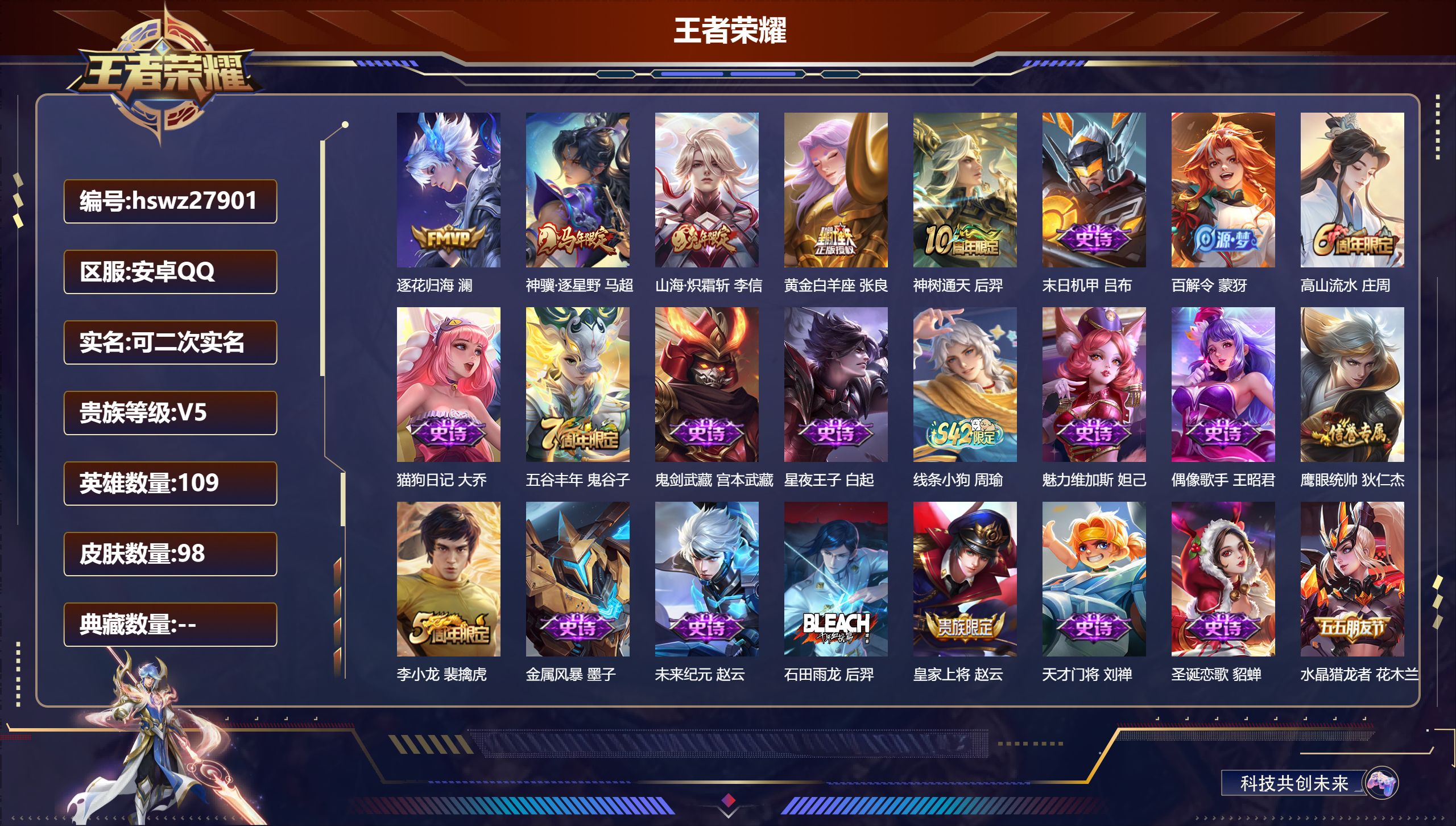 PX_2549271-Q/无双王者/98皮肤/109英雄/0典藏/0珍品无双/0无双/0珍品传说/5传说/26史诗/5稀有英雄 【5,传说皮肤】逐花归海,澜,神骥·逐星野,马超,山海·炽霜斩,李信,黄金白羊座,张良,神树通天,后羿, 【26,史诗皮肤】末日机甲,吕布,百解令,蒙犽,高山流水,庄周,猫狗日记,大乔,五谷丰年,鬼谷子,鬼剑武藏,宫本武藏,星夜王子,白起,线条小狗,周瑜,魅力维加斯,妲己,偶像歌手,王昭君,鹰眼统帅,狄仁杰,李小龙,裴擒虎,金属风暴,墨子,未来纪元,赵云,石田雨龙,后羿,皇家上将,赵云,天才门将,刘禅,圣诞恋歌,貂蝉,水晶猎龙者,花木兰,冰雪圆舞曲,甄姬,曙光守护者,铠,乱世虎臣,张飞,线条小狗,小乔,时之恋人,孙尚香,江河有灵,阿古朵,幽灵船长,曹操, 【51,勇者皮肤】胡桃夹子,干将莫邪,沙漠行僧,达摩,大漠名商,沈梦溪,拳王,达摩,乐园追猎者,白起,沉稳之力,孙尚香,海盐诗旅,桑启,白色死神,白起,黄金武士,典韦,阴阳师,狄仁杰,径山谋武,孙权,古海寻踪,张良,功夫老勺,老夫子,海滩派对,项羽,完美运算,后羿,野性能量,吕布,百相守梦,影,潮玩探月行,猪八戒,天穹祈灯,鬼谷子,化身博士,扁鹊,虹云星官,明世隐,死亡骑士,亚瑟,敏锐之力,李白,玩偶对对碰,安琪拉,海滩丽影,钟无艳,忍·炎影,赵云,擒涛扼浪,裴擒虎,逐霄之志,曹操,探海日志,鲁班大师,兔女郎,花木兰,金庭之子,兰陵王,千军破阵,苏烈,零食大作战,姬小满,荣光之誓,亚瑟,万象初新,宫本武藏,街头霸王,韩信,云中旅人,李元芳,西部大镖客,孙悟空,蔚蓝守将,蒙恬,驱傩正仪,钟馗,命运角斗场,狂铁,特工战影,狂铁,班班快跑,鲁班七号,铁骨偃魂,典韦,苍林狼骑,苍,魅影绮裳,影,星梦巡礼,姜子牙,暗都幽影,大司命,鹤鸣心笺,艾琳,线条小狗,周瑜,噬灭天穹,东皇太一, 【18,其他皮肤】龙域领主,铠,超能战警,曹操,第七人偶,干将莫邪,灼热之刃,李信,帝国元帅,项羽,精灵王,后羿,魇语军师,司马懿,花间舞,公孙离,异域舞娘,貂蝉,埃及法老,杨戬,锦衣卫,狄仁杰,归虚梦演,曜,威尼斯狂欢,百里玄策,幸存者,马超,绝影神枪,百里守约,森,瑶,精准探案法,米莱狄,西部大镖客,孙悟空, 【5,稀有英雄】不知火舞,橘右京,娜可露露,韩信,赵云, 营地ID:,