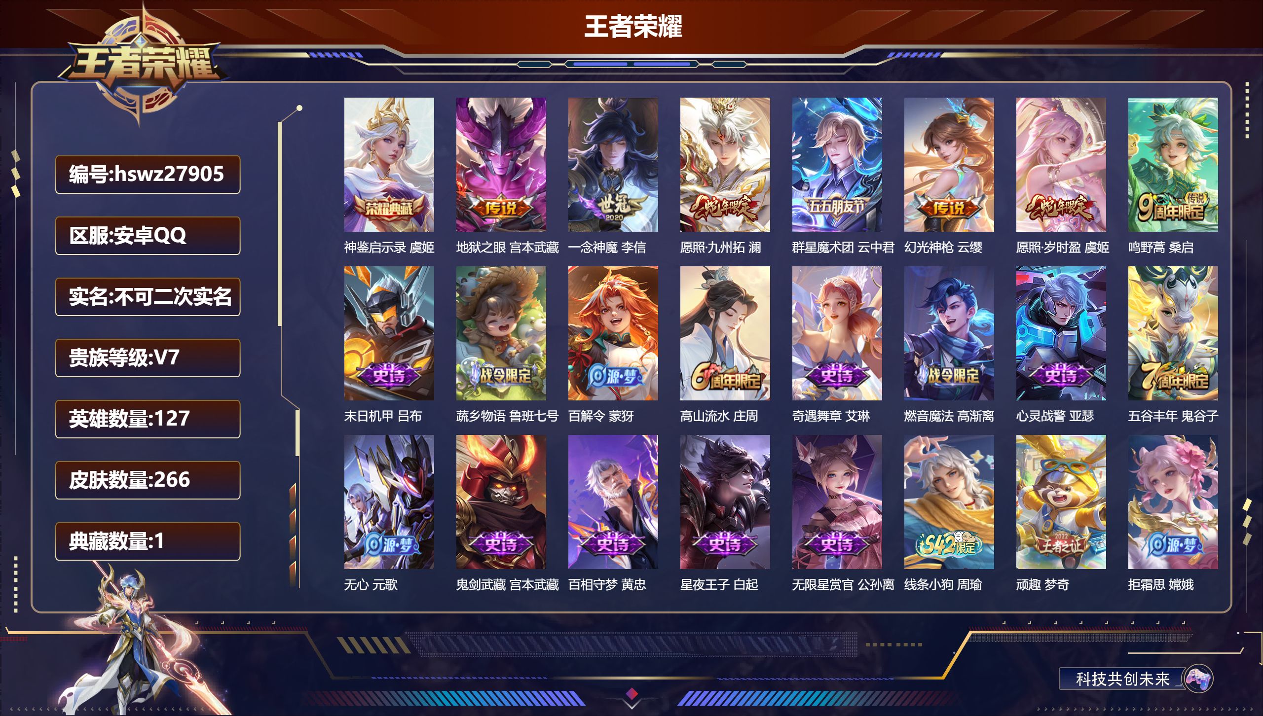 PX_2549265-Q/绝世王者/252皮肤/127英雄/1典藏/0珍品无双/0无双/0珍品传说/11传说/76史诗/8稀有英雄 【1,典藏皮肤】鸣剑·曳影,李白, 【11,传说皮肤】逐花归海,澜,仲夏夜之梦,貂蝉,神骥·赴朔漠,狄仁杰,地狱之眼,宫本武藏,乘龙·问璇玑,孙尚香,末日机甲,孙尚香,乘龙·铭钟鼎,赵云,神树通天,后羿,幻光神枪,云缨,愿照·山河定,司空震,鸣野蒿,桑启, 【76,史诗皮肤】末日机甲,吕布,蔬乡物语,鲁班七号,紫霞仙子,露娜,百解令,蒙犽,高山流水,庄周,暗影游猎,马可波罗,燃音魔法,高渐离,天秀·启明,杨戬,妄想食味,姬小满,德古拉伯爵,刘邦,山海·玄木吟,马可波罗,五谷丰年,鬼谷子,无心,元歌,鬼剑武藏,宫本武藏,星夜王子,白起,地狱燃心,司空震,锁墨魂,钟馗,线条小狗,周瑜,摇滚巨星,嬴政,修罗,橘右京,拒霜思,嫦娥,魅力维加斯,妲己,偶像歌手,王昭君,女仆咖啡,妲己,星界游侠,暃,繁星吟游,蔡文姬,鹰眼统帅,狄仁杰,李小龙,裴擒虎,光弋星穹,莱西奥,纤云弄巧,云中君,龙骑士,墨子,金属风暴,墨子,特工魅影,百里守约,猫狗日记,孙策,逐浪之夏,李元芳,奇幻香踪,扁鹊,未来纪元,赵云,石田雨龙,后羿,驭风魔法,戈娅,魔术师,狄仁杰,顽岩魄,蒙犽,皇家上将,赵云,冰冠公主,雅典娜,功夫厨神,程咬金,梁祝,上官婉儿,电玩·爆裂旋风,刘禅,圣诞恋歌,貂蝉,水晶猎龙者,花木兰,撼地雄心,廉颇,破空之剑,亚连,圣诞狂欢,吕布,青焰无极,镜,器灵·浮梦炉,赵怀真,夏日便利店,蔡文姬,地狱岩魂,廉颇,茶境仙,孙膑,蔷薇恋人,孙尚香,冰雪圆舞曲,甄姬,航海奇遇记,老夫子,千年之狐,李白,节奏热浪,阿轲,超时空战士,钟无艳,曙光守护者,铠,匿光破解者,沈梦溪,箭羽风息,伽罗,乱世虎臣,张飞,琥珀纪元,伽罗,绅士熊喵,刘禅,缤纷独角兽,小乔,线条小狗,小乔,水果甜心,孙尚香,化蝶舞,阿轲,江河有灵,阿古朵,幽灵船长,曹操,乘风破浪,夏侯惇,暗隐猎兽者,兰陵王, 【128,勇者皮肤】时空谍影,海诺,玲珑珍味,西施,圆桌骑士,盾山,爱心护理,阿轲,太极少年,赵怀真,星际陆战队,达摩,沙漠行僧,达摩,大漠名商,沈梦溪,暖冬絮语,程咬金,缤纷绘卷,张良,纽约教父,刘备,拳王,达摩,大发明家,达摩,龙舞盛年,沈梦溪,乐园追猎者,白起,功夫炙烤,廉颇,沉稳之力,孙尚香,海盐诗旅,桑启,幻泉雾影,海月,热血海滩,哪吒,白色死神,白起,黄金武士,典韦,落雪兰心,甄姬,阴阳师,狄仁杰,径山谋武,孙权,次元突破,哪吒,古海寻踪,张良,牛运亨通,牛魔,科学大爆炸,项羽,功夫老勺,老夫子,西部大镖客,牛魔,鲨炮海盗猫,沈梦溪,虎啸剑宗,刘邦,海滩派对,项羽,完美运算,后羿,万华元夜,狄仁杰,制霸全明星,牛魔,红桃皇后,芈月,奇妙博物学,庄周,西部游侠,莱西奥,猎兽之王,吕布,野性能量,吕布,无双福将,程咬金,瓷语鉴心,露娜,百相守梦,影,潮玩探月行,猪八戒,天穹祈灯,鬼谷子,决胜大满贯,曹操,化身博士,扁鹊,阿尔法小队,后羿,五福同心,张飞,夜都怪侠,白起,金色潮汐,朵莉亚,次元傲视,杨戬,幻乐之宴,鬼谷子,霸王丸,宫本武藏,虹云星官,明世隐,雾影缉谜,兰陵王,潮玩骑兵,杨戬,死亡骑士,亚瑟,危途狂花,戈娅,胡桃狂想曲,蒙犽,破局者,亚连,玩偶对对碰,安琪拉,掌控之力,诸葛亮,海滩丽影,钟无艳,圣弓游侠,后羿,忍·炎影,赵云,雪境奇遇,西施,坚韧之力,苏烈,唤灵魔甲,刘禅,万事如意,刘备,擒涛扼浪,裴擒虎,苍云破阵,蒙恬,糖果风暴,安琪拉,乓乓大师,鲁班大师,逐霄之志,曹操,溯影追猎,虞姬,极光幻客,蚩奼,探海日志,鲁班大师,天使之翼,孙膑,兔女郎,花木兰,龙腾万里,关羽,流音漫舞,艾琳,金庭之子,兰陵王,千军破阵,苏烈,往忆晖光,明世隐,零食大作战,姬小满,荣光之誓,亚瑟,花好人间,甄姬,万象初新,宫本武藏,聚星闪耀,钟无艳,潮玩造梦师,刘备,春野之旅,钟无艳,秘密基地,刘禅,教廷特使,韩信,黑猫爱糖果,李元芳,街头霸王,韩信,云中旅人,李元芳,妄想特派,李元芳,西部大镖客,孙悟空,蔬乡物语,李元芳,少女阿狸,妲己,灵卜魔法,妲己,蔚蓝守将,蒙恬,契约魔法,米莱狄,暖冬·兔眠,嫦娥,幻想奇妙夜,王昭君,驱傩正仪,钟馗,命运角斗场,狂铁,特工战影,狂铁,漠中幻影,嫦娥,白执事,赵云,劲辣红锅,太乙真人,剑破天穹,刘邦,苍威无极,项羽,熔金海岸,周瑜,天穹之誓,姜子牙,访茗客,马超,星梦巡礼,姜子牙,破阵·退雄兵,杨戬,群星魔术团,程咬金,暗都幽影,大司命,夏日便利店,虞姬,线条小狗,周瑜,噬灭天穹,东皇太一,敬我三分,盘古,玫蓝誓约,戈娅, 【38,其他皮肤】伊势巫女,大乔,前尘,金蝉,战争骑士,夏侯惇,圣殿之光,刘邦,芝加哥教父,黄忠,龙域领主,铠,超能战警,曹操,花见巫女,伽罗,爱与和平,苏烈,万圣前夜,小乔,灼热之刃,李信,海之征途,孙策,木偶奇遇记,鲁班七号,精灵王,后羿,海军大将,周瑜,星航指挥官,诸葛亮,魇语军师,司马懿,午夜歌剧院,元歌,启蛰,司空震,隐刃,兰陵王,花间舞,公孙离,异域舞娘,貂蝉,归虚梦演,鲁班大师,维京掠夺者,苍,激情绿茵,马可波罗,埃及法老,杨戬,尼罗河女神,女娲,锦衣卫,狄仁杰,归虚梦演,曜,幸存者,马超,荷鲁斯之眼,云中君,创世神祝,盘古,特种部队,李元芳,绝影神枪,百里守约,蔷薇王座,蔡文姬,加勒比小姐,虞姬,露花倒影,嫦娥,西部大镖客,孙悟空, 【8,稀有英雄】敖隐,不知火舞,橘右京,夏洛特,娜可露露,韩信,艾琳,赵云, 营地ID:,