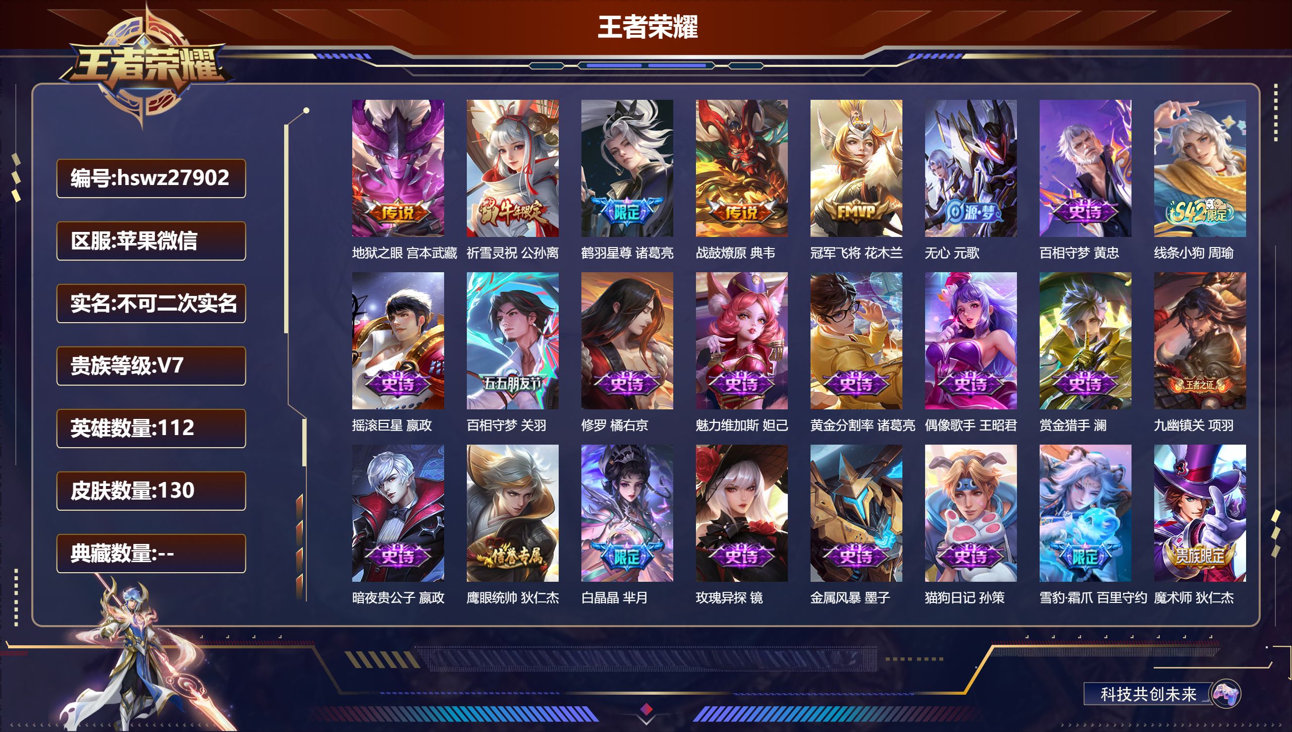 PX_2549278-??信/传奇王者/130皮肤/112英雄/0典藏/0珍品无双/0无双/0珍品传说/5传说/37史诗/5稀有英雄 【5,传说皮肤】地狱之眼,宫本武藏,祈雪灵祝,公孙离,鹤羽星尊,诸葛亮,战鼓燎原,典韦,冠军飞将,花木兰, 【37,史诗皮肤】无心,元歌,百相守梦,黄忠,线条小狗,周瑜,摇滚巨星,嬴政,百相守梦,关羽,修罗,橘右京,魅力维加斯,妲己,黄金分割率,诸葛亮,偶像歌手,王昭君,赏金猎手,澜,九幽镇关,项羽,暗夜贵公子,嬴政,鹰眼统帅,狄仁杰,白晶晶,芈月,玫瑰异探,镜,金属风暴,墨子,猫狗日记,孙策,雪豹·霜爪,百里守约,魔术师,狄仁杰,布丁狗之誓,亚瑟,龙之律动,狂铁,皇家上将,赵云,冰冠公主,雅典娜,至尊宝,孙悟空,辉光之辰,后羿,梁祝,上官婉儿,圣诞恋歌,貂蝉,涂山容容,公孙离,星界战将,牛魔,节奏热浪,阿轲,百相守梦,周瑜,星界特工,马可波罗,线条小狗,小乔,时之恋人,孙尚香,化蝶舞,阿轲,幽灵船长,曹操,暗隐猎兽者,兰陵王, 【70,勇者皮肤】胡桃夹子,干将莫邪,拳王,达摩,龙舞盛年,沈梦溪,铁甲之心,典韦,白色死神,白起,黄金武士,典韦,阴阳师,狄仁杰,牛运亨通,牛魔,西部大镖客,牛魔,海滩派对,项羽,克喵,鬼谷子,踏浪烽翎,莱西奥,红桃皇后,芈月,野性能量,吕布,哥特玫瑰,露娜,雾影缉谜,兰陵王,救世之瞳,扁鹊,死亡骑士,亚瑟,浪漫序章,刘备,敏锐之力,李白,玩偶对对碰,安琪拉,掌控之力,诸葛亮,落日弦歌,高渐离,忍·炎影,赵云,雪境奇遇,西施,苍云破阵,蒙恬,糖果风暴,安琪拉,逐霄之志,曹操,溯影追猎,虞姬,极光幻客,蚩奼,龙腾万里,关羽,未来纪元,宫本武藏,罗小黑战记,哪吒,零食大作战,姬小满,荣光之誓,亚瑟,花好人间,甄姬,时尚教父,姜子牙,秘密基地,刘禅,街头霸王,韩信,紫罗兰之誓,妲己,重装意志,盘古,秘证寻踪,小乔,春野闲踪,苏烈,布丁狗之约,阿古朵,命运加冕,露娜,小满鸭,姬小满,灵野札记,张良,命运角斗场,狂铁,死霸装,白起,虚灵犬护,钟馗,班班快跑,鲁班七号,白执事,赵云,罗小黑战记,张良,青衿临川,桑启,铁骨偃魂,典韦,苍林狼骑,苍,星梦巡礼,姜子牙,谧流熔炉,太乙真人,鹤鸣心笺,艾琳,线条小狗,妲己,锦麟游梦,庄周,云械蓝图,云中君,逆浪荇歌,甄姬,百相守梦,孙策,线条小狗,周瑜,线条小狗,桑启,噬灭天穹,东皇太一,爆裂喵拳,达摩,玫蓝誓约,戈娅,景韶洛都,明世隐, 【19,其他皮肤】前尘,金蝉,龙域领主,铠,第七人偶,干将莫邪,灼热之刃,李信,木偶奇遇记,鲁班七号,英喵野望,刘禅,午夜歌剧院,元歌,启蛰,司空震,东海龙王,东皇太一,埃及法老,杨戬,年年有余,猪八戒,锦衣卫,狄仁杰,幸存者,马超,绝影神枪,百里守约,孤猎,澜,加勒比小姐,虞姬,精准探案法,米莱狄,赤焰之缨,云缨,地府判官,钟馗, 【5,稀有英雄】不知火舞,橘右京,娜可露露,韩信,艾琳, 营地ID:,