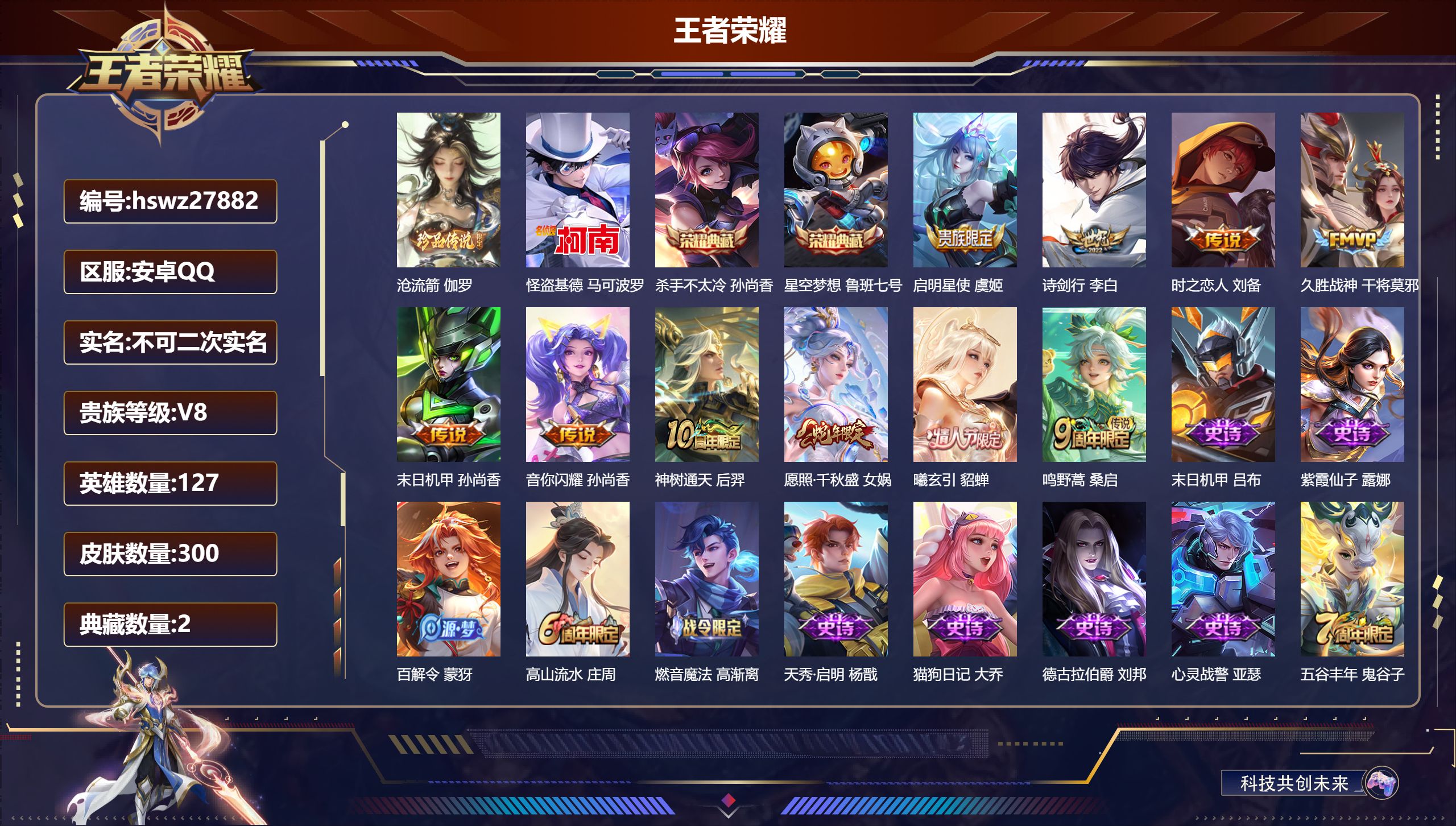 PX_2549103-Q/非凡王者/300皮肤/127英雄/2典藏/0珍品无双/0无双/2珍品传说/10传说/79史诗/8稀有英雄 【2,珍品传说】沧流箭,伽罗,怪盗基德,马可波罗, 【2,典藏皮肤】杀手不太冷,孙尚香,星空梦想,鲁班七号, 【10,传说皮肤】启明星使,虞姬,诗剑行,李白,时之恋人,刘备,久胜战神,干将莫邪,末日机甲,孙尚香,音你闪耀,孙尚香,神树通天,后羿,愿照·千秋盛,女娲,曦玄引,貂蝉,鸣野蒿,桑启, 【79,史诗皮肤】末日机甲,吕布,紫霞仙子,露娜,百解令,蒙犽,高山流水,庄周,燃音魔法,高渐离,天秀·启明,杨戬,猫狗日记,大乔,德古拉伯爵,刘邦,心灵战警,亚瑟,五谷丰年,鬼谷子,无心,元歌,星夜王子,白起,无限星赏官,公孙离,线条小狗,周瑜,摇滚巨星,嬴政,电玩高手,狂铁,修罗,橘右京,拒霜思,嫦娥,魅力维加斯,妲己,黄金分割率,诸葛亮,偶像歌手,王昭君,女仆咖啡,妲己,白蛇,大乔,舞动绿茵,蔡文姬,繁星吟游,蔡文姬,暗夜贵公子,嬴政,鹰眼统帅,狄仁杰,大圣娶亲,孙悟空,孙行者,孙悟空,李小龙,裴擒虎,光弋星穹,莱西奥,纤云弄巧,云中君,驯魔猎人,兰陵王,龙骑士,墨子,金属风暴,墨子,傲雪梅枪,韩信,特工魅影,百里守约,猫狗日记,孙策,逐浪之夏,李元芳,未来纪元,赵云,灵蛊蚀心,扁鹊,朱雀志,百里守约,魔术师,狄仁杰,龙之律动,狂铁,唤灵魅影,貂蝉,神威,马超,皇家上将,赵云,冰冠公主,雅典娜,至尊宝,孙悟空,辉光之辰,后羿,功夫厨神,程咬金,梁祝,上官婉儿,天才门将,刘禅,圣诞恋歌,貂蝉,水晶猎龙者,花木兰,圣诞狂欢,吕布,魅语,不知火舞,天狼溯光者,伽罗,地狱岩魂,廉颇,茶境仙,孙膑,蔷薇恋人,孙尚香,冰雪圆舞曲,甄姬,千年之狐,李白,节奏热浪,阿轲,游园惊梦,甄姬,曙光守护者,铠,万灵启世,女娲,心灵骇客,安琪拉,箭羽风息,伽罗,琥珀纪元,伽罗,缤纷独角兽,小乔,百相守梦,百里守约,线条小狗,小乔,时之恋人,孙尚香,水果甜心,孙尚香,江河有灵,阿古朵,幽灵船长,曹操,乘风破浪,夏侯惇,暗隐猎兽者,兰陵王, 【130,勇者皮肤】胡桃夹子,干将莫邪,圆桌骑士,盾山,沙漠行僧,达摩,大漠名商,沈梦溪,暖冬絮语,程咬金,缤纷绘卷,张良,纽约教父,刘备,拳王,达摩,龙舞盛年,沈梦溪,丁香结,小乔,功夫炙烤,廉颇,沉稳之力,孙尚香,海盐诗旅,桑启,朔风刀,夏侯惇,醍醐杖,老夫子,归虚梦演,孙膑,汉昭烈帝,刘备,白色死神,白起,黑桃队长,鲁班七号,黄金武士,典韦,御旌,牛魔,阴阳师,狄仁杰,径山谋武,孙权,次元突破,哪吒,古海寻踪,张良,牛运亨通,牛魔,科学大爆炸,项羽,功夫老勺,老夫子,西部大镖客,牛魔,鲨炮海盗猫,沈梦溪,虎啸剑宗,刘邦,海滩派对,项羽,完美运算,后羿,万华元夜,狄仁杰,制霸全明星,牛魔,演武夺筹,程咬金,红桃皇后,芈月,猎兽之王,吕布,哥特玫瑰,露娜,守护之力,大乔,无双福将,程咬金,瓷语鉴心,露娜,百相守梦,影,原初探秘者,鬼谷子,潮玩探月行,猪八戒,天穹祈灯,鬼谷子,疑决卦,明世隐,化身博士,扁鹊,阿尔法小队,后羿,五福同心,张飞,金色潮汐,朵莉亚,幻乐之宴,鬼谷子,霸王丸,宫本武藏,虹云星官,明世隐,雾影缉谜,兰陵王,舞狮寰,吕布,赤莲之焰,周瑜,死亡骑士,亚瑟,浪漫序章,刘备,敏锐之力,李白,危途狂花,戈娅,玩偶对对碰,安琪拉,掌控之力,诸葛亮,海滩丽影,钟无艳,忍·炎影,赵云,雪境奇遇,西施,炽热元素使,姜子牙,坚韧之力,苏烈,唤灵魔甲,刘禅,万事如意,刘备,擒涛扼浪,裴擒虎,糖果风暴,安琪拉,乓乓大师,鲁班大师,逐霄之志,曹操,溯影追猎,虞姬,探海日志,鲁班大师,天使之翼,孙膑,雾都夜雨,干将莫邪,兔女郎,花木兰,金庭之子,兰陵王,未来纪元,宫本武藏,千军破阵,苏烈,往忆晖光,明世隐,零食大作战,姬小满,荣光之誓,亚瑟,花好人间,甄姬,万象初新,宫本武藏,聚星闪耀,钟无艳,潮玩造梦师,刘备,御銮,盾山,时尚教父,姜子牙,春野之旅,钟无艳,秘密基地,刘禅,教廷特使,韩信,街头霸王,韩信,云中旅人,李元芳,西部大镖客,孙悟空,少女阿狸,妲己,灵卜魔法,妲己,混沌棋,弈星,御霄,米莱狄,蔚蓝守将,蒙恬,春野闲踪,苏烈,契约魔法,米莱狄,布丁狗之约,阿古朵,命运加冕,露娜,午后时光,王昭君,幻想奇妙夜,王昭君,灵野札记,张良,驱傩正仪,钟馗,命运角斗场,狂铁,特工战影,狂铁,虚灵犬护,钟馗,御狮,狂铁,劲辣红锅,太乙真人,罗小黑战记,张良,铁骨偃魂,典韦,苍林狼骑,苍,访茗客,马超,星梦巡礼,姜子牙,谧流熔炉,太乙真人,鹤鸣心笺,艾琳,线条小狗,妲己,线条小狗,周瑜,线条小狗,桑启,百相守梦,老夫子,噬灭天穹,东皇太一,灵卦秘语,少司缘,玫蓝誓约,戈娅,景韶洛都,明世隐, 【81,其他皮肤】沧流箭,伽罗,伊势巫女,大乔,金属狂潮,高渐离,前尘,金蝉,战争骑士,夏侯惇,圣殿之光,刘邦,芝加哥教父,黄忠,潮流仙人,老夫子,三太子,哪吒,棒球奇才,沈梦溪,极冰防御线,盾山,龙域领主,铠,生化警戒,钟无艳,超能战警,曹操,花见巫女,伽罗,爱与和平,苏烈,未来旅行,孙膑,第七人偶,干将莫邪,万圣前夜,小乔,灼热之刃,李信,熊喵少女,阿古朵,海之征途,孙策,木偶奇遇记,鲁班七号,福禄兄弟,鲁班七号,帝国元帅,项羽,精灵王,后羿,绯红之刃,露娜,冰刃幻境,镜,碧珀绯影,暃,海军大将,周瑜,星航指挥官,诸葛亮,魇语军师,司马懿,英喵野望,刘禅,午夜歌剧院,元歌,启蛰,司空震,隐刃,兰陵王,霓裳曲,杨玉环,花间舞,公孙离,异域舞娘,貂蝉,街头旋风,裴擒虎,归虚梦演,鲁班大师,东海龙王,东皇太一,修竹墨客,上官婉儿,剑舞者,花木兰,范海辛,李白,维京掠夺者,苍,占星师,明世隐,归虚梦演,蒙