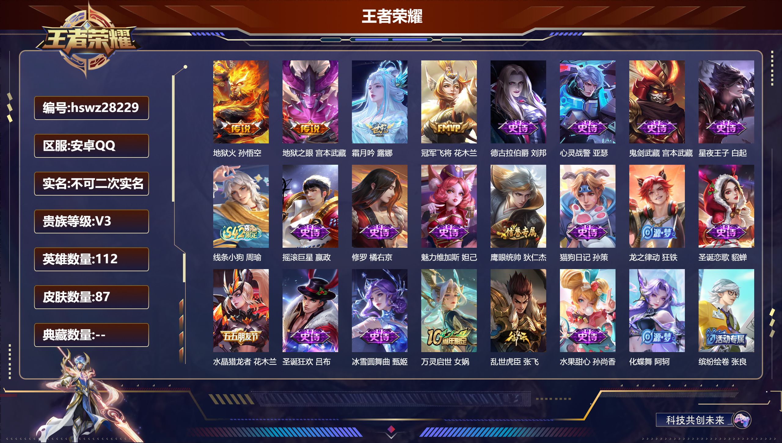 PX_2557776-Q/尊贵铂金/87皮肤/112英雄/0典藏/0珍品无双/0无双/0珍品传说/4传说/19史诗/5稀有英雄 【4,传说皮肤】地狱火,孙悟空,地狱之眼,宫本武藏,霜月吟,露娜,冠军飞将,花木兰, 【19,史诗皮肤】德古拉伯爵,刘邦,心灵战警,亚瑟,鬼剑武藏,宫本武藏,星夜王子,白起,线条小狗,周瑜,摇滚巨星,嬴政,修罗,橘右京,魅力维加斯,妲己,鹰眼统帅,狄仁杰,猫狗日记,孙策,龙之律动,狂铁,圣诞恋歌,貂蝉,水晶猎龙者,花木兰,圣诞狂欢,吕布,冰雪圆舞曲,甄姬,万灵启世,女娲,乱世虎臣,张飞,水果甜心,孙尚香,化蝶舞,阿轲, 【50,勇者皮肤】缤纷绘卷,张良,拳王,达摩,大发明家,达摩,龙舞盛年,沈梦溪,功夫炙烤,廉颇,白色死神,白起,黄金武士,典韦,阴阳师,狄仁杰,古海寻踪,张良,完美运算,后羿,克喵,鬼谷子,哥特玫瑰,露娜,天穹祈灯,鬼谷子,化身博士,扁鹊,阿尔法小队,后羿,无尽旅途,扁鹊,雾影缉谜,兰陵王,潮玩牛仔,马可波罗,死亡骑士,亚瑟,浪漫序章,刘备,敏锐之力,李白,玩偶对对碰,安琪拉,海滩丽影,钟无艳,忍·炎影,赵云,探海日志,鲁班大师,玩趣恶龙,高渐离,兔女郎,花木兰,未来纪元,宫本武藏,荣光之誓,亚瑟,春野之旅,钟无艳,教廷特使,韩信,妄想特派,李元芳,西部大镖客,孙悟空,春野闲踪,苏烈,布丁狗之约,阿古朵,命运加冕,露娜,小满鸭,姬小满,幻想奇妙夜,王昭君,灵野札记,张良,虚灵犬护,钟馗,班班快跑,鲁班七号,漠中幻影,嫦娥,白执事,赵云,剑破天穹,刘邦,熔金海岸,周瑜,谧流熔炉,太乙真人,群星魔术团,程咬金,鹤鸣心笺,艾琳,线条小狗,周瑜,玫蓝誓约,戈娅, 【16,其他皮肤】芝加哥教父,黄忠,龙域领主,铠,灼热之刃,李信,绯红之刃,露娜,海军大将,周瑜,魇语军师,司马懿,午夜歌剧院,元歌,东海龙王,东皇太一,年年有余,猪八戒,幸存者,马超,战争女神,雅典娜,绝影神枪,百里守约,孤猎,澜,踏雪寻梅,弈星,赤焰之缨,云缨,西部大镖客,孙悟空, 【5,稀有英雄】橘右京,夏洛特,娜可露露,韩信,赵云, 营地ID:,