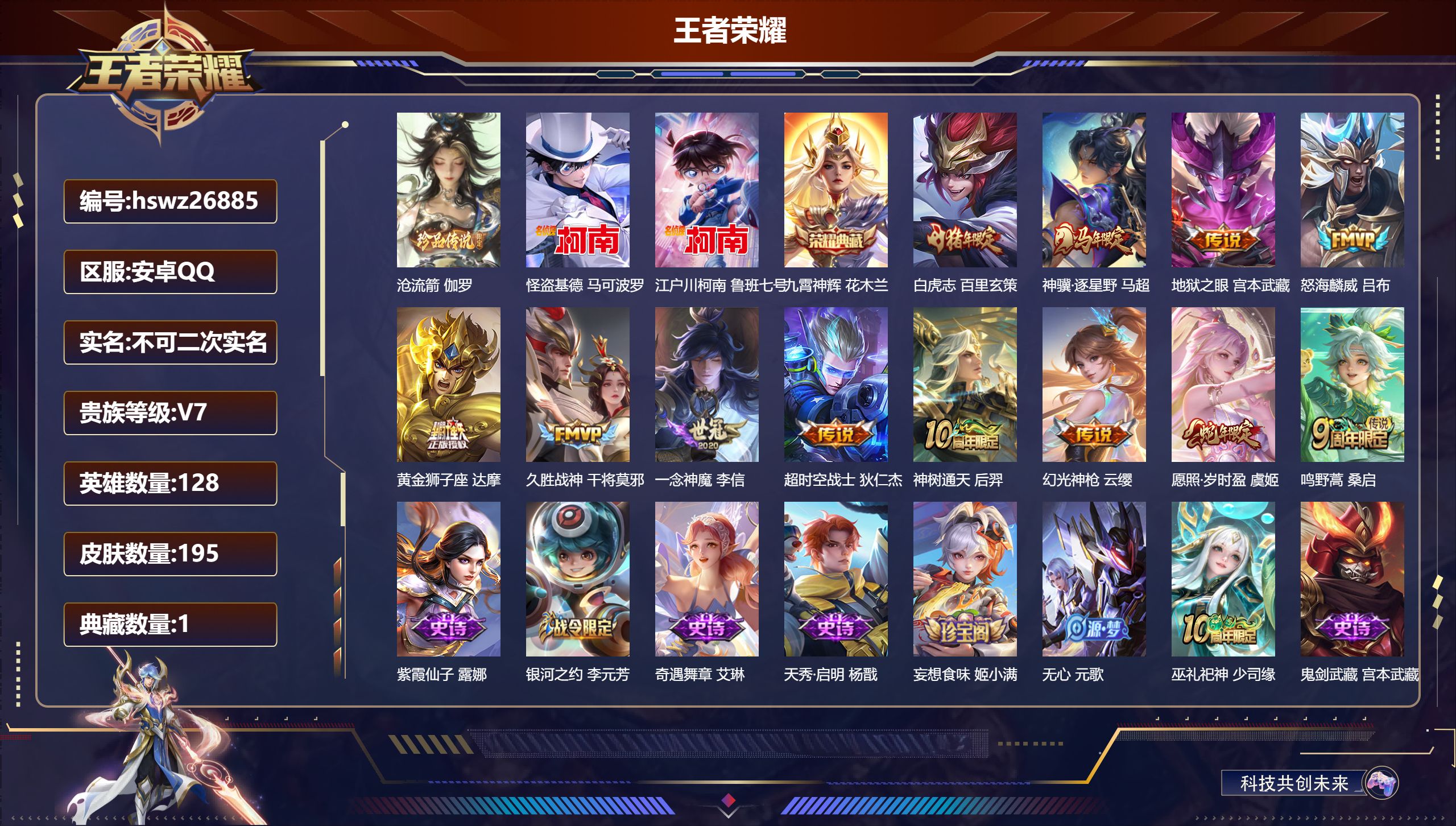 PX_2531113-Q/至圣王者/195皮肤/128英雄/1典藏/0珍品无双/0无双/3珍品传说/12传说/51史诗/9稀有英雄 【3,珍品传说】沧流箭,伽罗,怪盗基德,马可波罗,江户川柯南,鲁班七号, 【1,典藏皮肤】九霄神辉,花木兰, 【12,传说皮肤】白虎志,百里玄策,神骥·逐星野,马超,地狱之眼,宫本武藏,怒海麟威,吕布,黄金狮子座,达摩,久胜战神,干将莫邪,一念神魔,李信,超时空战士,狄仁杰,神树通天,后羿,幻光神枪,云缨,愿照·岁时盈,虞姬,鸣野蒿,桑启, 【51,史诗皮肤】紫霞仙子,露娜,银河之约,李元芳,奇遇舞章,艾琳,天秀·启明,杨戬,妄想食味,姬小满,无心,元歌,巫礼祀神,少司缘,鬼剑武藏,宫本武藏,星夜王子,白起,瓦猫非猫,太乙真人,线条小狗,周瑜,魅力维加斯,妲己,黄金分割率,诸葛亮,女仆咖啡,妲己,九幽镇关,项羽,舞动绿茵,蔡文姬,鹰眼统帅,狄仁杰,胡桃异想国,米莱狄,李小龙,裴擒虎,光弋星穹,莱西奥,特工魅影,百里守约,原初追逐者,百里玄策,奇幻香踪,扁鹊,未来纪元,赵云,石田雨龙,后羿,鸭鸭历险记,刘禅,魔术师,狄仁杰,龙之律动,狂铁,皇家上将,赵云,至尊宝,孙悟空,圣诞恋歌,貂蝉,云间偶戏,元歌,水晶猎龙者,花木兰,涂山容容,公孙离,破空之剑,亚连,罗小黑战记,百里玄策,地狱岩魂,廉颇,蔷薇恋人,孙尚香,月团寄思,沈梦溪,雪上飞焰,哪吒,曙光守护者,铠,箭羽风息,伽罗,谪仙醉月,李白,缤纷独角兽,小乔,百相守梦,百里守约,水果甜心,孙尚香,化蝶舞,阿轲,江河有灵,阿古朵,幽灵船长,曹操,乘风破浪,夏侯惇,暗隐猎兽者,兰陵王, 【101,勇者皮肤】爱心护理,阿轲,沙漠行僧,达摩,大漠名商,沈梦溪,缤纷绘卷,张良,纽约教父,刘备,大发明家,达摩,龙舞盛年,沈梦溪,丁香结,小乔,功夫炙烤,廉颇,海盐诗旅,桑启,汉昭烈帝,刘备,白色死神,白起,黄金武士,典韦,王牌新星,海月,阴阳师,狄仁杰,径山谋武,孙权,次元突破,哪吒,古海寻踪,张良,牛运亨通,牛魔,功夫老勺,老夫子,鲨炮海盗猫,沈梦溪,海滩派对,项羽,踏浪烽翎,莱西奥,演武夺筹,程咬金,西部游侠,莱西奥,哥特玫瑰,露娜,守护之力,大乔,无双福将,程咬金,百相守梦,影,潮玩探月行,猪八戒,鸿运当头,亚瑟,天穹祈灯,鬼谷子,疑决卦,明世隐,潮玩骑士王,亚瑟,阿尔法小队,后羿,金色潮汐,朵莉亚,幻乐之宴,鬼谷子,雾影缉谜,兰陵王,潮玩牛仔,马可波罗,赤刃凌霄,敖隐,死亡骑士,亚瑟,玩偶对对碰,安琪拉,掌控之力,诸葛亮,海滩丽影,钟无艳,落日弦歌,高渐离,忍·炎影,赵云,雪境奇遇,西施,逐霄战戟,吕布,极光幻客,蚩奼,探海日志,鲁班大师,雾都夜雨,干将莫邪,兔女郎,花木兰,流音漫舞,艾琳,金庭之子,兰陵王,罗小黑战记,哪吒,千军破阵,苏烈,往忆晖光,明世隐,零食大作战,姬小满,荣光之誓,亚瑟,花好人间,甄姬,秘密基地,刘禅,教廷特使,韩信,街头霸王,韩信,云中旅人,李元芳,西部大镖客,孙悟空,重装意志,盘古,少女阿狸,妲己,蔚蓝守将,蒙恬,春野闲踪,苏烈,布丁狗之约,阿古朵,命运加冕,露娜,小满鸭,姬小满,灵野札记,张良,驱傩正仪,钟馗,潮玩士官长,雅典娜,鸭鸭历险记,沈梦溪,死霸装,白起,虚灵犬护,钟馗,劲辣红锅,太乙真人,神迹守卫,孙悟空,罗小黑战记,张良,剑破天穹,刘邦,铁骨偃魂,典韦,熔金海岸,周瑜,苍林狼骑,苍,天穹之誓,姜子牙,星梦巡礼,姜子牙,谧流熔炉,太乙真人,金福满堂,东皇太一,经纬探寻者,盘古,暗都幽影,大司命,鹤鸣心笺,艾琳,锦麟游梦,庄周,逆浪荇歌,甄姬,线条小狗,周瑜,百相守梦,老夫子,噬灭天穹,东皇太一,敬我三分,盘古,爆裂喵拳,达摩,玫蓝誓约,戈娅,景韶洛都,明世隐, 【32,其他皮肤】沧流箭,伽罗,金属狂潮,高渐离,圣殿之光,刘邦,花见巫女,伽罗,未来旅行,孙膑,万圣前夜,小乔,海之征途,孙策,木偶奇遇记,鲁班七号,精灵王,后羿,冰刃幻境,镜,碧珀绯影,暃,魇语军师,司马懿,英喵野望,刘禅,午夜歌剧院,元歌,启蛰,司空震,东海龙王,东皇太一,范海辛,李白,激情绿茵,马可波罗,尼罗河女神,女娲,锦衣卫,狄仁杰,威尼斯狂欢,百里玄策,幸存者,马超,荷鲁斯之眼,云中君,绝影神枪,百里守约,森,瑶,孤猎,澜,加勒比小姐,虞姬,秩序猎龙将,蒙恬,天启骑士,关羽,怪盗基德,马可波罗,西部大镖客,孙悟空,江户川柯南,鲁班七号, 【9,稀有英雄】敖隐,嬴政,不知火舞,橘右京,夏洛特,娜可露露,韩信,艾琳,赵云, 营地ID:,