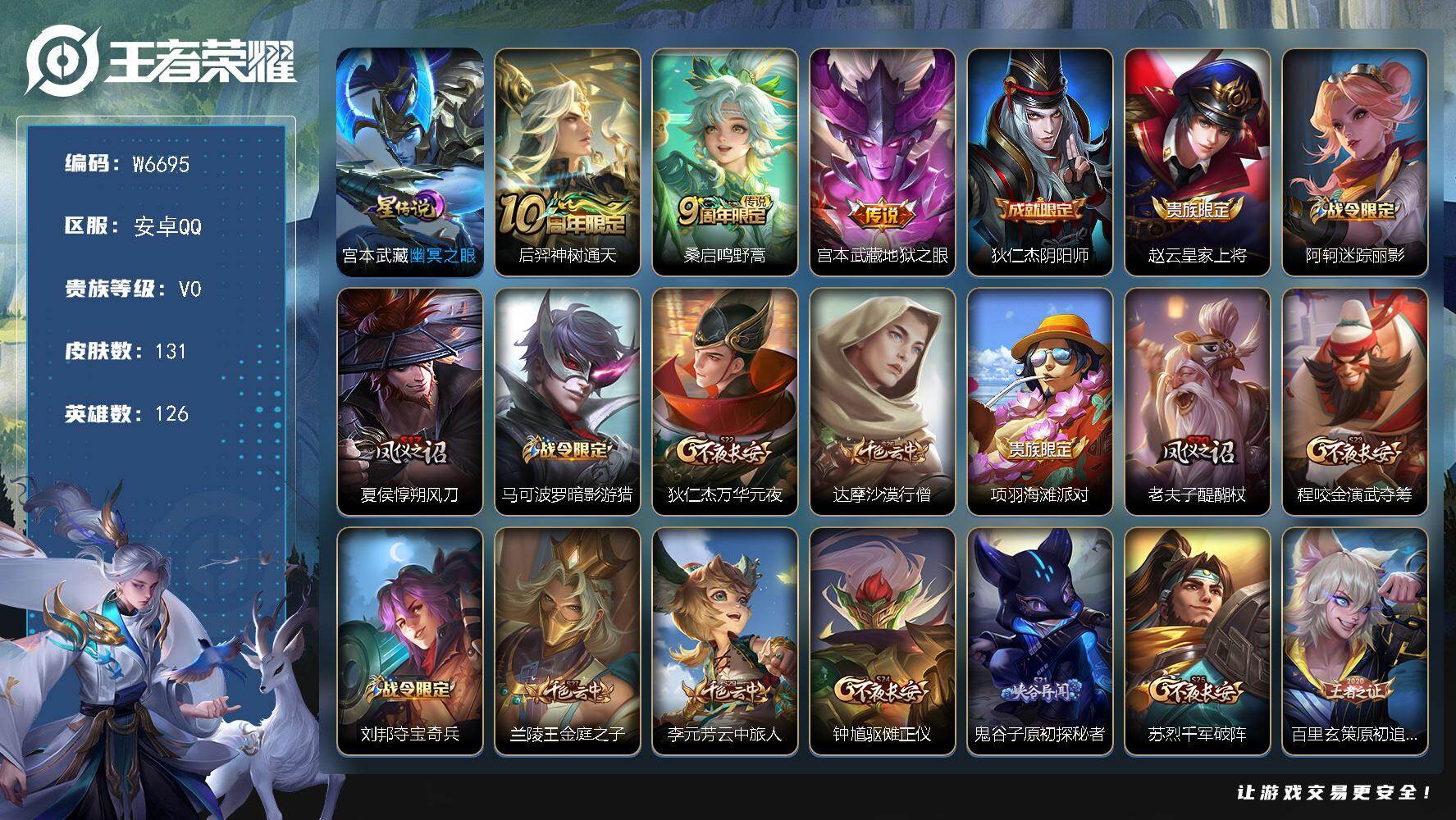 PX_2555829-【W6695】安卓Q区-可二次-贵5-126英雄-130皮肤-3传说-30史诗-47限定-1星元-4按键-地狱之眼/神树通天/涂山容容/万灵启示/龙之律动/真我赫兹/修罗/青蛇/暗隐游猎/水果甜心/幽灵船长/金属风暴-贵族积分5千-营地ID:2126005253 【星元皮肤】:宫本武藏幽冥之眼