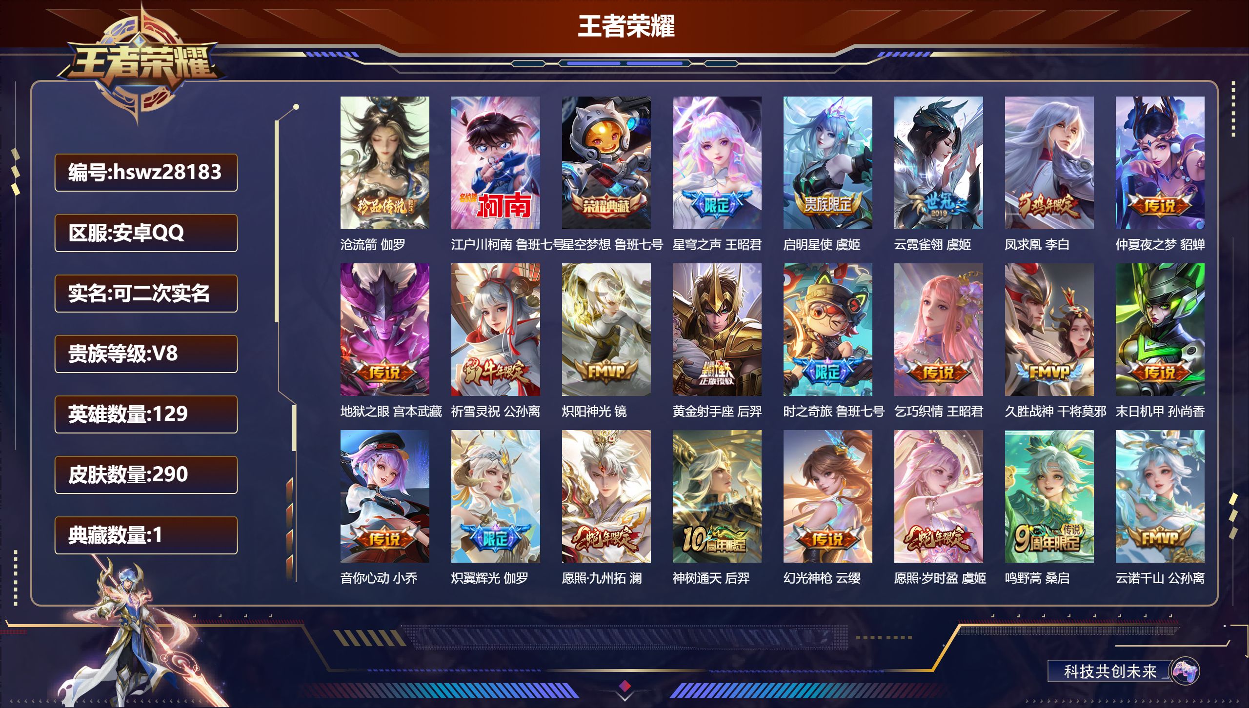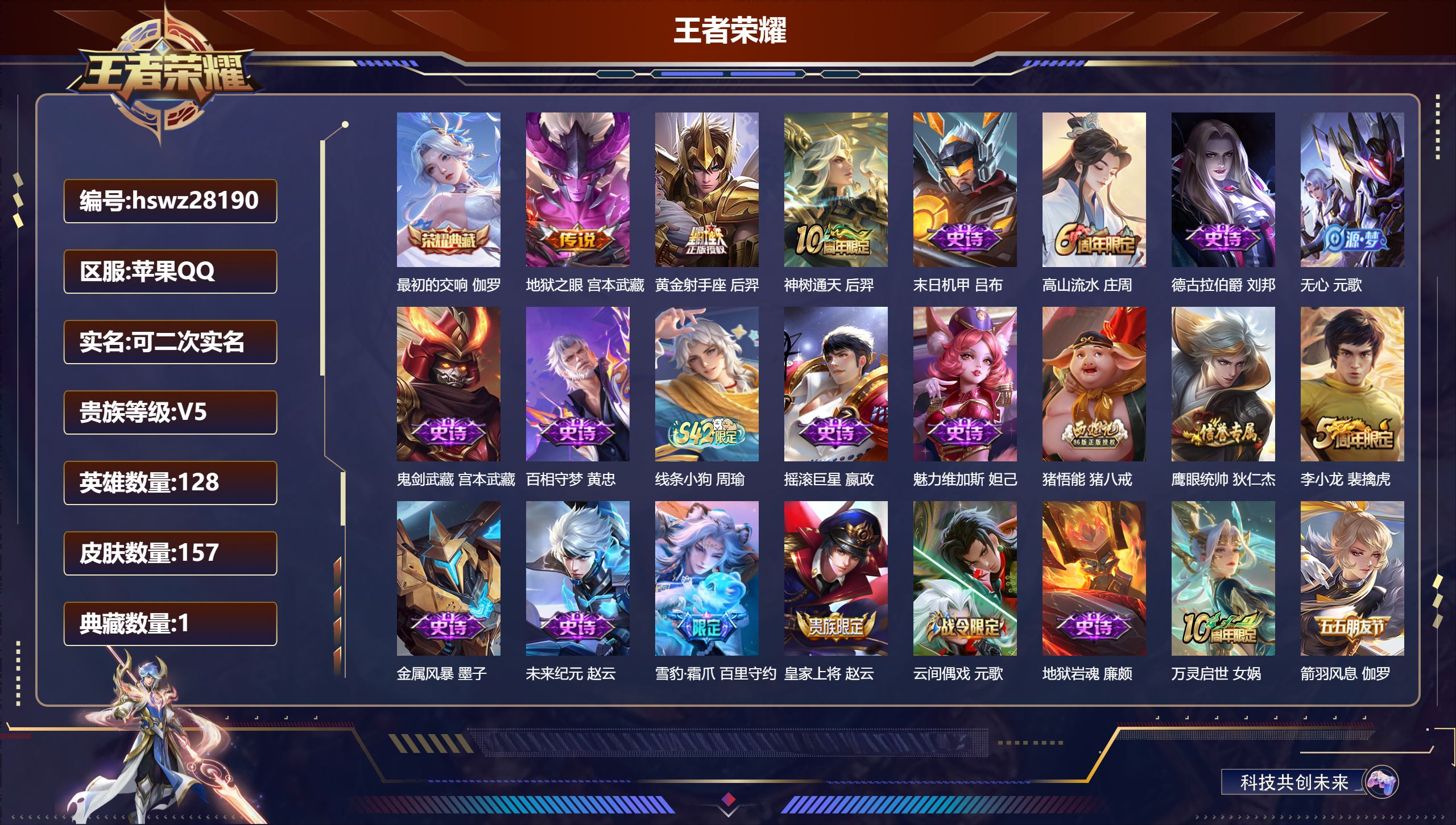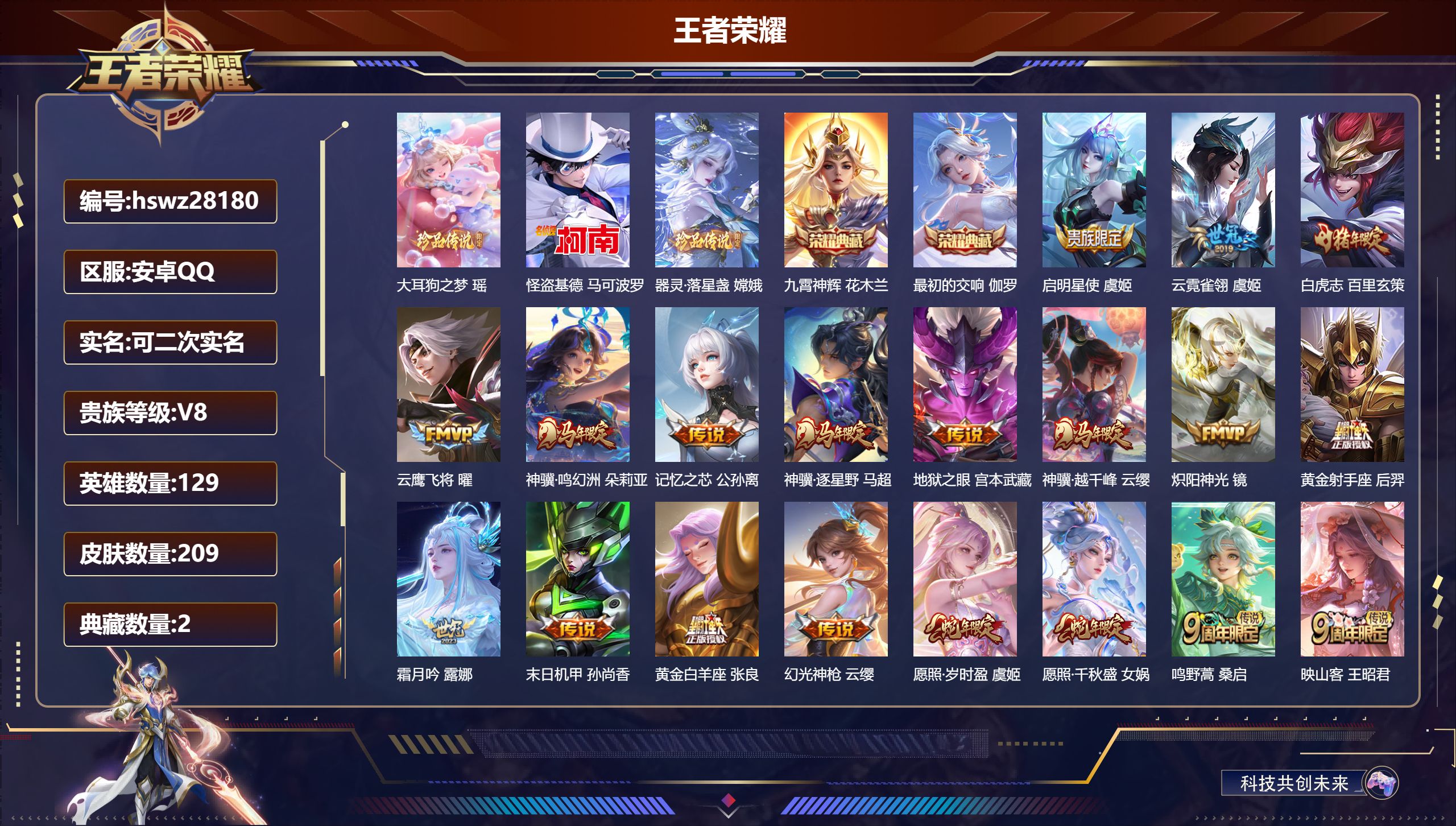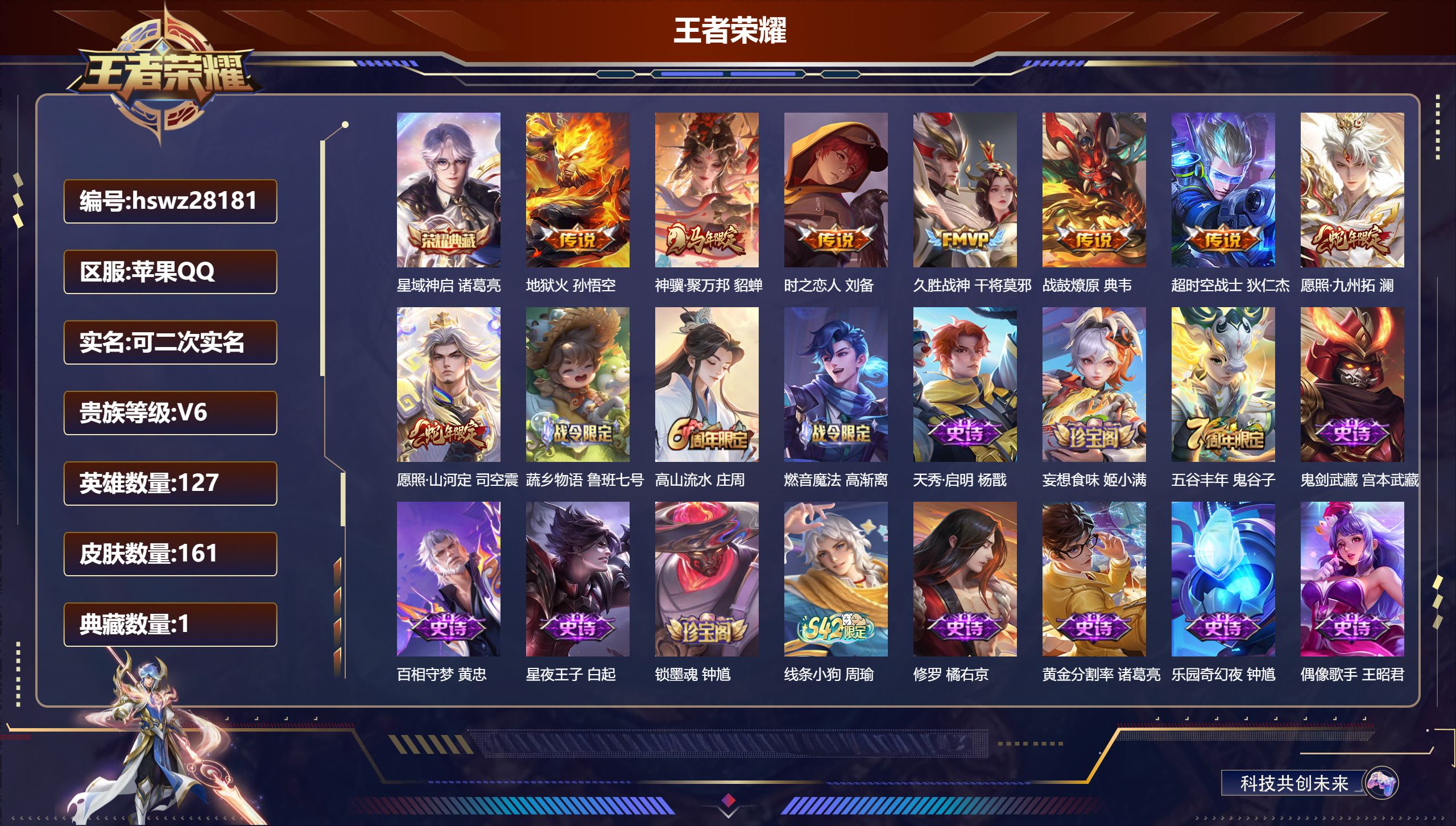 PX_2561664-实名:,可修改,贵族等级:,V6,英雄数:,126,皮肤数:,161,传说皮:,黄金射手座,绛天战甲,炽阳神光,山海·炽霜斩,神树通天,限定皮:,李小龙,飞衡,至尊宝,如梦令-后羿,猪悟能,时之祈愿-云中君,五谷丰年,齐天大圣
