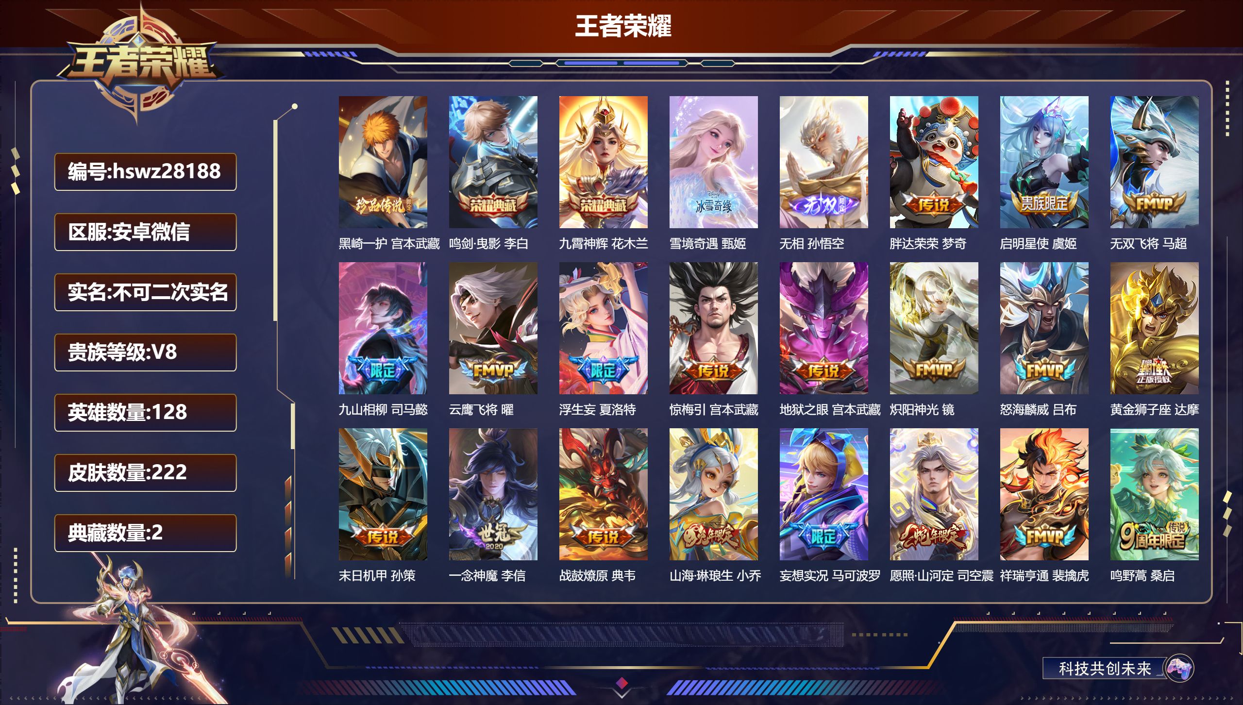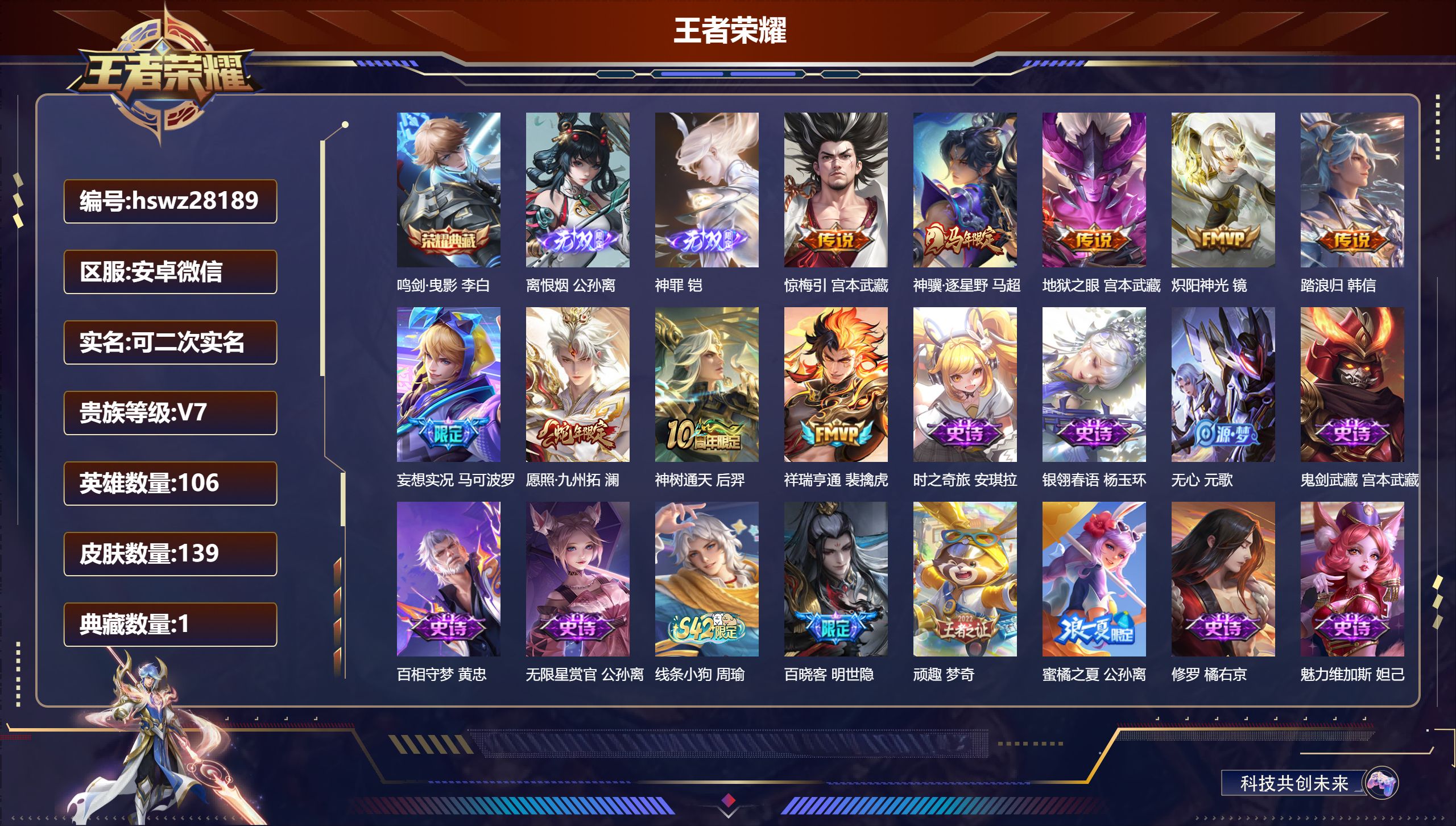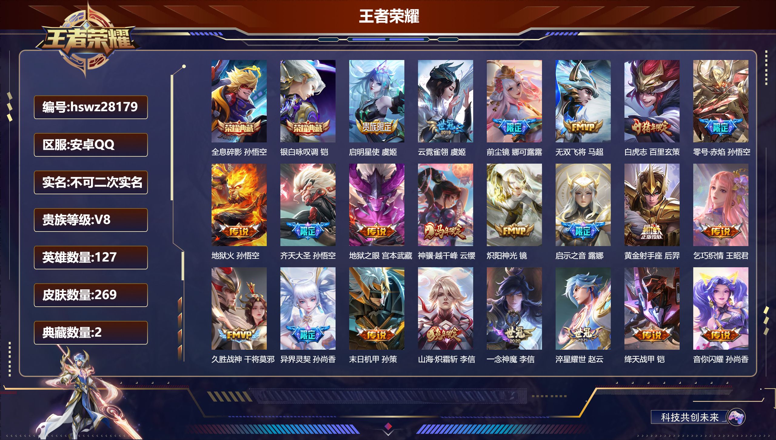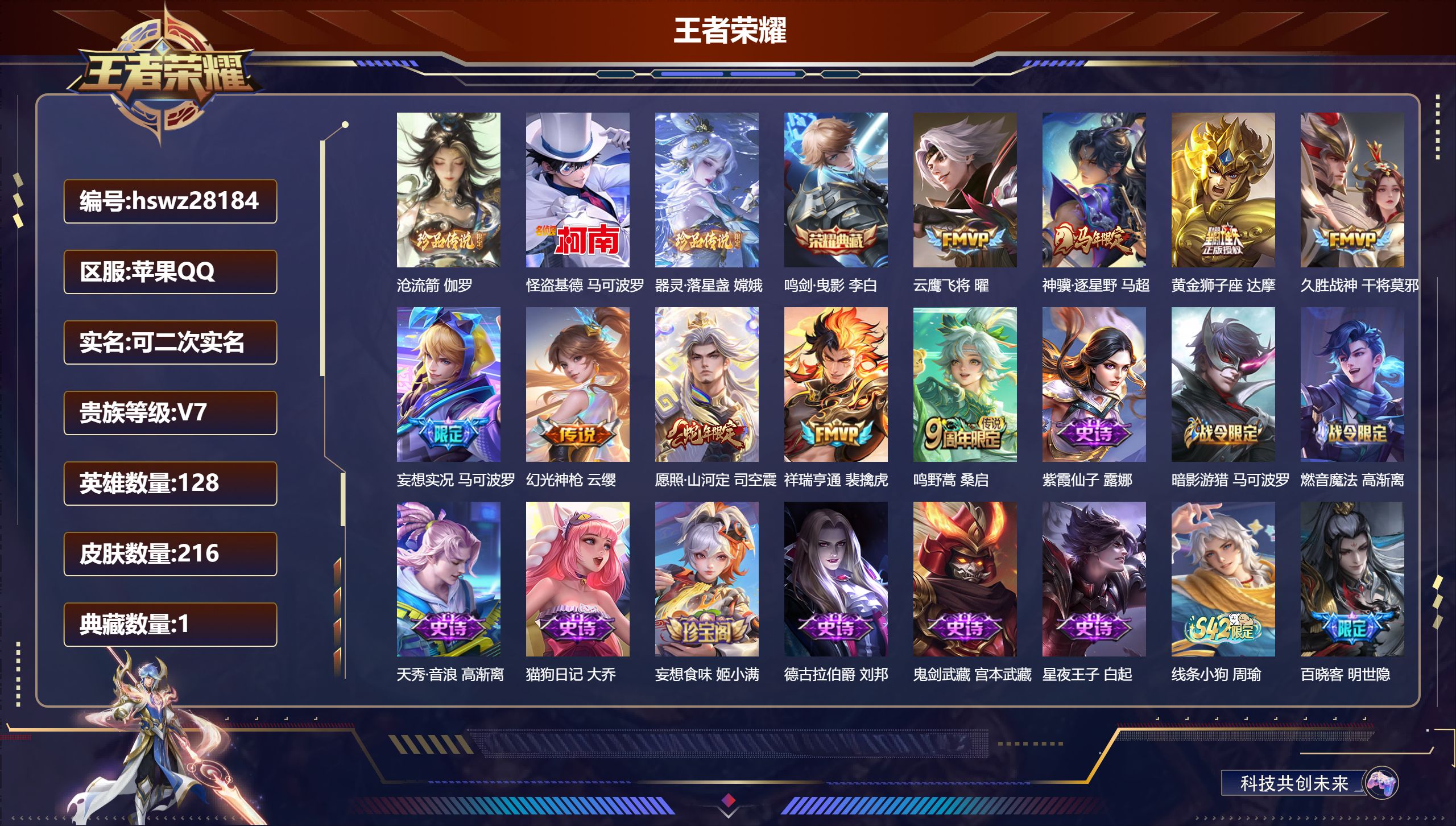 PX_2561664-实名:,可修改,贵族等级:,V6,英雄数:,126,皮肤数:,161,传说皮:,黄金射手座,绛天战甲,炽阳神光,山海·炽霜斩,神树通天,限定皮:,李小龙,飞衡,至尊宝,如梦令-后羿,猪悟能,时之祈愿-云中君,五谷丰年,齐天大圣