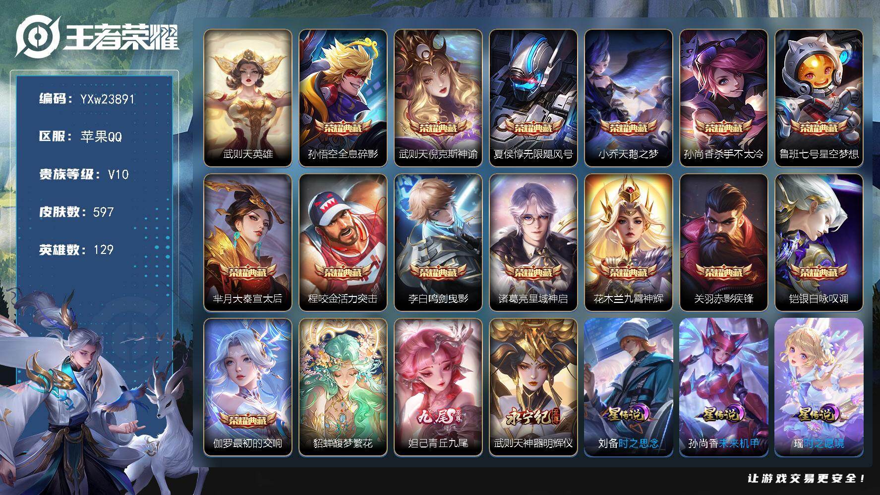 PX_2560279-??V10·4.4W流光积分·597皮·馥梦繁花·15典藏·2无双·4珍品·紫瑶·寅虎焰心·全皮武则天·全皮赵云·凤鸣九霄天幕·挚爱童话天幕·金虎啸春天幕·秋月华灯天幕·可二次】YXw23891-苹果Q-129英雄-597皮肤-9王者印记-300铭文-贵族积分42w【贵族10】【15典藏·1珍品无双·2无双·4珍品·8星传说·81传说·6天幕·47按键·73个性戳戳】【因赛季更新游戏段付以上号为准!】 【英雄全皮】:赵云全皮,刘禅全皮,高渐离全皮,武则天全皮,程咬金全皮,刘邦全皮,孙权全皮,娜可露露全皮,橘右京全皮,张飞全皮,太乙真人全皮,鬼谷子全皮,沈梦溪全皮,狂铁全皮,盾山全皮,猪八戒全皮,敖隐全皮,鲁班大师全皮,阿古朵全皮,夏洛特全皮,金蝉全皮,空空儿全皮,影全皮 【荣耀典藏】:武则天英雄,孙悟空全息碎影,武则天倪克斯神谕,夏侯惇无限飓风号,小乔天鹅之梦,孙尚香杀手不太冷,鲁班七号星空梦想,芈月大秦宣太后,程咬金活力突击,李白鸣剑曳影,诸葛亮星域神启,花木兰九霄神辉,关羽赤影疾锋,铠银白咏叹调,伽罗最初的交响 【珍品无双】:貂蝉馥梦繁花 【无双皮肤】:妲己青丘九尾,武则天神器明辉仪 【珍品传说】:安琪拉酷洛米之心,瑶大耳狗之梦,张飞兔狲蓬尾,孙策时之奇旅 【星元皮肤】:鲁班七号寅虎焰心,狄仁杰星际治安官,刘备时之思念,瑶时之愿境,孙尚香未来机甲,武则天幻海之心,宫本武藏幽冥之眼,貂蝉金色仲夏夜 【天幕】:凤鸣九霄天幕,挚爱童话天幕,金虎啸春天幕,秋月华灯天幕,共赏芳华天幕,鲲天幕 【传说皮肤】:王昭君长夜焕生,后羿神树通天,桑启鸣野蒿,赵云乘龙铭钟鼎,艾琳觅芳踪,东皇太一灼幽烈阳,亚瑟追逃游戏,安琪拉追逃游戏,张飞百相守梦,公孙离记忆之芯,夏洛特浮生妄,干将莫邪画中仙,花木兰燃星之曲,虞姬无限倾心,项羽无限倾心,伽罗炽翼辉光,孙悟空齐天大圣,小乔山海琳琅生,曜山海苍雷引,李信山海炽霜斩,吕布怒海麟威,李白诗剑行,狄仁杰神器狴犴令,不知火舞绯月行,王昭君星穹之声,百里守约碎云,橘右京枫霜尽,娜可露露前尘镜,孙尚香音你闪耀,马可波罗深海之息,后羿无尽星芒,马超无双飞将,大乔挚爱花嫁,孙策挚爱之约,露娜启示之音,蔡文姬花朝如约,女娲补天,孙策末日机甲,瑶时之祈愿,裴擒虎寅虎赤拳,鲁班七号寅虎瑞焰,孙尚香异界灵契,貂蝉遇见胡旋,赵云淬星耀世,王昭君乞巧织情,西施游龙清影,曜李逍遥,,周瑜音你心动,小乔音你心动,李元芳飞鸢探春,兰陵王默契交锋,公孙离祈雪灵祝,诸葛亮时雨天司,铠绛天战甲,镜炽阳神光,虞姬启明星使,孙悟空零号赤焰,关羽武圣,曜云鹰飞将,李信一念神魔,刘备时之恋人,伽罗太华,貂蝉猫影幻舞,张良黄金白羊座,干将莫邪久胜战神,虞姬云霓雀翎,达摩黄金狮子座,百里玄策白虎志,花木兰冠军飞将,梦奇胖达荣荣,后羿黄金射手座,杨戬永曜之星,诸葛亮武陵仙君,貂蝉仲夏夜之梦,李白凤求凰,孙尚香末日机甲,宫本武藏地狱之眼,孙悟空地狱火,吕布天魔缭乱,武则天海洋之心,狄仁杰超时空战士 【限定皮肤】:白起狰,蔡文姬夏日便利店,虞姬夏日便利店,姜子牙天穹之誓,狄仁杰阴阳师,小乔纯白花嫁,虞姬凯尔特女王,廉颇寅虎御盾,小乔山海琳琅生,赵云皇家上将,赵云引擎之心,赵云龙胆,赵云百木心枪,墨子神迹守卫,墨子降魔,妲己热情桑巴,妲己时之彼端,妲己时之奇旅,嬴政白昼王子,孙尚香蔷薇恋人,孙尚香异界灵契,鲁班七号狮舞东方,鲁班七号乒乒小将,鲁班七号寅虎瑞焰,庄周云端筑梦师,庄周玄嵩,庄周高山流水,高渐离死亡摇滚,高渐离玩趣恶龙,阿轲迷踪丽影,钟无艳王者之锤,钟无艳超时空战士,孙膑天狼运算者,孙膑寅虎展翼,扁鹊奇幻香踪,白起夜都怪侠,芈月重明,芈月白晶晶,芈月幻夜卜梦,吕布天魔缭乱,吕布猎兽之王,吕布御风骁将,周瑜真爱至上,周瑜赤莲之焰,元歌云间偶戏,元歌无心,夏侯惇朔风刀,夏侯惇匿光决锋者,甄姬幽恒,甄姬女儿国国王,甄姬游园惊梦,甄姬落雪兰心,曹操烛龙,曹操天狼征服者,典韦穷奇,典韦蓝屏警告,典韦岱宗,马可波罗逐梦之星,马可波罗暗影游猎,马可波罗深海之息,马可波罗山海玄木吟,狄仁杰魔术师,狄仁杰万华元夜,狄仁杰神器狴犴令,达摩星际陆战队,达摩沙漠行僧,项羽海滩派对,项羽霸王别姬,项羽无限倾心,老夫子圣诞老人,老夫子醍醐杖,老夫子航海奇遇记,关羽冰锋战神,关羽武圣,关羽百相守梦,貂蝉逐梦之音,貂蝉遇见胡旋,安琪拉追逃游戏,程咬金演武夺筹,露娜一生所爱,露娜启示之音,刘邦夺宝奇兵,韩信逐梦之影,韩信飞衡,韩信傲雪梅枪,王昭君凤凰于飞,王昭君午后时光,王昭君星穹之声,兰陵王默契交锋,兰陵王驯魔猎人,兰陵王金庭之子,花木兰青春决赛季,花木兰瑞麟志,花木兰默契交锋,花木兰燃星之曲,不知火舞绯月行,娜可露露前尘镜,橘右京枫霜尽,亚瑟潮玩骑士王,亚瑟追逃游戏,孙悟空美猴王,孙悟空至尊宝,孙悟空大圣娶亲,孙悟空零号赤焰,孙悟空孙行者,孙悟空齐天大圣,牛魔御旌,牛魔奔雷神使,后羿辉光之辰,后羿如梦令,后羿圣弓游侠,后羿无尽星芒,刘备百相守梦,张飞虎魄,张飞百相守梦,李元芳银河之约,李元芳云中旅人,虞姬霸王别姬,虞姬启明星使,虞姬无限倾心,钟馗神迹守卫,钟馗驱傩正仪,杨玉环遇见飞天,杨玉环寅虎心曲,杨戬永曜之星,杨戬潮玩骑兵,女娲朔望之晖,女娲补天,干将莫邪冰霜恋舞曲,干将莫邪胡桃夹子,干将莫邪真爱魔法,干将莫邪画中仙,雅典娜单词
