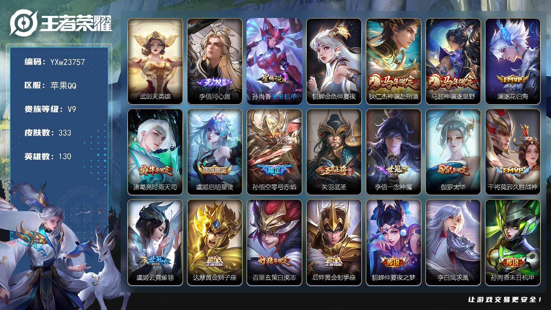 PX_2560275-??主推·问心剑·绝版梅西·白虎志·神骥赴朔漠·神骥逐星野·武圣·时雨天司·太华·凤求凰·可二次】YXw23757-苹果Q-130英雄-333皮肤-11王者印记-300铭文-贵族积分10w【贵族9】【1典藏·1无双·2星传说·21传说·7按键】【因赛季更新游戏段付以上号为准!】 【英雄全皮】:孙权全皮,敖隐全皮 【荣耀典藏】:武则天英雄 【无双皮肤】:李信问心剑 【星元皮肤】:孙尚香未来机甲,貂蝉金色仲夏夜 【传说皮肤】:狄仁杰神骥赴朔漠,马超神骥逐星野,澜逐花归海,诸葛亮时雨天司,虞姬启明星使,孙悟空零号赤焰,关羽武圣,李信一念神魔,伽罗太华,干将莫邪久胜战神,虞姬云霓雀翎,达摩黄金狮子座,百里玄策白虎志,后羿黄金射手座,貂蝉仲夏夜之梦,李白凤求凰,孙尚香末日机甲,宫本武藏地狱之眼,孙悟空地狱火,武则天海洋之心,狄仁杰超时空战士 【限定皮肤】:白起狰,狄仁杰阴阳师,赵云皇家上将,赵云引擎之心,墨子神迹守卫,妲己时之彼端,嬴政白昼王子,孙尚香蔷薇恋人,鲁班七号狮舞东方,高渐离死亡摇滚,阿轲迷踪丽影,芈月重明,芈月白晶晶,吕布猎兽之王,吕布御风骁将,周瑜赤莲之焰,元歌云间偶戏,夏侯惇朔风刀,曹操烛龙,典韦穷奇,典韦蓝屏警告,马可波罗逐梦之星,马可波罗暗影游猎,狄仁杰魔术师,狄仁杰万华元夜,达摩星际陆战队,达摩沙漠行僧,项羽海滩派对,老夫子醍醐杖,老夫子航海奇遇记,关羽冰锋战神,关羽武圣,程咬金演武夺筹,刘邦夺宝奇兵,韩信逐梦之影,韩信飞衡,兰陵王驯魔猎人,亚瑟潮玩骑士王,孙悟空至尊宝,孙悟空大圣娶亲,孙悟空零号赤焰,牛魔御旌,后羿辉光之辰,后羿如梦令,李元芳银河之约,虞姬启明星使,钟馗神迹守卫,钟馗驱傩正仪,女娲朔望之晖,干将莫邪冰霜恋舞曲,雅典娜单词大作战,雅典娜黎明之约,蔡文姬繁星吟游,太乙真人饕餮,东皇太一逐梦之光,鬼谷子原初探秘者,诸葛亮时雨天司,大乔白鹤梁神女,黄忠烈魂,苏烈千军破阵,百里玄策白虎志,百里玄策原初追逐者,弈星混沌棋,沈梦溪星空之诺,明世隐疑决卦,裴擒虎李小龙,狂铁御狮,米莱狄御霄,米莱狄胡桃异想国,云中君纤云弄巧,伽罗太华,伽罗天狼溯光者,盾山御銮,猪八戒西部大镖客,上官婉儿梁祝,上官婉儿天狼绘梦者,嫦娥如梦令,蒙犽狂想玩偶喵,裴擒虎梅西,妲己灵卜魔法,姬小满妄想食味 【年限皮肤】:李白凤求凰,后羿辉光之辰,百里玄策白虎志,伽罗太华,韩信飞衡,诸葛亮时雨天司,吕布御风骁将 【赛季限定】:白起狰,太乙真人饕餮,曹操烛龙,芈月重明,典韦穷奇,狂铁御狮,米莱狄御霄,牛魔御旌,盾山御銮,夏侯惇朔风刀,弈星混沌棋,明世隐疑决卦,老夫子醍醐杖,鬼谷子原初探秘者,狄仁杰万华元夜,程咬金演武夺筹,钟馗驱傩正仪,苏烈千军破阵,达摩沙漠行僧,太乙真人谧流熔炉,亚瑟荣光之誓,百里玄策原初追逐者,雅典娜黎明之约,项羽九幽镇关 【战令限定】:嬴政白昼王子,吕布猎兽之王,典韦蓝屏警告,女娲朔望之晖,鲁班七号狮舞东方,钟馗神迹守卫,兰陵王驯魔猎人,周瑜赤莲之焰,李元芳银河之约,沈梦溪星空之诺,阿轲迷踪丽影,刘邦夺宝奇兵,马可波罗暗影游猎,猪八戒西部大镖客,蒙犽狂想玩偶喵,雅典娜单词大作战,元歌云间偶戏,亚瑟潮玩骑士王,米莱狄胡桃异想国,达摩星际陆战队,老夫子航海奇遇记,墨子神迹守卫,妲己灵卜魔法,莱西奥光弋星穹,明世隐往忆晖光,周瑜线条小狗,小乔线条小狗 【史诗皮肤】:周瑜线条小狗,小乔线条小狗,项羽九幽镇关,少司缘巫礼祀神,莱西奥光弋星穹,扁鹊灵蛊蚀心,狂铁龙之律动,赵怀真器灵浮梦炉,姬小满妄想食味,妲己灵卜魔法,夏洛特永昼,哪吒雪上飞焰,雅典娜黎明之约,司马懿暗渊魔法,沈梦溪月团寄思,杨戬天秀启明,大乔白鹤梁神女,伽罗天狼溯光者,老夫子航海奇遇记,米莱狄胡桃异想国,吕布御风骁将,芈月白晶晶,元歌云间偶戏,云中君纤云弄巧,裴擒虎李小龙,百里玄策原初追逐者,蒙犽狂想玩偶喵,马可波罗暗影游猎,上官婉儿天狼绘梦者,黄忠烈魂,瑶遇见神鹿,橘右京修罗,阿轲迷踪丽影,不知火舞魅语,后羿如梦令,嫦娥如梦令,妲己时之彼端,韩信飞衡,娜可露露晚萤,李元芳银河之约,蔡文姬繁星吟游,上官婉儿梁祝,兰陵王驯魔猎人,公孙离无限星赏官,狄仁杰鹰眼统帅,鲁班七号狮舞东方,伽罗箭羽风息,典韦蓝屏警告,孙悟空大圣娶亲,干将莫邪冰霜恋舞曲,大乔猫狗日记,孙策猫狗日记,嬴政白昼王子,东皇太一逐梦之光,阿轲节奏热浪,白起星夜王子,程咬金功夫厨神,李元芳逐浪之夏,刘禅天才门将,裴擒虎梅西,蔡文姬舞动绿茵,铠曙光守护者,百里守约特工魅影,后羿辉光之辰,安琪拉心灵骇客,亚瑟心灵战警,马可波罗逐梦之星,诸葛亮黄金分割率,兰陵王暗隐猎兽者,小乔缤纷独角兽,夏侯惇乘风破浪,韩信逐梦之影,刘邦德古拉伯爵,花木兰水晶猎龙者,赵云引擎之心,孙悟空至尊宝,关羽冰锋战神,韩信白龙吟,张飞乱世虎臣,吕布末日机甲,李白千年之狐,曹操幽灵船长,刘禅绅士熊喵,吕布圣诞狂欢,墨子金属风暴,墨子龙骑士,妲己女仆咖啡,妲己魅力维加斯,嬴政摇滚巨星,嬴政暗夜贵公子,孙尚香水果甜心,孙尚香蔷薇恋人,宫本武藏鬼剑武藏,廉颇地狱岩魂,狄仁杰魔术师,王昭君偶像歌手,甄姬冰雪圆舞曲,貂蝉圣诞恋歌,赵云未来纪元,赵云皇家上将,露娜紫霞仙子,项羽苍穹之光 【其他皮肤】:影百相守梦,吕布舞狮寰,兰陵王雾影缉谜,桑启线条小狗,蒙恬苍云破阵,安琪拉糖果