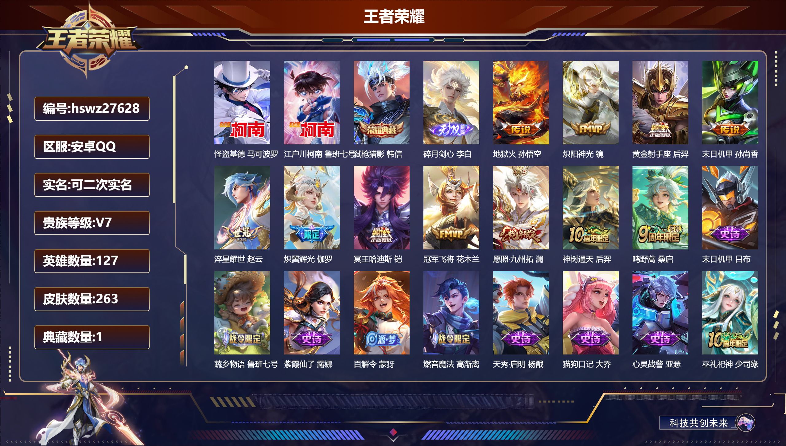 PX_2543365-Q/无双王者/263皮肤/127英雄/1典藏/0珍品无双/1无双/2珍品传说/11传说/68史诗/8稀有英雄 【2,珍品传说】怪盗基德,马可波罗,江户川柯南,鲁班七号, 【1,典藏皮肤】弑枪猎影,韩信, 【1,无双皮肤】碎月剑心,李白, 【11,传说皮肤】地狱火,孙悟空,炽阳神光,镜,黄金射手座,后羿,末日机甲,孙尚香,淬星耀世,赵云,炽翼辉光,伽罗,冥王哈迪斯,铠,冠军飞将,花木兰,愿照·九州拓,澜,神树通天,后羿,鸣野蒿,桑启, 【68,史诗皮肤】末日机甲,吕布,蔬乡物语,鲁班七号,紫霞仙子,露娜,百解令,蒙犽,燃音魔法,高渐离,天秀·启明,杨戬,猫狗日记,大乔,心灵战警,亚瑟,巫礼祀神,少司缘,鬼剑武藏,宫本武藏,迷踪丽影,阿轲,星夜王子,白起,无限星赏官,公孙离,线条小狗,周瑜,摇滚巨星,嬴政,顽趣,梦奇,拒霜思,嫦娥,魅力维加斯,妲己,黄金分割率,诸葛亮,偶像歌手,王昭君,荣光圣徽,蒙恬,白蛇,大乔,九幽镇关,项羽,晚萤,娜可露露,猪悟能,猪八戒,舞动绿茵,蔡文姬,繁星吟游,蔡文姬,暗夜贵公子,嬴政,鹰眼统帅,狄仁杰,光弋星穹,莱西奥,纤云弄巧,云中君,金属风暴,墨子,特工魅影,百里守约,猫狗日记,孙策,原初追逐者,百里玄策,逐浪之夏,李元芳,未来纪元,赵云,鸭鸭历险记,刘禅,魔术师,狄仁杰,顽岩魄,蒙犽,皇家上将,赵云,至尊宝,孙悟空,辉光之辰,后羿,功夫厨神,程咬金,东方月初,大司命,破空之剑,亚连,百木心枪,赵云,怒海争锋,黄忠,青焰无极,镜,器灵·浮梦炉,赵怀真,罗小黑战记,百里玄策,夏日便利店,蔡文姬,星界战将,牛魔,冰雪圆舞曲,甄姬,青蛇,小乔,千年之狐,李白,节奏热浪,阿轲,曙光守护者,铠,万灵启世,女娲,箭羽风息,伽罗,乱世虎臣,张飞,陌上桑,艾琳,百相守梦,百里守约,线条小狗,小乔,时之恋人,孙尚香,水果甜心,孙尚香,幽灵船长,曹操,暗隐猎兽者,兰陵王, 【117,勇者皮肤】时空谍影,海诺,圆桌骑士,盾山,沙漠行僧,达摩,大漠名商,沈梦溪,暖冬絮语,程咬金,缤纷绘卷,张良,大发明家,达摩,龙舞盛年,沈梦溪,丁香结,小乔,功夫炙烤,廉颇,沉稳之力,孙尚香,海盐诗旅,桑启,醍醐杖,老夫子,汉昭烈帝,刘备,白色死神,白起,阴阳师,狄仁杰,径山谋武,孙权,次元突破,哪吒,古海寻踪,张良,功夫老勺,老夫子,西部大镖客,牛魔,鲨炮海盗猫,沈梦溪,海滩派对,项羽,完美运算,后羿,万华元夜,狄仁杰,踏浪烽翎,莱西奥,演武夺筹,程咬金,红桃皇后,芈月,守护之力,大乔,无双福将,程咬金,瓷语鉴心,露娜,百相守梦,影,原初探秘者,鬼谷子,潮玩探月行,猪八戒,鸿运当头,亚瑟,天穹祈灯,鬼谷子,疑决卦,明世隐,五福同心,张飞,金色潮汐,朵莉亚,星际陆战队,程咬金,幻乐之宴,鬼谷子,东方不败,武则天,虹云星官,明世隐,雾影缉谜,兰陵王,赤刃凌霄,敖隐,死亡骑士,亚瑟,敏锐之力,李白,玩偶对对碰,安琪拉,海滩丽影,钟无艳,忍·炎影,赵云,万事如意,刘备,逐霄战戟,吕布,擒涛扼浪,裴擒虎,乓乓大师,鲁班大师,探海日志,鲁班大师,女武神,艾琳,天使之翼,孙膑,雾都夜雨,干将莫邪,兔女郎,花木兰,龙腾万里,关羽,金庭之子,兰陵王,罗小黑战记,哪吒,千军破阵,苏烈,往忆晖光,明世隐,荣光之誓,亚瑟,花好人间,甄姬,万象初新,宫本武藏,潮玩造梦师,刘备,时尚教父,姜子牙,春野之旅,钟无艳,秘密基地,刘禅,教廷特使,韩信,黑猫爱糖果,李元芳,云中旅人,李元芳,妄想特派,李元芳,西部大镖客,孙悟空,蔬乡物语,李元芳,少女阿狸,妲己,灵卜魔法,妲己,混沌棋,弈星,蔚蓝守将,蒙恬,契约魔法,米莱狄,布丁狗之约,阿古朵,命运加冕,露娜,小满鸭,姬小满,幻想奇妙夜,王昭君,驱傩正仪,钟馗,鸭鸭历险记,沈梦溪,特工战影,狂铁,虚灵犬护,钟馗,漠中幻影,嫦娥,白执事,赵云,劲辣红锅,太乙真人,神迹守卫,孙悟空,剑破天穹,刘邦,苍威无极,项羽,熔金海岸,周瑜,苍林狼骑,苍,天穹之誓,姜子牙,星梦巡礼,姜子牙,破阵·退雄兵,杨戬,谧流熔炉,太乙真人,金福满堂,东皇太一,群星魔术团,程咬金,暗都幽影,大司命,夏日便利店,虞姬,鹤鸣心笺,艾琳,锦麟游梦,庄周,云械蓝图,云中君,逆浪荇歌,甄姬,线条小狗,周瑜,线条小狗,桑启,百相守梦,老夫子,噬灭天穹,东皇太一,敬我三分,盘古,怪诞之夜,米莱狄,景韶洛都,明世隐, 【67,其他皮肤】伊势巫女,大乔,前尘,金蝉,战争骑士,夏侯惇,圣殿之光,刘邦,潮流仙人,老夫子,三太子,哪吒,极冰防御线,盾山,龙域领主,铠,生化警戒,钟无艳,花见巫女,伽罗,爱与和平,苏烈,未来旅行,孙膑,第七人偶,干将莫邪,万圣前夜,小乔,灼热之刃,李信,海之征途,孙策,木偶奇遇记,鲁班七号,福禄兄弟,鲁班七号,精灵王,后羿,绯红之刃,露娜,冰刃幻境,镜,碧珀绯影,暃,星航指挥官,诸葛亮,魇语军师,司马懿,英喵野望,刘禅,午夜歌剧院,元歌,启蛰,司空震,霓裳曲,杨玉环,花间舞,公孙离,异域舞娘,貂蝉,街头旋风,裴擒虎,东海龙王,东皇太一,修竹墨客,上官婉儿,范海辛,李白,维京掠夺者,苍,占星师,明世隐,激情绿茵,马可波罗,埃及法老,杨戬,归虚梦演,西施,画中游,桑启,年年有余,猪八戒,尼罗河女神,女娲,一千零一夜,张良,华尔街大亨,程咬金,威尼斯狂欢,百里玄策,幸存者,马超,战争女神,雅典娜,荷鲁斯之眼,云中君,创世神祝,盘古,特种部队,李元芳,绝影神枪,百里守约,蔷薇王座,蔡文姬,森,瑶,孤猎,澜,加勒比小姐,虞姬,踏雪寻梅,弈星,秩序猎龙将,蒙恬,精准探案法,米莱狄,精灵公主,王昭君,赤焰之缨,云缨,露花倒影,嫦娥,地府判官,钟馗,美梦成真,梦奇,天启骑士,关羽,怪盗基德,马可波罗,西部大镖客,孙悟