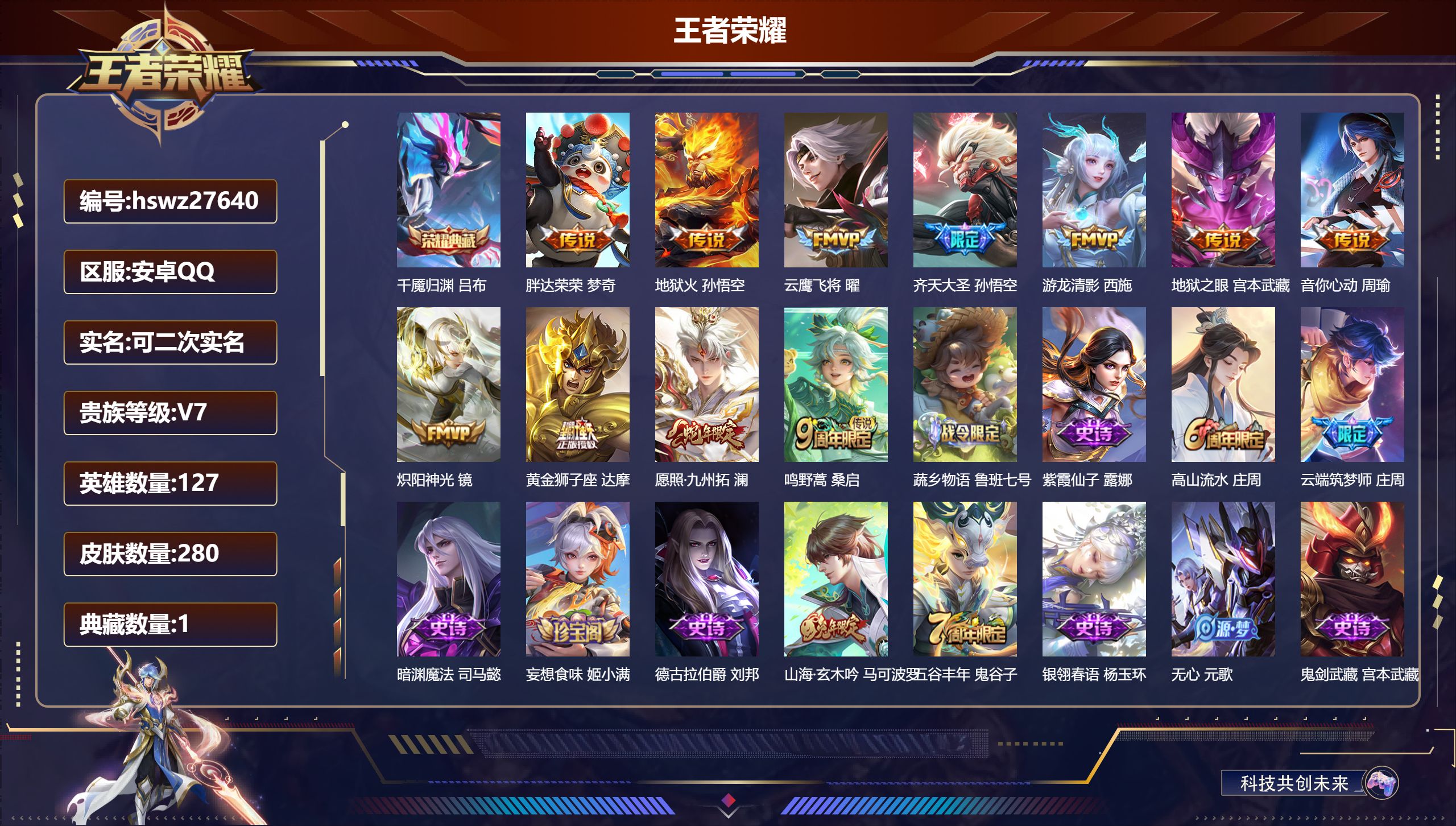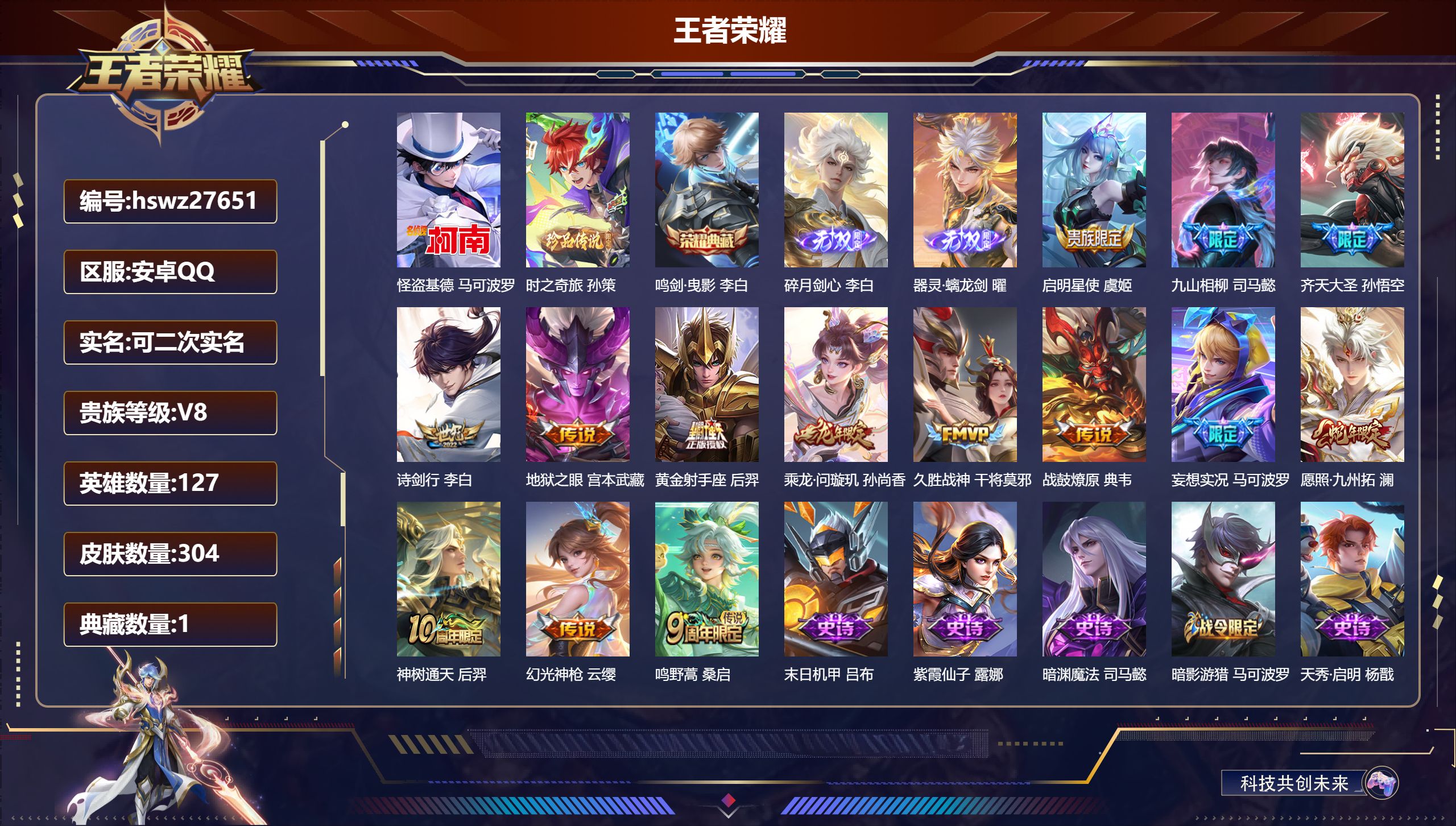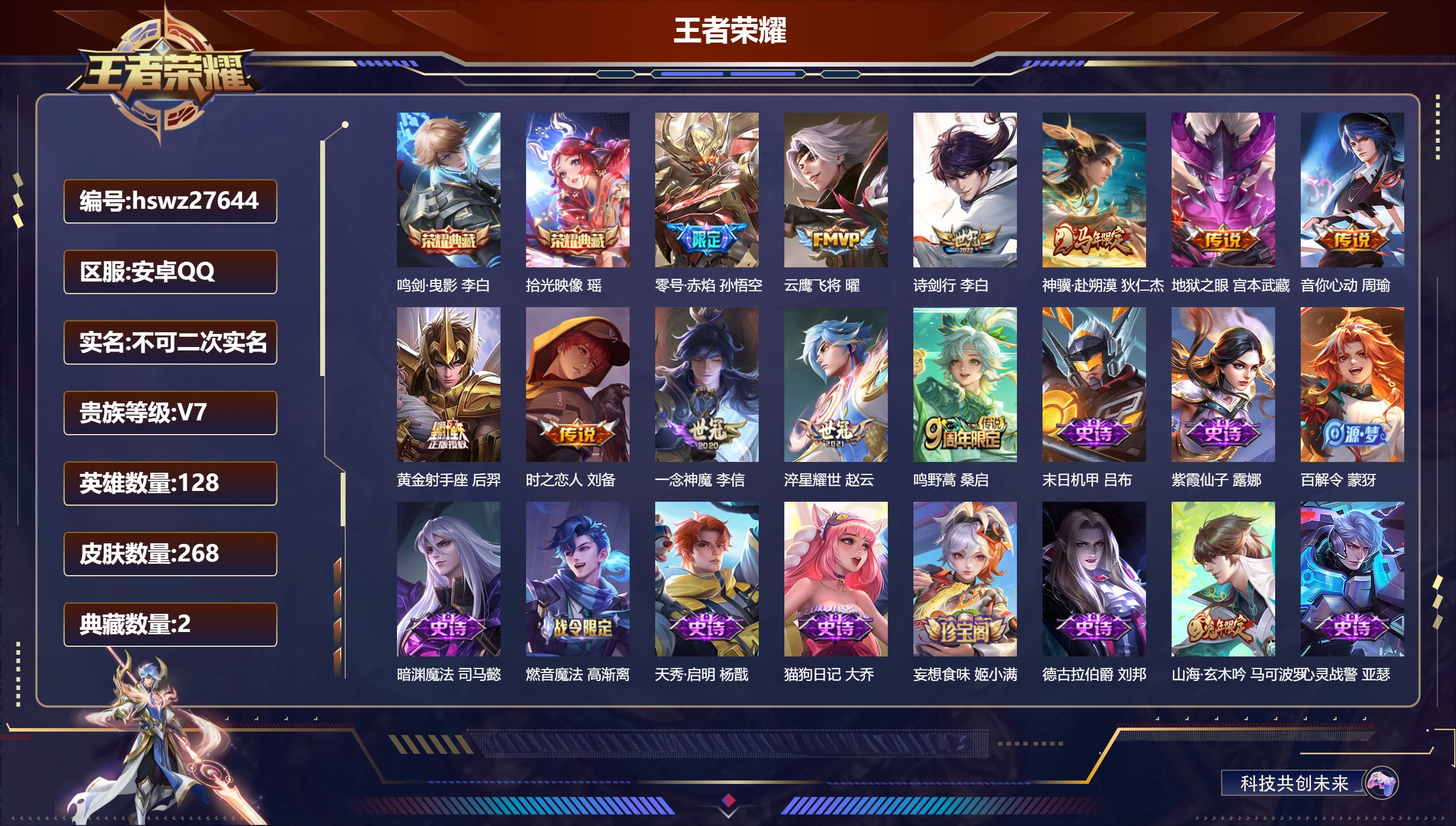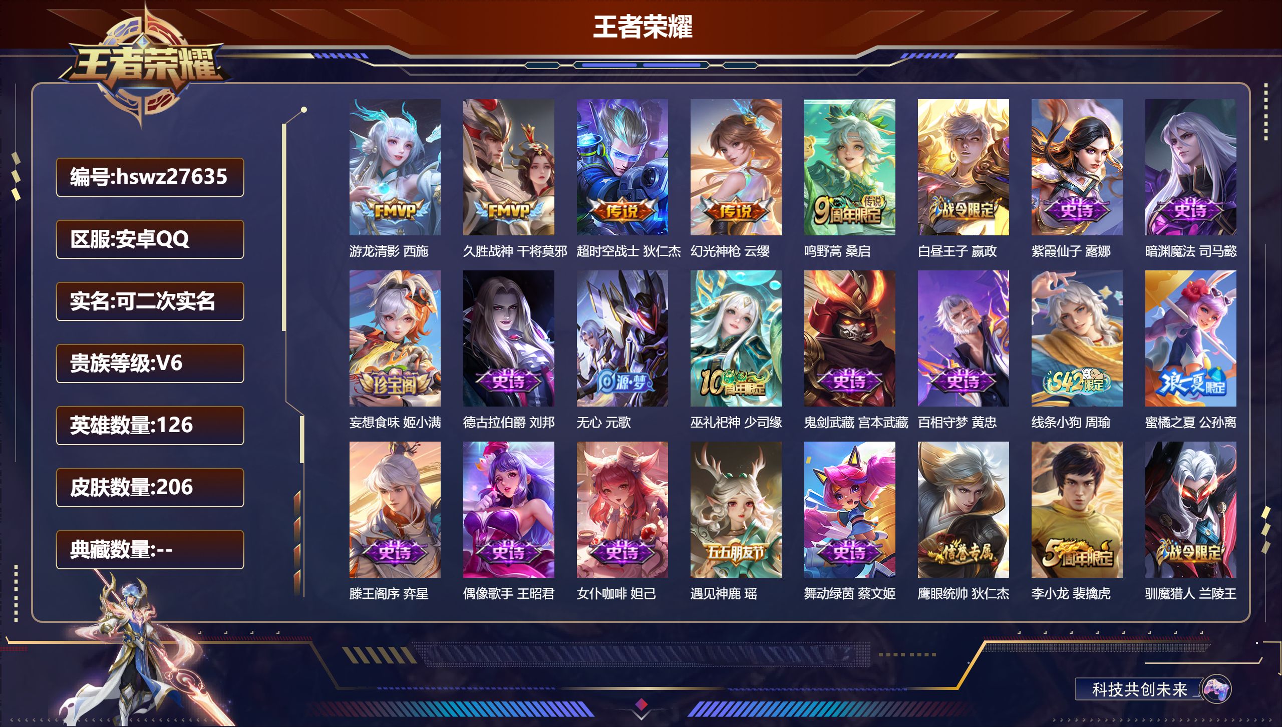 PX_2543522-Q/至尊星耀/206皮肤/126英雄/0典藏/0珍品无双/0无双/0珍品传说/5传说/54史诗/7稀有英雄 【5,传说皮肤】游龙清影,西施,久胜战神,干将莫邪,超时空战士,狄仁杰,幻光神枪,云缨,鸣野蒿,桑启, 【54,史诗皮肤】白昼王子,嬴政,紫霞仙子,露娜,暗渊魔法,司马懿,妄想食味,姬小满,德古拉伯爵,刘邦,无心,元歌,巫礼祀神,少司缘,鬼剑武藏,宫本武藏,百相守梦,黄忠,线条小狗,周瑜,蜜橘之夏,公孙离,滕王阁序,弈星,偶像歌手,王昭君,女仆咖啡,妲己,遇见神鹿,瑶,舞动绿茵,蔡文姬,鹰眼统帅,狄仁杰,李小龙,裴擒虎,驯魔猎人,兰陵王,如梦令,后羿,嘻哈天王,赵云,特工魅影,百里守约,原初追逐者,百里玄策,逐浪之夏,李元芳,真我赫兹,百里守约,石田雨龙,后羿,魔术师,狄仁杰,龙之律动,狂铁,顽岩魄,蒙犽,皇家上将,赵云,冰冠公主,雅典娜,功夫厨神,程咬金,梁祝,上官婉儿,圣诞恋歌,貂蝉,云间偶戏,元歌,水晶猎龙者,花木兰,涂山容容,公孙离,一生所爱,露娜,魅语,不知火舞,蔷薇恋人,孙尚香,千年之狐,李白,节奏热浪,阿轲,暗夜猫娘,阿轲,万灵启世,女娲,心灵骇客,安琪拉,乱世虎臣,张飞,线条小狗,小乔,水果甜心,孙尚香,狂想玩偶喵,蒙犽,化蝶舞,阿轲,江河有灵,阿古朵,幽灵船长,曹操,乘风破浪,夏侯惇,暗隐猎兽者,兰陵王, 【98,勇者皮肤】圆桌骑士,盾山,烛龙,曹操,缤纷绘卷,张良,纽约教父,刘备,拳王,达摩,丁香结,小乔,铁甲之心,典韦,沉稳之力,孙尚香,朔风刀,夏侯惇,醍醐杖,老夫子,归虚梦演,孙膑,白色死神,白起,黄金武士,典韦,御旌,牛魔,阴阳师,狄仁杰,径山谋武,孙权,次元突破,哪吒,古海寻踪,张良,戏梦巡演,空空儿,鲨炮海盗猫,沈梦溪,海滩派对,项羽,完美运算,后羿,万华元夜,狄仁杰,制霸全明星,牛魔,踏浪烽翎,莱西奥,演武夺筹,程咬金,猎兽之王,吕布,守护之力,大乔,百相守梦,影,原初探秘者,鬼谷子,天穹祈灯,鬼谷子,疑决卦,明世隐,化身博士,扁鹊,潮玩骑士王,亚瑟,五福同心,张飞,幻乐之宴,鬼谷子,东方不败,武则天,虹云星官,明世隐,雾影缉谜,兰陵王,舞狮寰,吕布,赤刃凌霄,敖隐,赤莲之焰,周瑜,死亡骑士,亚瑟,敏锐之力,李白,幽兰居士,张良,海滩丽影,钟无艳,落日弦歌,高渐离,雪境奇遇,西施,重明,芈月,乓乓大师,鲁班大师,溯影追猎,虞姬,探海日志,鲁班大师,天使之翼,孙膑,兔女郎,花木兰,罗小黑战记,哪吒,荣光之誓,亚瑟,万象初新,宫本武藏,聚星闪耀,钟无艳,御銮,盾山,单词大作战,雅典娜,秘密基地,刘禅,穷奇,典韦,教廷特使,韩信,黑猫爱糖果,李元芳,妄想特派,李元芳,紫罗兰之誓,妲己,进击墨子号,墨子,少女阿狸,妲己,灵卜魔法,妲己,混沌棋,弈星,御霄,米莱狄,蔚蓝守将,蒙恬,春野闲踪,苏烈,布丁狗之约,阿古朵,命运加冕,露娜,幻想奇妙夜,王昭君,灵野札记,张良,特工战影,狂铁,御狮,狂铁,班班快跑,鲁班七号,白执事,赵云,罗小黑战记,张良,剑破天穹,刘邦,熔金海岸,周瑜,天穹之誓,姜子牙,魅影绮裳,影,星梦巡礼,姜子牙,谧流熔炉,太乙真人,鹤鸣心笺,艾琳,线条小狗,妲己,锦麟游梦,庄周,云械蓝图,云中君,逆浪荇歌,甄姬,线条小狗,周瑜,线条小狗,桑启,敬我三分,盘古,玫蓝誓约,戈娅,景韶洛都,明世隐, 【50,其他皮肤】伊势巫女,大乔,圣殿之光,刘邦,芝加哥教父,黄忠,三太子,哪吒,棒球奇才,沈梦溪,龙域领主,铠,超能战警,曹操,花见巫女,伽罗,爱与和平,苏烈,灼热之刃,李信,海之征途,孙策,福禄兄弟,鲁班七号,帝国元帅,项羽,精灵王,后羿,绯红之刃,露娜,冰刃幻境,镜,星航指挥官,诸葛亮,魇语军师,司马懿,英喵野望,刘禅,午夜歌剧院,元歌,隐刃,兰陵王,花间舞,公孙离,异域舞娘,貂蝉,街头旋风,裴擒虎,归虚梦演,鲁班大师,修竹墨客,上官婉儿,维京掠夺者,苍,占星师,明世隐,归虚梦演,蒙犽,激情绿茵,马可波罗,埃及法老,杨戬,阿摩司公爵,鬼谷子,画中游,桑启,尼罗河女神,女娲,锦衣卫,狄仁杰,归虚梦演,曜,威尼斯狂欢,百里玄策,幸存者,马超,创世神祝,盘古,特种部队,李元芳,绝影神枪,百里守约,孤猎,澜,加勒比小姐,虞姬,踏雪寻梅,弈星,秩序猎龙将,蒙恬,精准探案法,米莱狄,赤焰之缨,云缨,露花倒影,嫦娥,地府判官,钟馗,天启骑士,关羽, 【7,稀有英雄】不知火舞,橘右京,夏洛特,娜可露露,韩信,艾琳,赵云, 营地ID:,
