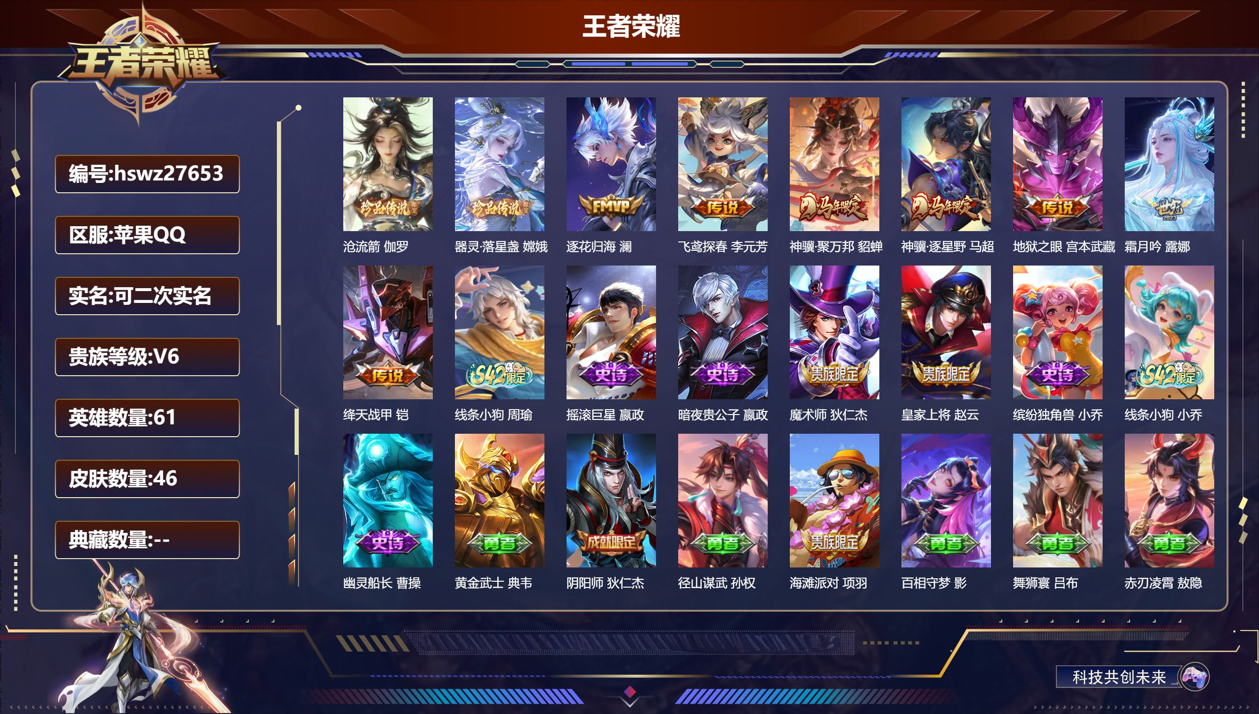 PX_2543770-Q/至尊星耀/46皮肤/61英雄/0典藏/0珍品无双/0无双/2珍品传说/7传说/8史诗/5稀有英雄 【2,珍品传说】沧流箭,伽罗,器灵·落星盏,嫦娥, 【7,传说皮肤】逐花归海,澜,飞鸢探春,李元芳,神骥·聚万邦,貂蝉,神骥·逐星野,马超,地狱之眼,宫本武藏,霜月吟,露娜,绛天战甲,铠, 【8,史诗皮肤】线条小狗,周瑜,摇滚巨星,嬴政,暗夜贵公子,嬴政,魔术师,狄仁杰,皇家上将,赵云,缤纷独角兽,小乔,线条小狗,小乔,幽灵船长,曹操, 【21,勇者皮肤】黄金武士,典韦,阴阳师,狄仁杰,径山谋武,孙权,海滩派对,项羽,百相守梦,影,舞狮寰,吕布,赤刃凌霄,敖隐,死亡骑士,亚瑟,敏锐之力,李白,玩偶对对碰,安琪拉,掌控之力,诸葛亮,忍·炎影,赵云,乓乓大师,鲁班大师,万象初新,宫本武藏,命运加冕,露娜,潮玩士官长,雅典娜,虚灵犬护,钟馗,班班快跑,鲁班七号,群星魔术团,程咬金,暗都幽影,大司命,线条小狗,周瑜, 【11,其他皮肤】沧流箭,伽罗,木偶奇遇记,鲁班七号,福禄兄弟,鲁班七号,精灵王,后羿,海军大将,周瑜,英喵野望,刘禅,尼罗河女神,女娲,森,瑶,精准探案法,米莱狄,赤焰之缨,云缨,器灵·落星盏,嫦娥, 【5,稀有英雄】嬴政,不知火舞,橘右京,娜可露露,韩信, 营地ID:,