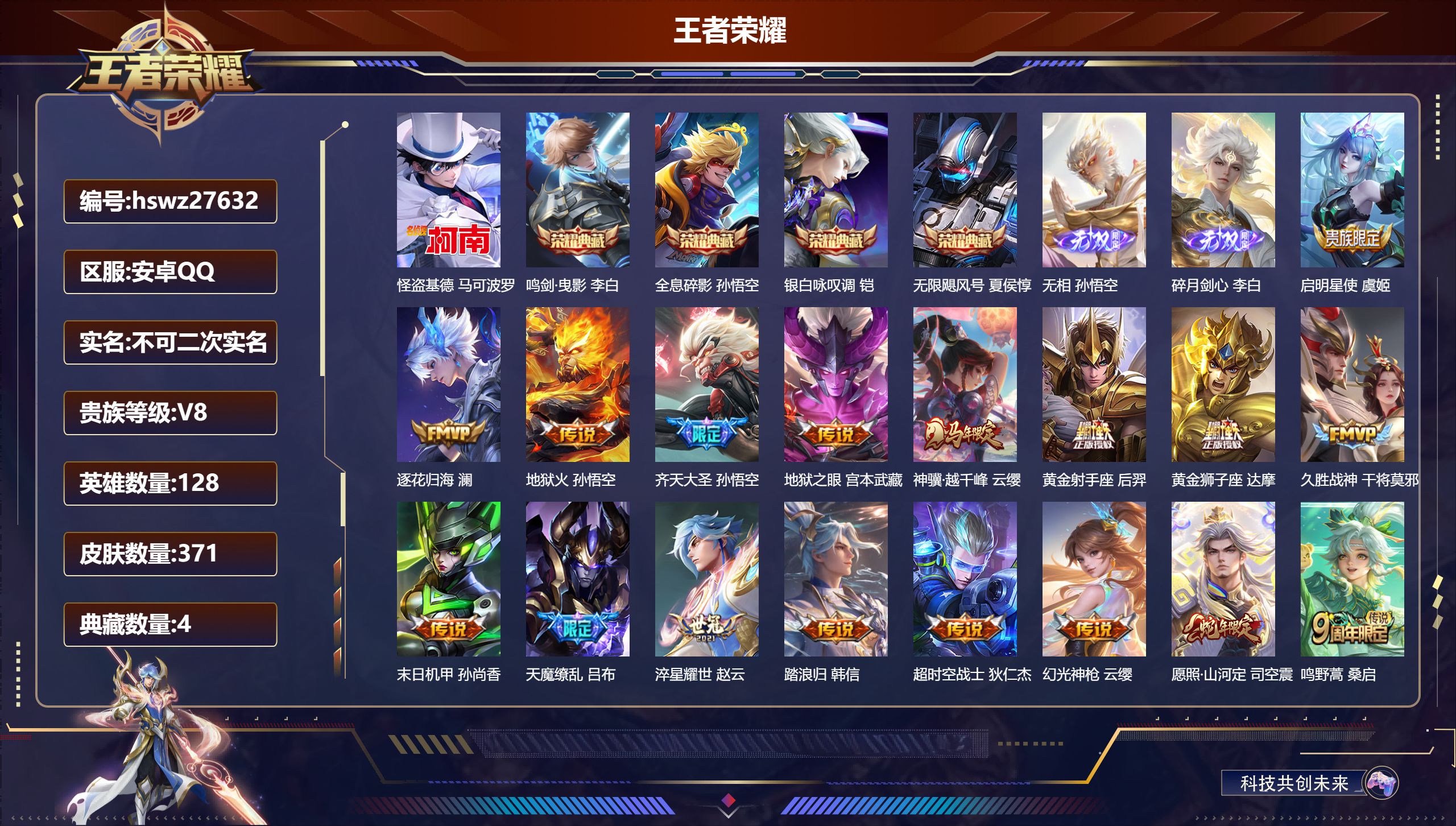 PX_2543453-Q/荣耀王者/371皮肤/128英雄/4典藏/0珍品无双/2无双/1珍品传说/17传说/102史诗/9稀有英雄 【1,珍品传说】怪盗基德,马可波罗, 【4,典藏皮肤】鸣剑·曳影,李白,全息碎影,孙悟空,银白咏叹调,铠,无限飓风号,夏侯惇, 【2,无双皮肤】无相,孙悟空,碎月剑心,李白, 【17,传说皮肤】启明星使,虞姬,逐花归海,澜,地狱火,孙悟空,齐天大圣,孙悟空,地狱之眼,宫本武藏,神骥·越千峰,云缨,黄金射手座,后羿,黄金狮子座,达摩,久胜战神,干将莫邪,末日机甲,孙尚香,天魔缭乱,吕布,淬星耀世,赵云,踏浪归,韩信,超时空战士,狄仁杰,幻光神枪,云缨,愿照·山河定,司空震,鸣野蒿,桑启, 【102,史诗皮肤】电玩小子,鲁班七号,末日机甲,吕布,紫霞仙子,露娜,高山流水,庄周,匿光追影者,镜,苍穹之光,项羽,天秀·启明,杨戬,狮舞东方,鲁班七号,猫狗日记,大乔,德古拉伯爵,刘邦,心灵战警,亚瑟,五谷丰年,鬼谷子,无心,元歌,鬼剑武藏,宫本武藏,百相守梦,黄忠,星夜王子,白起,无限星赏官,公孙离,地狱燃心,司空震,线条小狗,周瑜,百晓客,明世隐,遇见飞天,杨玉环,摇滚巨星,嬴政,顽趣,梦奇,冰锋战神,关羽,拒霜思,嫦娥,魅力维加斯,妲己,黄金分割率,诸葛亮,偶像歌手,王昭君,荣光圣徽,蒙恬,女仆咖啡,妲己,九幽镇关,项羽,星界游侠,暃,晚萤,娜可露露,猪悟能,猪八戒,舞动绿茵,蔡文姬,繁星吟游,蔡文姬,暗夜贵公子,嬴政,鹰眼统帅,狄仁杰,逐梦之光,东皇太一,孙行者,孙悟空,李小龙,裴擒虎,光弋星穹,莱西奥,春霖将至,上官婉儿,金属风暴,墨子,傲雪梅枪,韩信,特工魅影,百里守约,猫狗日记,孙策,原初追逐者,百里玄策,逐浪之夏,李元芳,未来纪元,赵云,灵蛊蚀心,扁鹊,黎明之约,雅典娜,魔术师,狄仁杰,龙之律动,狂铁,神威,马超,皇家上将,赵云,冰冠公主,雅典娜,至尊宝,孙悟空,功夫厨神,程咬金,梁祝,上官婉儿,电玩·爆裂旋风,刘禅,天才门将,刘禅,圣诞恋歌,貂蝉,水晶猎龙者,花木兰,破空之剑,亚连,圣诞狂欢,吕布,罗小黑战记,百里玄策,白龙吟,韩信,星界战将,牛魔,永昼,夏洛特,地狱岩魂,廉颇,茶境仙,孙膑,蔷薇恋人,孙尚香,冰雪圆舞曲,甄姬,火炮绅士,黄忠,默契交锋,花木兰,逐梦之翼,哪吒,月团寄思,沈梦溪,航海奇遇记,老夫子,千年之狐,李白,节奏热浪,阿轲,暗夜猫娘,阿轲,织梦人,西施,曙光守护者,铠,万灵启世,女娲,心灵骇客,安琪拉,箭羽风息,伽罗,乱世虎臣,张飞,万物之道,弈星,绅士熊喵,刘禅,缤纷独角兽,小乔,百相守梦,百里守约,线条小狗,小乔,蓝屏警告,典韦,天狼狩猎者,裴擒虎,真爱魔法,干将莫邪,水果甜心,孙尚香,化蝶舞,阿轲,江河有灵,阿古朵,幽灵船长,曹操,乘风破浪,夏侯惇,暗隐猎兽者,兰陵王, 【167,勇者皮肤】时空谍影,海诺,圆桌骑士,盾山,烛龙,曹操,爱心护理,阿轲,太极少年,赵怀真,沙漠行僧,达摩,大漠名商,沈梦溪,缤纷绘卷,张良,纽约教父,刘备,拳王,达摩,大发明家,达摩,龙舞盛年,沈梦溪,乐园追猎者,白起,丁香结,小乔,功夫炙烤,廉颇,沉稳之力,孙尚香,幻夜卜梦,芈月,海盐诗旅,桑启,幻泉雾影,海月,朔风刀,夏侯惇,醍醐杖,老夫子,朔望之晖,女娲,归虚梦演,孙膑,汉昭烈帝,刘备,白色死神,白起,黄金武士,典韦,御旌,牛魔,阴阳师,狄仁杰,径山谋武,孙权,次元突破,哪吒,古海寻踪,张良,牛运亨通,牛魔,科学大爆炸,项羽,戏梦巡演,空空儿,功夫老勺,老夫子,西部大镖客,牛魔,鲨炮海盗猫,沈梦溪,虎啸剑宗,刘邦,海滩派对,项羽,完美运算,后羿,万华元夜,狄仁杰,克喵,鬼谷子,踏浪烽翎,莱西奥,演武夺筹,程咬金,红桃皇后,芈月,西部游侠,莱西奥,美猴王,孙悟空,猎兽之王,吕布,野性能量,吕布,哥特玫瑰,露娜,守护之力,大乔,无双福将,程咬金,百相守梦,影,原初探秘者,鬼谷子,潮玩探月行,猪八戒,天穹祈灯,鬼谷子,疑决卦,明世隐,如懿,安琪拉,化身博士,扁鹊,阿尔法小队,后羿,五福同心,张飞,星际陆战队,程咬金,幻乐之宴,鬼谷子,霸王丸,宫本武藏,虹云星官,明世隐,雾影缉谜,兰陵王,潮玩牛仔,马可波罗,舞狮寰,吕布,救世之瞳,扁鹊,赤刃凌霄,敖隐,死亡骑士,亚瑟,浪漫序章,刘备,敏锐之力,李白,危途狂花,戈娅,胡桃狂想曲,蒙犽,破局者,亚连,玩偶对对碰,安琪拉,掌控之力,诸葛亮,海滩丽影,钟无艳,圣弓游侠,后羿,忍·炎影,赵云,雪境奇遇,西施,重明,芈月,炽热元素使,姜子牙,坚韧之力,苏烈,唤灵魔甲,刘禅,万事如意,刘备,逐霄战戟,吕布,谜偶窥秘,鬼谷子,擒涛扼浪,裴擒虎,苍云破阵,蒙恬,糖果风暴,安琪拉,乓乓大师,鲁班大师,逐霄之志,曹操,溯影追猎,虞姬,极光幻客,蚩奼,探海日志,鲁班大师,天使之翼,孙膑,雾都夜雨,干将莫邪,玩趣恶龙,高渐离,兔女郎,花木兰,龙腾万里,关羽,流音漫舞,艾琳,金庭之子,兰陵王,未来纪元,宫本武藏,罗小黑战记,哪吒,千军破阵,苏烈,往忆晖光,明世隐,零食大作战,姬小满,荣光之誓,亚瑟,花好人间,甄姬,万象初新,宫本武藏,御銮,盾山,时尚教父,姜子牙,春野之旅,钟无艳,秘密基地,刘禅,穷奇,典韦,教廷特使,韩信,街头霸王,韩信,云中旅人,李元芳,妄想特派,李元芳,西部大镖客,孙悟空,紫罗兰之誓,妲己,神迹守卫,墨子,少女阿狸,妲己,混沌棋,弈星,御霄,米莱狄,蔚蓝守将,蒙恬,春野闲踪,苏烈,布丁狗之约,阿古朵,暖冬·兔眠,嫦娥,命运加冕,露娜,幻想奇妙夜,王昭君,灵野札记,张良,驱傩正仪,钟馗,神迹守卫,钟馗,命运角斗场,狂铁,特工战影,狂铁,虚灵犬护,钟馗,御狮,狂铁,班班快跑,鲁班七号,白执事,赵云,劲辣红锅,太乙真人,神迹守卫,孙悟空,罗