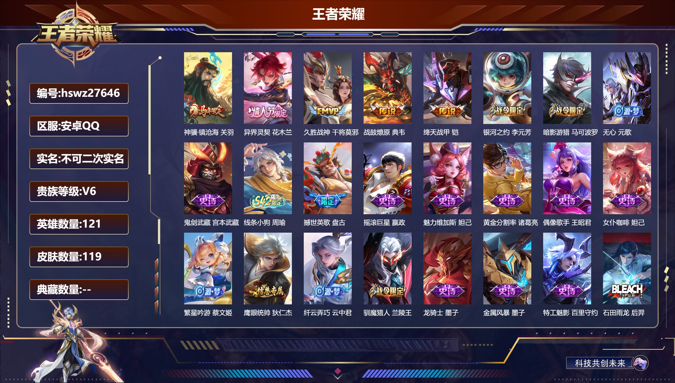 PX_2543659-Q/无双王者/119皮肤/121英雄/0典藏/0珍品无双/0无双/0珍品传说/5传说/34史诗/7稀有英雄 【5,传说皮肤】神骥·镇沧海,关羽,异界灵契,花木兰,久胜战神,干将莫邪,战鼓燎原,典韦,绛天战甲,铠, 【34,史诗皮肤】银河之约,李元芳,暗影游猎,马可波罗,无心,元歌,鬼剑武藏,宫本武藏,线条小狗,周瑜,撼世英歌,盘古,摇滚巨星,嬴政,魅力维加斯,妲己,黄金分割率,诸葛亮,偶像歌手,王昭君,女仆咖啡,妲己,繁星吟游,蔡文姬,鹰眼统帅,狄仁杰,纤云弄巧,云中君,驯魔猎人,兰陵王,龙骑士,墨子,金属风暴,墨子,特工魅影,百里守约,石田雨龙,后羿,魔术师,狄仁杰,龙之律动,狂铁,唤灵魅影,貂蝉,皇家上将,赵云,至尊宝,孙悟空,功夫厨神,程咬金,圣诞恋歌,貂蝉,圣诞狂欢,吕布,天狼绘梦者,上官婉儿,节奏热浪,阿轲,缤纷独角兽,小乔,线条小狗,小乔,时之恋人,孙尚香,幽灵船长,曹操,乘风破浪,夏侯惇, 【60,勇者皮肤】拳王,达摩,沉稳之力,孙尚香,海盐诗旅,桑启,朔风刀,夏侯惇,醍醐杖,老夫子,白色死神,白起,黑桃队长,鲁班七号,黄金武士,典韦,御旌,牛魔,阴阳师,狄仁杰,次元突破,哪吒,功夫老勺,老夫子,海滩派对,项羽,万华元夜,狄仁杰,无尽征程,廉颇,演武夺筹,程咬金,红桃皇后,芈月,瓷语鉴心,露娜,百相守梦,影,原初探秘者,鬼谷子,星空之诺,沈梦溪,潮玩探月行,猪八戒,天穹祈灯,鬼谷子,西部大镖客,猪八戒,疑决卦,明世隐,五福同心,张飞,星际陆战队,程咬金,霸王丸,宫本武藏,舞狮寰,吕布,救世之瞳,扁鹊,赤刃凌霄,敖隐,赤莲之焰,周瑜,死亡骑士,亚瑟,敏锐之力,李白,玩偶对对碰,安琪拉,海滩丽影,钟无艳,炽热元素使,姜子牙,坚韧之力,苏烈,万事如意,刘备,溯影追猎,虞姬,兔女郎,花木兰,龙腾万里,关羽,未来纪元,宫本武藏,花好人间,甄姬,万象初新,宫本武藏,穷奇,典韦,教廷特使,韩信,街头霸王,韩信,西部大镖客,孙悟空,少女阿狸,妲己,混沌棋,弈星,御霄,米莱狄,幻想奇妙夜,王昭君,驱傩正仪,钟馗,死霸装,白起,御狮,狂铁,班班快跑,鲁班七号,星梦巡礼,姜子牙,线条小狗,妲己,线条小狗,周瑜, 【22,其他皮肤】潮流仙人,老夫子,三太子,哪吒,花见巫女,伽罗,第七人偶,干将莫邪,万圣前夜,小乔,熊喵少女,阿古朵,福禄兄弟,鲁班七号,魇语军师,司马懿,午夜歌剧院,元歌,隐刃,兰陵王,异域舞娘,貂蝉,街头旋风,裴擒虎,激情绿茵,马可波罗,埃及法老,杨戬,归虚梦演,西施,一千零一夜,张良,归虚梦演,曜,战争女神,雅典娜,荷鲁斯之眼,云中君,赤焰之缨,云缨,地府判官,钟馗,西部大镖客,孙悟空, 【7,稀有英雄】嬴政,不知火舞,橘右京,夏洛特,娜可露露,韩信,赵云, 营地ID:,