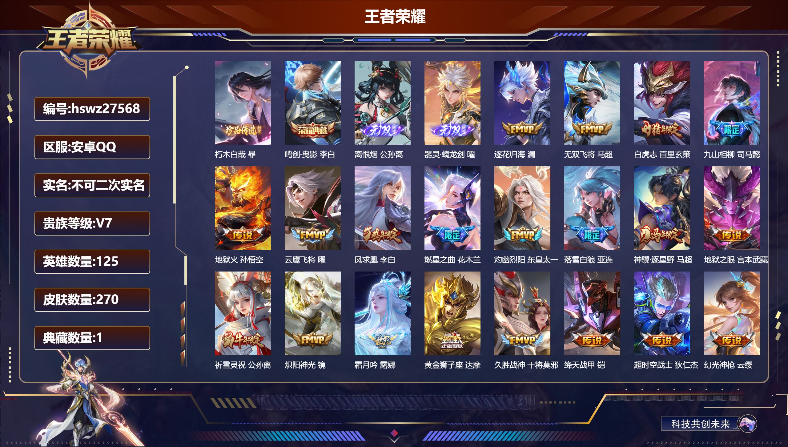 PX_2541981-Q/无双王者/270皮肤/125英雄/1典藏/0珍品无双/2无双/1珍品传说/23传说/74史诗/7稀有英雄 【1,珍品传说】朽木白哉,暃, 【1,典藏皮肤】鸣剑·曳影,李白, 【2,无双皮肤】离恨烟,公孙离,器灵·螭龙剑,曜, 【23,传说皮肤】逐花归海,澜,无双飞将,马超,白虎志,百里玄策,九山相柳,司马懿,地狱火,孙悟空,云鹰飞将,曜,凤求凰,李白,燃星之曲,花木兰,灼幽烈阳,东皇太一,落雪白狼,亚连,神骥·逐星野,马超,地狱之眼,宫本武藏,祈雪灵祝,公孙离,炽阳神光,镜,霜月吟,露娜,黄金狮子座,达摩,久胜战神,干将莫邪,绛天战甲,铠,超时空战士,狄仁杰,幻光神枪,云缨,愿照·山河定,司空震,祥瑞亨通,裴擒虎,鸣野蒿,桑启, 【74,史诗皮肤】末日机甲,吕布,蔬乡物语,鲁班七号,紫霞仙子,露娜,暗渊魔法,司马懿,燃音魔法,高渐离,天秀·启明,杨戬,妄想食味,姬小满,德古拉伯爵,刘邦,山海·玄木吟,马可波罗,心灵战警,亚瑟,无心,元歌,巫礼祀神,少司缘,鬼剑武藏,宫本武藏,百相守梦,黄忠,幻珠鲛人,朵莉亚,星夜王子,白起,地狱燃心,司空震,线条小狗,周瑜,百晓客,明世隐,摇滚巨星,嬴政,修罗,橘右京,魅力维加斯,妲己,偶像歌手,王昭君,九幽镇关,项羽,舞动绿茵,蔡文姬,鹰眼统帅,狄仁杰,李小龙,裴擒虎,光弋星穹,莱西奥,驯魔猎人,兰陵王,龙骑士,墨子,金属风暴,墨子,特工魅影,百里守约,猫狗日记,孙策,原初追逐者,百里玄策,逐浪之夏,李元芳,奇幻香踪,扁鹊,灵蛊蚀心,扁鹊,鸭鸭历险记,刘禅,驭风魔法,戈娅,魔术师,狄仁杰,龙之律动,狂铁,顽岩魄,蒙犽,皇家上将,赵云,冰冠公主,雅典娜,圣诞恋歌,貂蝉,云间偶戏,元歌,水晶猎龙者,花木兰,破空之剑,亚连,圣诞狂欢,吕布,青焰无极,镜,魅语,不知火舞,器灵·浮梦炉,赵怀真,罗小黑战记,百里玄策,夏日便利店,蔡文姬,星界战将,牛魔,茶境仙,孙膑,冰雪圆舞曲,甄姬,月团寄思,沈梦溪,千年之狐,李白,节奏热浪,阿轲,暗夜猫娘,阿轲,织梦人,西施,曙光守护者,铠,万灵启世,女娲,百相守梦,周瑜,万物之道,弈星,谪仙醉月,李白,绅士熊喵,刘禅,百相守梦,百里守约,线条小狗,小乔,水果甜心,孙尚香,化蝶舞,阿轲,江河有灵,阿古朵,幽灵船长,曹操, 【124,勇者皮肤】玲珑珍味,西施,太极少年,赵怀真,星际陆战队,达摩,纽约教父,刘备,大发明家,达摩,龙舞盛年,沈梦溪,功夫炙烤,廉颇,铁甲之心,典韦,沉稳之力,孙尚香,海盐诗旅,桑启,汉昭烈帝,刘备,黑桃队长,鲁班七号,阴阳师,狄仁杰,径山谋武,孙权,致命风华,阿轲,次元突破,哪吒,古海寻踪,张良,戏梦巡演,空空儿,功夫老勺,老夫子,海滩派对,项羽,完美运算,后羿,克喵,鬼谷子,踏浪烽翎,莱西奥,红桃皇后,芈月,西部游侠,莱西奥,野性能量,吕布,哥特玫瑰,露娜,守护之力,大乔,无双福将,程咬金,潮玩探月行,猪八戒,鸿运当头,亚瑟,天穹祈灯,鬼谷子,阿尔法小队,后羿,金色潮汐,朵莉亚,幻乐之宴,鬼谷子,虹云星官,明世隐,雾影缉谜,兰陵王,潮玩牛仔,马可波罗,赤刃凌霄,敖隐,潮玩骑兵,杨戬,死亡骑士,亚瑟,浪漫序章,刘备,敏锐之力,李白,危途狂花,戈娅,破局者,亚连,掌控之力,诸葛亮,海滩丽影,钟无艳,忍·炎影,赵云,雪境奇遇,西施,炽热元素使,姜子牙,坚韧之力,苏烈,万事如意,刘备,擒涛扼浪,裴擒虎,乓乓大师,鲁班大师,溯影追猎,虞姬,极光幻客,蚩奼,探海日志,鲁班大师,天使之翼,孙膑,雾都夜雨,干将莫邪,兔女郎,花木兰,龙腾万里,关羽,未来纪元,宫本武藏,罗小黑战记,哪吒,往忆晖光,明世隐,零食大作战,姬小满,荣光之誓,亚瑟,潮玩造梦师,刘备,时尚教父,姜子牙,春野之旅,钟无艳,秘密基地,刘禅,教廷特使,韩信,街头霸王,韩信,妄想特派,李元芳,西部大镖客,孙悟空,蔬乡物语,李元芳,少女阿狸,妲己,灵卜魔法,妲己,蔚蓝守将,蒙恬,春野闲踪,苏烈,布丁狗之约,阿古朵,命运加冕,露娜,小满鸭,姬小满,幻想奇妙夜,王昭君,灵野札记,张良,潮玩士官长,雅典娜,鸭鸭历险记,沈梦溪,命运角斗场,狂铁,死霸装,白起,特工战影,狂铁,虚灵犬护,钟馗,漠中幻影,嫦娥,白执事,赵云,劲辣红锅,太乙真人,神迹守卫,孙悟空,罗小黑战记,张良,剑破天穹,刘邦,异域游侠,刘备,苍威无极,项羽,铁骨偃魂,典韦,熔金海岸,周瑜,苍林狼骑,苍,天穹之誓,姜子牙,魅影绮裳,影,访茗客,马超,星梦巡礼,姜子牙,破阵·退雄兵,杨戬,谧流熔炉,太乙真人,群星魔术团,程咬金,夏日便利店,虞姬,鹤鸣心笺,艾琳,锦麟游梦,庄周,云械蓝图,云中君,逆浪荇歌,甄姬,百相守梦,孙策,线条小狗,周瑜,线条小狗,桑启,百相守梦,老夫子,噬灭天穹,东皇太一,灵卦秘语,少司缘,动物派对,亚瑟,敬我三分,盘古,爆裂喵拳,达摩,玫蓝誓约,戈娅,景韶洛都,明世隐, 【49,其他皮肤】伊势巫女,大乔,金属狂潮,高渐离,前尘,金蝉,战争骑士,夏侯惇,芝加哥教父,黄忠,潮流仙人,老夫子,三太子,哪吒,龙域领主,铠,花见巫女,伽罗,第七人偶,干将莫邪,幻珠鲛人,朵莉亚,灼热之刃,李信,熊喵少女,阿古朵,绯红之刃,露娜,冰刃幻境,镜,碧珀绯影,暃,魇语军师,司马懿,英喵野望,刘禅,午夜歌剧院,元歌,启蛰,司空震,霓裳曲,杨玉环,异域舞娘,貂蝉,街头旋风,裴擒虎,东海龙王,东皇太一,修竹墨客,上官婉儿,剑舞者,花木兰,范海辛,李白,维京掠夺者,苍,激情绿茵,马可波罗,埃及法老,杨戬,归虚梦演,西施,画中游,桑启,年年有余,猪八戒,归虚梦演,曜,威尼斯狂欢,百里玄策,幸存者,马超,创世神祝,盘古,绝影神枪,百里守约,蔷薇王座,蔡文姬,森,瑶,孤猎,澜,踏雪寻梅,弈星,秩序猎龙将,蒙恬,赤焰