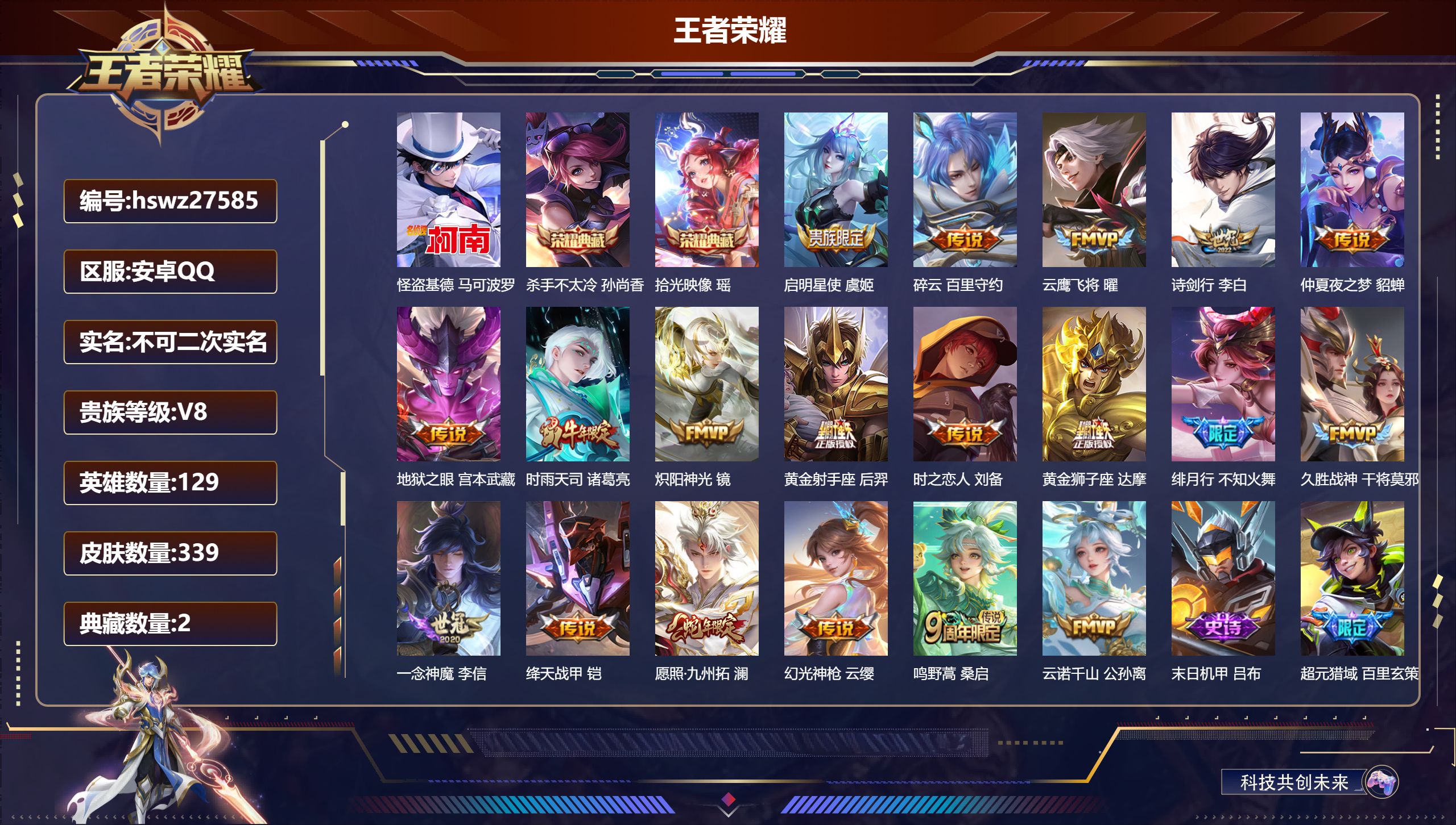 PX_2543183-Q/尊贵铂金/339皮肤/129英雄/2典藏/0珍品无双/0无双/1珍品传说/19传说/110史诗/9稀有英雄 【1,珍品传说】怪盗基德,马可波罗, 【2,典藏皮肤】杀手不太冷,孙尚香,拾光映像,瑶, 【19,传说皮肤】启明星使,虞姬,碎云,百里守约,云鹰飞将,曜,诗剑行,李白,仲夏夜之梦,貂蝉,地狱之眼,宫本武藏,时雨天司,诸葛亮,炽阳神光,镜,黄金射手座,后羿,时之恋人,刘备,黄金狮子座,达摩,绯月行,不知火舞,久胜战神,干将莫邪,一念神魔,李信,绛天战甲,铠,愿照·九州拓,澜,幻光神枪,云缨,鸣野蒿,桑启,云诺千山,公孙离, 【110,史诗皮肤】末日机甲,吕布,超元猎域,百里玄策,紫霞仙子,露娜,高山流水,庄周,暗渊魔法,司马懿,乘龙·忆丹青,大乔,暗影游猎,马可波罗,苍穹之光,项羽,天秀·启明,杨戬,狮舞东方,鲁班七号,妄想食味,姬小满,德古拉伯爵,刘邦,心灵战警,亚瑟,五谷丰年,鬼谷子,诗语江南,西施,无心,元歌,巫礼祀神,少司缘,鬼剑武藏,宫本武藏,星夜王子,白起,锁墨魂,钟馗,线条小狗,周瑜,百晓客,明世隐,遇见飞天,杨玉环,摇滚巨星,嬴政,电玩高手,狂铁,顽趣,梦奇,百相守梦,关羽,修罗,橘右京,拒霜思,嫦娥,魅力维加斯,妲己,偶像歌手,王昭君,荣光圣徽,蒙恬,女仆咖啡,妲己,赏金猎手,澜,晚萤,娜可露露,舞动绿茵,蔡文姬,繁星吟游,蔡文姬,暗夜贵公子,嬴政,鹰眼统帅,狄仁杰,胡桃异想国,米莱狄,白晶晶,芈月,孙行者,孙悟空,傩神司,兰陵王,李小龙,裴擒虎,光弋星穹,莱西奥,纤云弄巧,云中君,龙骑士,墨子,降魔,墨子,金属风暴,墨子,特工魅影,百里守约,猫狗日记,孙策,逐浪之夏,李元芳,未来纪元,赵云,灵蛊蚀心,扁鹊,黎明之约,雅典娜,石田雨龙,后羿,鸭鸭历险记,刘禅,魔术师,狄仁杰,埋骨钱,暃,龙之律动,狂铁,顽岩魄,蒙犽,皇家上将,赵云,冰冠公主,雅典娜,至尊宝,孙悟空,战舞者,姬小满,功夫厨神,程咬金,梁祝,上官婉儿,天才门将,刘禅,圣诞恋歌,貂蝉,云间偶戏,元歌,水晶猎龙者,花木兰,破空之剑,亚连,御风骁将,吕布,圣诞狂欢,吕布,器灵·浮梦炉,赵怀真,天狼绘梦者,上官婉儿,罗小黑战记,百里玄策,夏日便利店,蔡文姬,永昼,夏洛特,地狱岩魂,廉颇,冰雪圆舞曲,甄姬,火炮绅士,黄忠,青蛇,小乔,月团寄思,沈梦溪,航海奇遇记,老夫子,千年之狐,李白,节奏热浪,阿轲,超时空战士,钟无艳,曙光守护者,铠,万灵启世,女娲,心灵骇客,安琪拉,乘龙·聚宝船,安琪拉,箭羽风息,伽罗,乱世虎臣,张飞,百相守梦,周瑜,琥珀纪元,伽罗,绅士熊喵,刘禅,星界特工,马可波罗,缤纷独角兽,小乔,线条小狗,小乔,天狼狩猎者,裴擒虎,真爱魔法,干将莫邪,时之恋人,孙尚香,水果甜心,孙尚香,狂想玩偶喵,蒙犽,化蝶舞,阿轲,江河有灵,阿古朵,幽灵船长,曹操,乘风破浪,夏侯惇,暗隐猎兽者,兰陵王, 【163,勇者皮肤】时空谍影,海诺,圆桌骑士,盾山,爱心护理,阿轲,星际陆战队,达摩,沙漠行僧,达摩,大漠名商,沈梦溪,缤纷绘卷,张良,纽约教父,刘备,拳王,达摩,大发明家,达摩,龙舞盛年,沈梦溪,丁香结,小乔,功夫炙烤,廉颇,铁甲之心,典韦,沉稳之力,孙尚香,幻夜卜梦,芈月,海盐诗旅,桑启,幻泉雾影,海月,朔风刀,夏侯惇,醍醐杖,老夫子,归虚梦演,孙膑,汉昭烈帝,刘备,白色死神,白起,黑桃队长,鲁班七号,黄金武士,典韦,落雪兰心,甄姬,御旌,牛魔,阴阳师,狄仁杰,径山谋武,孙权,次元突破,哪吒,古海寻踪,张良,科学大爆炸,项羽,戏梦巡演,空空儿,功夫老勺,老夫子,西部大镖客,牛魔,鲨炮海盗猫,沈梦溪,虎啸剑宗,刘邦,海滩派对,项羽,完美运算,后羿,万华元夜,狄仁杰,演武夺筹,程咬金,红桃皇后,芈月,奇妙博物学,庄周,西部游侠,莱西奥,野性能量,吕布,哥特玫瑰,露娜,守护之力,大乔,无双福将,程咬金,瓷语鉴心,露娜,百相守梦,影,原初探秘者,鬼谷子,潮玩探月行,猪八戒,天穹祈灯,鬼谷子,西部大镖客,猪八戒,疑决卦,明世隐,化身博士,扁鹊,潮玩骑士王,亚瑟,阿尔法小队,后羿,五福同心,张飞,金色潮汐,朵莉亚,次元傲视,杨戬,幻乐之宴,鬼谷子,虹云星官,明世隐,雾影缉谜,兰陵王,潮玩牛仔,马可波罗,舞狮寰,吕布,救世之瞳,扁鹊,赤刃凌霄,敖隐,死亡骑士,亚瑟,浪漫序章,刘备,敏锐之力,李白,危途狂花,戈娅,幽兰居士,张良,玩偶对对碰,安琪拉,海滩丽影,钟无艳,圣弓游侠,后羿,忍·炎影,赵云,雪境奇遇,西施,炽热元素使,姜子牙,坚韧之力,苏烈,唤灵魔甲,刘禅,万事如意,刘备,逐霄战戟,吕布,擒涛扼浪,裴擒虎,糖果风暴,安琪拉,乓乓大师,鲁班大师,逐霄之志,曹操,溯影追猎,虞姬,极光幻客,蚩奼,探海日志,鲁班大师,女武神,艾琳,天使之翼,孙膑,雾都夜雨,干将莫邪,玩趣恶龙,高渐离,兔女郎,花木兰,龙腾万里,关羽,金庭之子,兰陵王,未来纪元,宫本武藏,千军破阵,苏烈,往忆晖光,明世隐,荣光之誓,亚瑟,花好人间,甄姬,万象初新,宫本武藏,潮玩造梦师,刘备,御銮,盾山,单词大作战,雅典娜,时尚教父,姜子牙,秘密基地,刘禅,穷奇,典韦,教廷特使,韩信,黑猫爱糖果,李元芳,街头霸王,韩信,云中旅人,李元芳,妄想特派,李元芳,西部大镖客,孙悟空,紫罗兰之誓,妲己,神迹守卫,墨子,重装意志,盘古,少女阿狸,妲己,灵卜魔法,妲己,混沌棋,弈星,御霄,米莱狄,蔚蓝守将,蒙恬,春野闲踪,苏烈,布丁狗之约,阿古朵,命运加冕,露娜,午后时光,王昭君,小满鸭,姬小满,幻想奇妙夜,王昭君,灵野札记,张良,驱傩正仪,钟馗,神迹守卫,钟馗,鸭鸭历险记,沈梦溪,命运角斗场,狂铁,死霸装,白起,特工战影,狂铁,虚灵犬护,钟馗,御狮,狂铁,班班快跑,鲁班七号,白