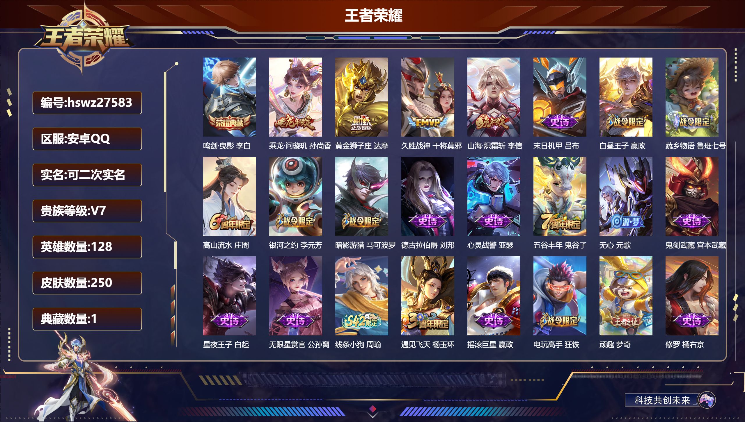 PX_2543004-Q/永恒钻石/250皮肤/128英雄/1典藏/0珍品无双/0无双/0珍品传说/4传说/66史诗/9稀有英雄 【1,典藏皮肤】鸣剑·曳影,李白, 【4,传说皮肤】乘龙·问璇玑,孙尚香,黄金狮子座,达摩,久胜战神,干将莫邪,山海·炽霜斩,李信, 【66,史诗皮肤】末日机甲,吕布,白昼王子,嬴政,蔬乡物语,鲁班七号,高山流水,庄周,银河之约,李元芳,暗影游猎,马可波罗,德古拉伯爵,刘邦,心灵战警,亚瑟,五谷丰年,鬼谷子,无心,元歌,鬼剑武藏,宫本武藏,星夜王子,白起,无限星赏官,公孙离,线条小狗,周瑜,遇见飞天,杨玉环,摇滚巨星,嬴政,电玩高手,狂铁,顽趣,梦奇,修罗,橘右京,魅力维加斯,妲己,黄金分割率,诸葛亮,偶像歌手,王昭君,荣光圣徽,蒙恬,女仆咖啡,妲己,晚萤,娜可露露,猪悟能,猪八戒,繁星吟游,蔡文姬,鹰眼统帅,狄仁杰,胡桃异想国,米莱狄,李小龙,裴擒虎,纤云弄巧,云中君,驯魔猎人,兰陵王,金属风暴,墨子,特工魅影,百里守约,猫狗日记,孙策,原初追逐者,百里玄策,逐浪之夏,李元芳,未来纪元,赵云,黎明之约,雅典娜,魔术师,狄仁杰,皇家上将,赵云,至尊宝,孙悟空,功夫厨神,程咬金,梁祝,上官婉儿,天才门将,刘禅,圣诞恋歌,貂蝉,水晶猎龙者,花木兰,神器·万象笔,上官婉儿,圣诞狂欢,吕布,天狼绘梦者,上官婉儿,永昼,夏洛特,地狱岩魂,廉颇,冰雪圆舞曲,甄姬,千年之狐,李白,暗夜猫娘,阿轲,超时空战士,钟无艳,游园惊梦,甄姬,心灵骇客,安琪拉,乱世虎臣,张飞,王者之锤,钟无艳,绅士熊喵,刘禅,缤纷独角兽,小乔,真爱魔法,干将莫邪,水果甜心,孙尚香,乘风破浪,夏侯惇,暗隐猎兽者,兰陵王, 【116,勇者皮肤】时空谍影,海诺,胡桃夹子,干将莫邪,圆桌骑士,盾山,烛龙,曹操,爱心护理,阿轲,星际陆战队,达摩,沙漠行僧,达摩,大漠名商,沈梦溪,缤纷绘卷,张良,纽约教父,刘备,拳王,达摩,大发明家,达摩,丁香结,小乔,功夫炙烤,廉颇,铁甲之心,典韦,沉稳之力,孙尚香,海盐诗旅,桑启,朔风刀,夏侯惇,醍醐杖,老夫子,归虚梦演,孙膑,汉昭烈帝,刘备,白色死神,白起,黑桃队长,鲁班七号,黄金武士,典韦,落雪兰心,甄姬,御旌,牛魔,阴阳师,狄仁杰,炼金王,扁鹊,致命风华,阿轲,次元突破,哪吒,科学大爆炸,项羽,功夫老勺,老夫子,鲨炮海盗猫,沈梦溪,海滩派对,项羽,万华元夜,狄仁杰,无尽征程,廉颇,演武夺筹,程咬金,红桃皇后,芈月,蜃楼王,庄周,野性能量,吕布,哥特玫瑰,露娜,守护之力,大乔,无双福将,程咬金,瓷语鉴心,露娜,百相守梦,影,原初探秘者,鬼谷子,星空之诺,沈梦溪,潮玩探月行,猪八戒,鸿运当头,亚瑟,天穹祈灯,鬼谷子,西部大镖客,猪八戒,疑决卦,明世隐,如懿,安琪拉,化身博士,扁鹊,阿尔法小队,后羿,五福同心,张飞,金色潮汐,朵莉亚,次元傲视,杨戬,星际陆战队,程咬金,幻乐之宴,鬼谷子,霸王丸,宫本武藏,虹云星官,明世隐,雾影缉谜,兰陵王,赤莲之焰,周瑜,死亡骑士,亚瑟,玩偶对对碰,安琪拉,掌控之力,诸葛亮,海滩丽影,钟无艳,圣弓游侠,后羿,狰,白起,重明,芈月,炽热元素使,姜子牙,坚韧之力,苏烈,万事如意,刘备,擒涛扼浪,裴擒虎,乓乓大师,鲁班大师,死亡摇滚,高渐离,妖精王,孙膑,探海日志,鲁班大师,女武神,艾琳,天使之翼,孙膑,兔女郎,花木兰,龙腾万里,关羽,金庭之子,兰陵王,千军破阵,苏烈,花好人间,甄姬,万象初新,宫本武藏,御銮,盾山,时尚教父,姜子牙,秘密基地,刘禅,穷奇,典韦,教廷特使,韩信,黑猫爱糖果,李元芳,街头霸王,韩信,云中旅人,李元芳,西部大镖客,孙悟空,凯尔特女王,虞姬,蔬乡物语,李元芳,少女阿狸,妲己,混沌棋,弈星,御霄,米莱狄,布丁狗之约,阿古朵,午后时光,王昭君,幻想奇妙夜,王昭君,驱傩正仪,钟馗,命运角斗场,狂铁,特工战影,狂铁,御狮,狂铁,白执事,赵云,饕餮,太乙真人,劲辣红锅,太乙真人,剑破天穹,刘邦,熔金海岸,周瑜,天穹之誓,姜子牙,星梦巡礼,姜子牙,线条小狗,周瑜, 【65,其他皮肤】伊势巫女,大乔,金属狂潮,高渐离,前尘,金蝉,战争骑士,夏侯惇,圣殿之光,刘邦,芝加哥教父,黄忠,潮流仙人,老夫子,三太子,哪吒,棒球奇才,沈梦溪,极冰防御线,盾山,龙域领主,铠,死神来了,曹操,花见巫女,伽罗,爱与和平,苏烈,第七人偶,干将莫邪,万圣前夜,小乔,灼热之刃,李信,海之征途,孙策,木偶奇遇记,鲁班七号,福禄兄弟,鲁班七号,帝国元帅,项羽,精灵王,后羿,冰刃幻境,镜,碧珀绯影,暃,星航指挥官,诸葛亮,魇语军师,司马懿,英喵野望,刘禅,启蛰,司空震,隐刃,兰陵王,花间舞,公孙离,异域舞娘,貂蝉,街头旋风,裴擒虎,东海龙王,东皇太一,修竹墨客,上官婉儿,剑舞者,花木兰,范海辛,李白,维京掠夺者,苍,占星师,明世隐,归虚梦演,蒙犽,激情绿茵,马可波罗,埃及法老,杨戬,画中游,桑启,年年有余,猪八戒,尼罗河女神,女娲,一千零一夜,张良,归虚梦演,曜,威尼斯狂欢,百里玄策,幸存者,马超,战争女神,雅典娜,荷鲁斯之眼,云中君,创世神祝,盘古,特种部队,李元芳,绝影神枪,百里守约,孤猎,澜,踏雪寻梅,弈星,秩序猎龙将,蒙恬,精准探案法,米莱狄,精灵公主,王昭君,赤焰之缨,云缨,露花倒影,嫦娥,地府判官,钟馗,美梦成真,梦奇,天启骑士,关羽,圆桌骑士,太乙真人,西部大镖客,孙悟空, 【9,稀有英雄】敖隐,嬴政,不知火舞,橘右京,夏洛特,娜可露露,韩信,艾琳,赵云, 营地ID:,