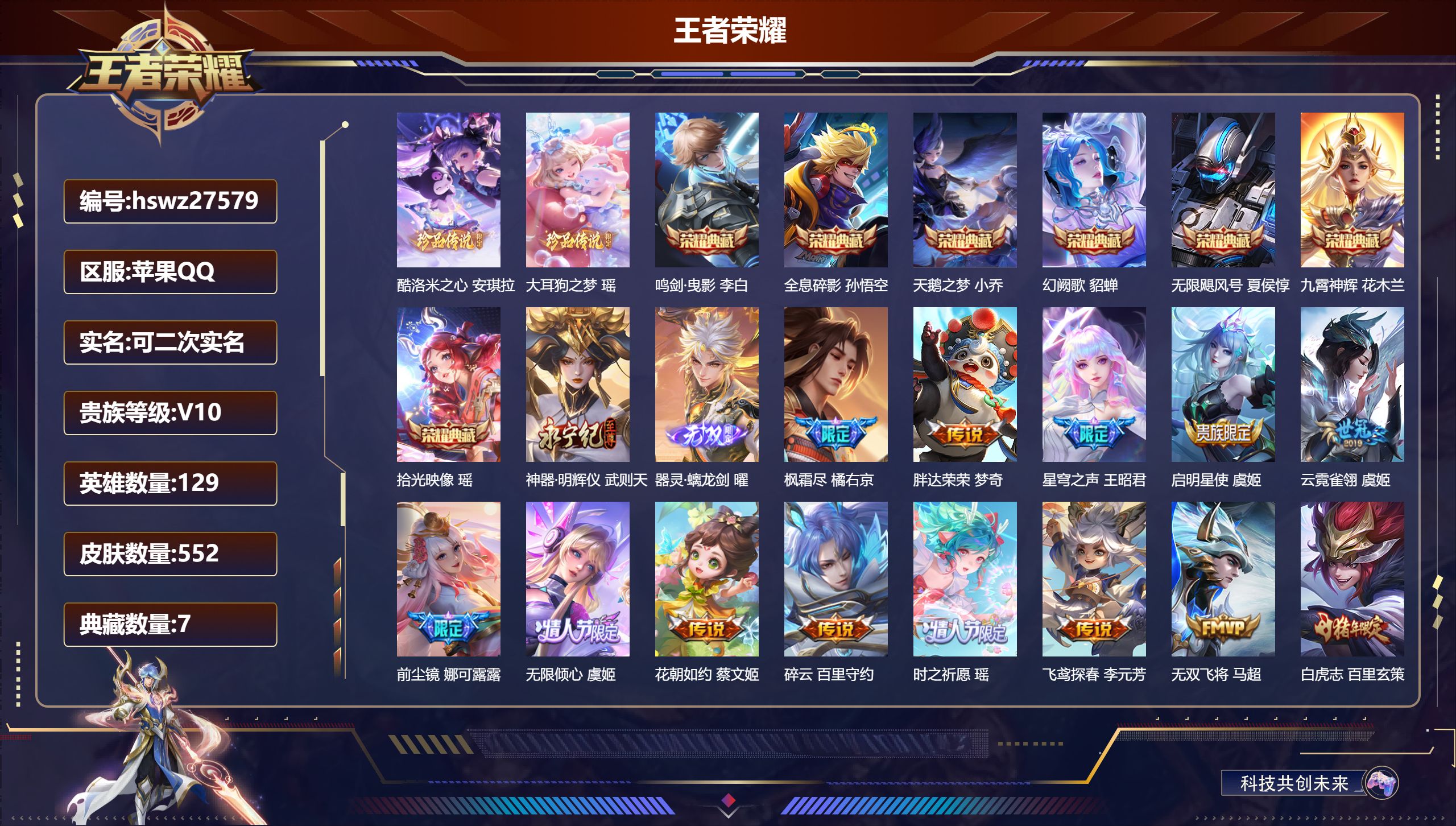 PX_2543175-Q/永恒钻石/552皮肤/129英雄/7典藏/0珍品无双/2无双/2珍品传说/71传说/187史诗/10稀有英雄 【2,珍品传说】酷洛米之心,安琪拉,大耳狗之梦,瑶, 【7,典藏皮肤】鸣剑·曳影,李白,全息碎影,孙悟空,天鹅之梦,小乔,幻阙歌,貂蝉,无限飓风号,夏侯惇,九霄神辉,花木兰,拾光映像,瑶, 【2,无双皮肤】神器·明辉仪,武则天,器灵·螭龙剑,曜, 【71,传说皮肤】枫霜尽,橘右京,胖达荣荣,梦奇,星穹之声,王昭君,启明星使,虞姬,云霓雀翎,虞姬,前尘镜,娜可露露,无限倾心,虞姬,花朝如约,蔡文姬,碎云,百里守约,时之祈愿,瑶,飞鸢探春,李元芳,无双飞将,马超,白虎志,百里玄策,李逍遥,,曜,零号·赤焰,孙悟空,地狱火,孙悟空,云鹰飞将,曜,齐天大圣,孙悟空,补天,女娲,神器·狴犴令,狄仁杰,深海之息,马可波罗,觅芳踪,艾琳,游龙清影,西施,永曜之星,杨戬,诗剑行,李白,灼幽烈阳,东皇太一,遇见胡旋,貂蝉,猫影幻舞,貂蝉,仲夏夜之梦,貂蝉,地狱之眼,宫本武藏,神骥·镇沧海,关羽,祈雪灵祝,公孙离,神骥·越千峰,云缨,海洋之心,武则天,时雨天司,诸葛亮,音你心动,周瑜,炽阳神光,镜,启示之音,露娜,黄金射手座,后羿,无限倾心,项羽,无尽星芒,后羿,寅虎·瑞焰,鲁班七号,怒海麟威,吕布,乞巧织情,王昭君,时之恋人,刘备,挚爱之约,孙策,黄金狮子座,达摩,绯月行,不知火舞,久胜战神,干将莫邪,末日机甲,孙尚香,异界灵契,孙尚香,末日机甲,孙策,山海·炽霜斩,李信,一念神魔,李信,音你心动,小乔,画中仙,干将莫邪,天魔缭乱,吕布,山海·琳琅生,小乔,淬星耀世,赵云,炽翼辉光,伽罗,绛天战甲,铠,挚爱花嫁,大乔,寅虎·赤拳,裴擒虎,超时空战士,狄仁杰,山海·苍雷引,曜,冠军飞将,花木兰,音你闪耀,孙尚香,黄金白羊座,张良,神树通天,后羿,鸣野蒿,桑启,云诺千山,公孙离, 【187,史诗皮肤】奔雷神使,牛魔,霸王别姬,项羽,时之奇旅,安琪拉,电玩小子,鲁班七号,末日机甲,吕布,白昼王子,嬴政,蔬乡物语,鲁班七号,逐梦之星,马可波罗,紫霞仙子,露娜,百解令,蒙犽,时之奇旅,妲己,高山流水,庄周,银河之约,李元芳,匿光追影者,镜,奇遇舞章,艾琳,真爱至上,周瑜,唐三藏,金蝉,暗渊魔法,司马懿,匿光决锋者,夏侯惇,暗影游猎,马可波罗,冰霜恋舞曲,干将莫邪,天秀·音浪,高渐离,白鹤梁神女,大乔,苍穹之光,项羽,天秀·启明,杨戬,狮舞东方,鲁班七号,猫狗日记,大乔,德古拉伯爵,刘邦,山海·玄木吟,马可波罗,心灵战警,亚瑟,五谷丰年,鬼谷子,无心,元歌,巫礼祀神,少司缘,鬼剑武藏,宫本武藏,百相守梦,黄忠,迷踪丽影,阿轲,星夜王子,白起,寅虎·心曲,杨玉环,无限星赏官,公孙离,千筹问战,张良,地狱燃心,司空震,瓦猫非猫,太乙真人,线条小狗,周瑜,玉兔公主,公孙离,百晓客,明世隐,遇见飞天,杨玉环,摇滚巨星,嬴政,电玩高手,狂铁,顽趣,梦奇,冰锋战神,关羽,蜜橘之夏,公孙离,修罗,橘右京,拒霜思,嫦娥,魅力维加斯,妲己,黄金分割率,诸葛亮,热情桑巴,妲己,乐园奇幻夜,钟馗,如梦令,嫦娥,凤凰于飞,王昭君,偶像歌手,王昭君,霸王别姬,虞姬,荣光圣徽,蒙恬,女仆咖啡,妲己,白蛇,大乔,赏金猎手,澜,星界游侠,暃,晚萤,娜可露露,遇见神鹿,瑶,舞动绿茵,蔡文姬,繁星吟游,蔡文姬,暗夜贵公子,嬴政,鹰眼统帅,狄仁杰,胡桃异想国,米莱狄,匿光启智者,鲁班大师,飞衡,韩信,孙行者,孙悟空,李小龙,裴擒虎,光弋星穹,莱西奥,纤云弄巧,云中君,驯魔猎人,兰陵王,如梦令,后羿,龙骑士,墨子,降魔,墨子,金属风暴,墨子,嘻哈天王,赵云,傲雪梅枪,韩信,冰霜神祇,盘古,玄嵩,庄周,特工魅影,百里守约,猫狗日记,孙策,原初追逐者,百里玄策,逐浪之夏,李元芳,奇幻香踪,扁鹊,时之祈愿,云中君,未来纪元,赵云,灵蛊蚀心,扁鹊,朱雀志,百里守约,雪豹·霜爪,百里守约,黎明之约,雅典娜,石田雨龙,后羿,优雅恋人,嬴政,鸭鸭历险记,刘禅,驭风魔法,戈娅,魔术师,狄仁杰,布丁狗之誓,亚瑟,龙之律动,狂铁,神威,马超,顽岩魄,蒙犽,皇家上将,赵云,冰冠公主,雅典娜,至尊宝,孙悟空,辉光之辰,后羿,功夫厨神,程咬金,梁祝,上官婉儿,电玩·爆裂旋风,刘禅,天才门将,刘禅,圣诞恋歌,貂蝉,云间偶戏,元歌,水晶猎龙者,花木兰,山海·碧波行,瑶,涂山容容,公孙离,神器·万象笔,上官婉儿,百木心枪,赵云,一生所爱,露娜,御风骁将,吕布,圣诞狂欢,吕布,青焰无极,镜,魅语,不知火舞,天狼绘梦者,上官婉儿,职棒王牌,项羽,顽趣,阿古朵,罗小黑战记,百里玄策,白龙吟,韩信,夏日便利店,蔡文姬,岱宗,典韦,星界战将,牛魔,永昼,夏洛特,天狼溯光者,伽罗,地狱岩魂,廉颇,茶境仙,孙膑,虎魄,张飞,纯白花嫁,小乔,蔷薇恋人,孙尚香,冰雪圆舞曲,甄姬,火炮绅士,黄忠,青蛇,小乔,航海奇遇记,老夫子,雪上飞焰,哪吒,千年之狐,李白,节奏热浪,阿轲,暗夜猫娘,阿轲,女儿国国王,甄姬,织梦人,西施,幽恒,甄姬,超时空战士,钟无艳,游园惊梦,甄姬,梦圆繁星,盾山,青春决赛季,花木兰,曙光守护者,铠,寅虎·展翼,孙膑,瑞麟志,花木兰,青龙志,铠,心灵骇客,安琪拉,寅虎·御盾,廉颇,匿光破解者,沈梦溪,箭羽风息,伽罗,玄武志,苏烈,乱世虎臣,张飞,天狼征服者,曹操,百相守梦,周瑜,吟游魔法,明世隐,万物之道,弈星,绅士熊喵,刘禅,缤纷独角兽,小乔,魔法小厨娘,安琪拉,线条小狗,小乔,蓝屏警告,典韦,天狼狩猎者,裴擒虎,真爱魔法,干将莫邪,时之恋人,孙尚香,水果甜心,孙尚香,狂想玩偶喵,蒙犽,化蝶舞,阿轲,江河有灵,阿古朵,幽灵船长,曹操,乘风破浪,夏侯惇,暗隐猎兽者,兰陵王, 【204,勇者皮肤