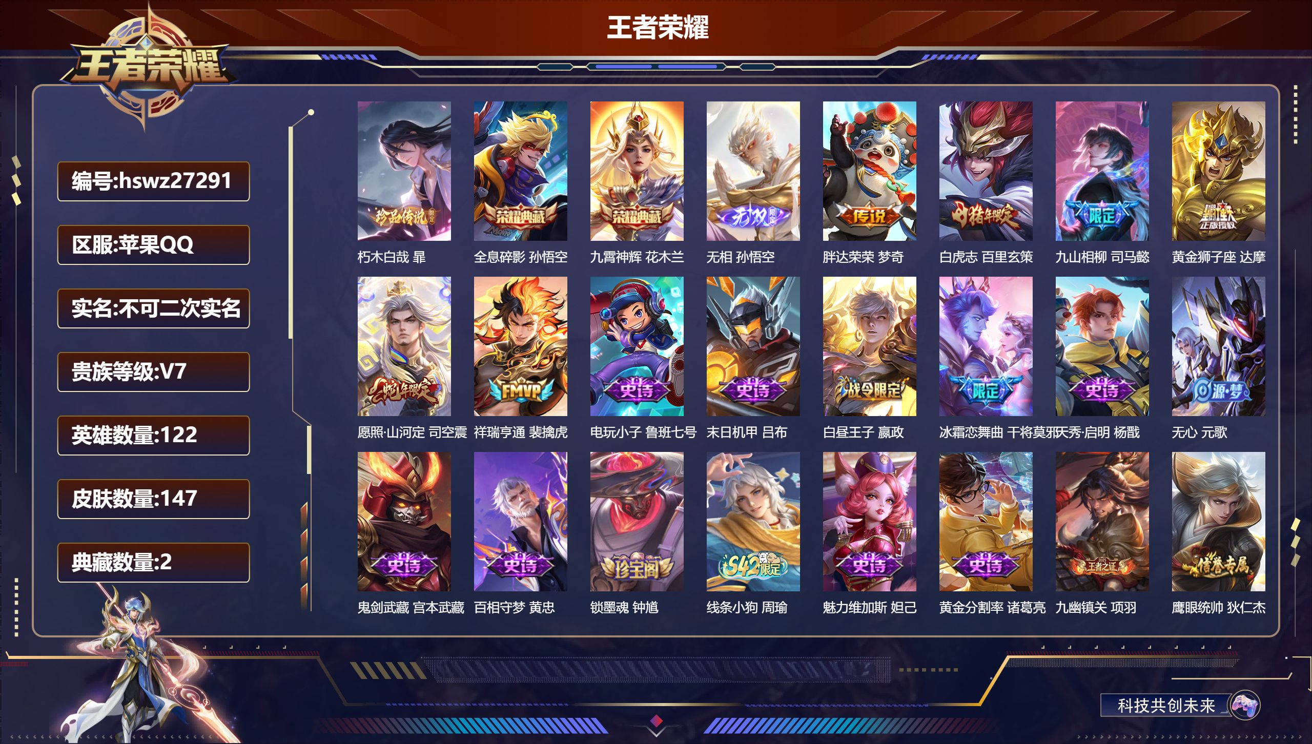 PX_2551710-Q/永恒钻石/147皮肤/122英雄/2典藏/0珍品无双/1无双/1珍品传说/6传说/46史诗/8稀有英雄 【1,珍品传说】朽木白哉,暃, 【2,典藏皮肤】全息碎影,孙悟空,九霄神辉,花木兰, 【1,无双皮肤】无相,孙悟空, 【6,传说皮肤】胖达荣荣,梦奇,白虎志,百里玄策,九山相柳,司马懿,黄金狮子座,达摩,愿照·山河定,司空震,祥瑞亨通,裴擒虎, 【46,史诗皮肤】电玩小子,鲁班七号,末日机甲,吕布,白昼王子,嬴政,冰霜恋舞曲,干将莫邪,天秀·启明,杨戬,无心,元歌,鬼剑武藏,宫本武藏,百相守梦,黄忠,锁墨魂,钟馗,线条小狗,周瑜,魅力维加斯,妲己,黄金分割率,诸葛亮,九幽镇关,项羽,鹰眼统帅,狄仁杰,大圣娶亲,孙悟空,光弋星穹,莱西奥,金属风暴,墨子,特工魅影,百里守约,原初追逐者,百里玄策,逐浪之夏,李元芳,藏狐·褐绒,老夫子,朱雀志,百里守约,石田雨龙,后羿,鸭鸭历险记,刘禅,魔术师,狄仁杰,龙之律动,狂铁,皇家上将,赵云,冰冠公主,雅典娜,辉光之辰,后羿,天才门将,刘禅,圣诞恋歌,貂蝉,一生所爱,露娜,器灵·浮梦炉,赵怀真,雪上飞焰,哪吒,千年之狐,李白,青龙志,铠,心灵骇客,安琪拉,玄武志,苏烈,乱世虎臣,张飞,百相守梦,周瑜,龙胆,赵云,绅士熊喵,刘禅,线条小狗,小乔,水果甜心,孙尚香,江河有灵,阿古朵,幽灵船长,曹操, 【69,勇者皮肤】爱心护理,阿轲,拳王,达摩,龙舞盛年,沈梦溪,丁香结,小乔,功夫炙烤,廉颇,醍醐杖,老夫子,汉昭烈帝,刘备,黄金武士,典韦,御旌,牛魔,阴阳师,狄仁杰,径山谋武,孙权,牛运亨通,牛魔,海滩派对,项羽,万华元夜,狄仁杰,克喵,鬼谷子,踏浪烽翎,莱西奥,演武夺筹,程咬金,奇妙博物学,庄周,猎兽之王,吕布,原初探秘者,鬼谷子,潮玩探月行,猪八戒,疑决卦,明世隐,阿尔法小队,后羿,五福同心,张飞,死亡骑士,亚瑟,幽兰居士,张良,掌控之力,诸葛亮,落日弦歌,高渐离,忍·炎影,赵云,雪境奇遇,西施,苍云破阵,蒙恬,糖果风暴,安琪拉,逐霄之志,曹操,溯影追猎,虞姬,极光幻客,蚩奼,兔女郎,花木兰,龙腾万里,关羽,未来纪元,宫本武藏,罗小黑战记,哪吒,往忆晖光,明世隐,荣光之誓,亚瑟,花好人间,甄姬,万象初新,宫本武藏,御銮,盾山,时尚教父,姜子牙,街头霸王,韩信,重装意志,盘古,少女阿狸,妲己,混沌棋,弈星,御霄,米莱狄,春野闲踪,苏烈,布丁狗之约,阿古朵,命运加冕,露娜,小满鸭,姬小满,幻想奇妙夜,王昭君,灵野札记,张良,鸭鸭历险记,沈梦溪,命运角斗场,狂铁,死霸装,白起,虚灵犬护,钟馗,星梦巡礼,姜子牙,鹤鸣心笺,艾琳,锦麟游梦,庄周,逆浪荇歌,甄姬,百相守梦,孙策,海之女神,海月,线条小狗,周瑜,玫蓝誓约,戈娅,景韶洛都,明世隐, 【24,其他皮肤】金属狂潮,高渐离,生化警戒,钟无艳,死神来了,曹操,灼热之刃,李信,木偶奇遇记,鲁班七号,福禄兄弟,鲁班七号,冰刃幻境,镜,碧珀绯影,暃,星航指挥官,诸葛亮,启蛰,司空震,花间舞,公孙离,街头旋风,裴擒虎,维京掠夺者,苍,激情绿茵,马可波罗,归虚梦演,曜,威尼斯狂欢,百里玄策,幸存者,马超,战争女神,雅典娜,创世神祝,盘古,加勒比小姐,虞姬,踏雪寻梅,弈星,秩序猎龙将,蒙恬,地府判官,钟馗,朽木白哉,暃, 【8,稀有英雄】嬴政,不知火舞,橘右京,夏洛特,娜可露露,韩信,艾琳,赵云, 营地ID:,