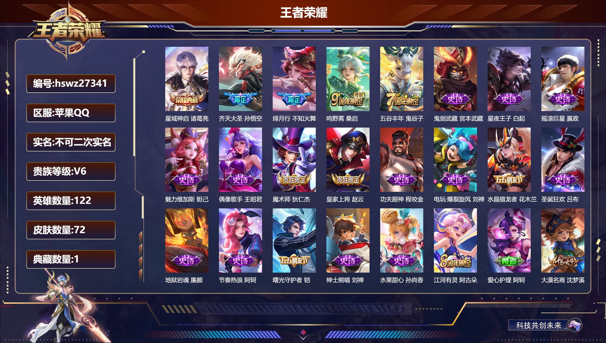 PX_2558039-Q/荣耀黄金/72皮肤/122英雄/1典藏/0珍品无双/0无双/0珍品传说/3传说/18史诗/7稀有英雄 【1,典藏皮肤】星域神启,诸葛亮, 【3,传说皮肤】齐天大圣,孙悟空,绯月行,不知火舞,鸣野蒿,桑启, 【18,史诗皮肤】五谷丰年,鬼谷子,鬼剑武藏,宫本武藏,星夜王子,白起,摇滚巨星,嬴政,魅力维加斯,妲己,偶像歌手,王昭君,魔术师,狄仁杰,皇家上将,赵云,功夫厨神,程咬金,电玩·爆裂旋风,刘禅,水晶猎龙者,花木兰,圣诞狂欢,吕布,地狱岩魂,廉颇,节奏热浪,阿轲,曙光守护者,铠,绅士熊喵,刘禅,水果甜心,孙尚香,江河有灵,阿古朵, 【41,勇者皮肤】爱心护理,阿轲,大漠名商,沈梦溪,纽约教父,刘备,拳王,达摩,龙舞盛年,沈梦溪,丁香结,小乔,海盐诗旅,桑启,阴阳师,狄仁杰,古海寻踪,张良,西部大镖客,牛魔,海滩派对,项羽,潮玩探月行,猪八戒,鸿运当头,亚瑟,天穹祈灯,鬼谷子,决胜大满贯,曹操,化身博士,扁鹊,星际陆战队,程咬金,雾影缉谜,兰陵王,死亡骑士,亚瑟,破局者,亚连,玩偶对对碰,安琪拉,掌控之力,诸葛亮,忍·炎影,赵云,万事如意,刘备,擒涛扼浪,裴擒虎,探海日志,鲁班大师,女武神,艾琳,花好人间,甄姬,潮玩造梦师,刘备,街头霸王,韩信,云中旅人,李元芳,妄想特派,李元芳,幻想奇妙夜,王昭君,特工战影,狂铁,劲辣红锅,太乙真人,剑破天穹,刘邦,熔金海岸,周瑜,天穹之誓,姜子牙,长夏之忆,貂蝉,群星魔术团,程咬金,海之女神,海月, 【9,其他皮肤】芝加哥教父,黄忠,极冰防御线,盾山,龙域领主,铠,万圣前夜,小乔,激情绿茵,马可波罗,锦衣卫,狄仁杰,蔷薇王座,蔡文姬,孤猎,澜,精灵公主,王昭君, 【7,稀有英雄】不知火舞,橘右京,夏洛特,娜可露露,韩信,艾琳,赵云, 营地ID:,