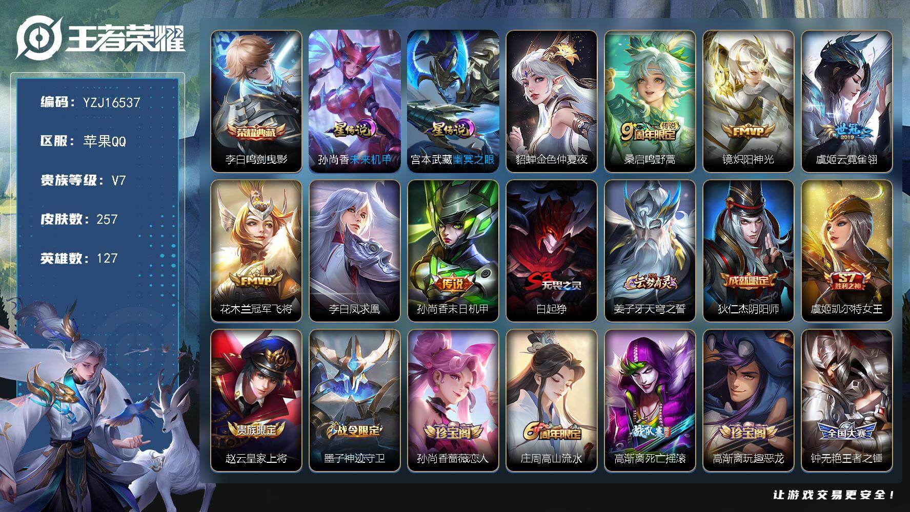 PX_2557873-实名:,可修改,贵族等级:,V9,英雄数:,129,皮肤数:,206,荣耀水晶:,武则天,倪克斯神谕,弑枪猎影,千魇归渊,无双皮:,小乔时之魔女,器灵·螭龙剑,珍品传说:,器灵·落星盏,酷洛米之心,星传说:,幻海之心,幽冥之眼,亮点:,【精品号手慢无】,V9历史4银标,2金标,对抗路15段,打野36段,,80次夺宝,热门皮神骥·镇沧海,器灵·落星盏,酷洛米之心,霜月吟,澜逐花归海,琥珀纪元马超