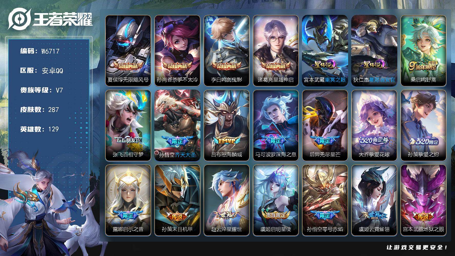 PX_2557763-【W6717】品质号.星域神启.鸣剑·曳影.无限飓风号.齐天大圣.520限定挚爱花嫁.挚爱之约.零号炽焰.无心.傲雪梅枪.裂魂.龙胆.青龙志.KPL天狼狩猎者.引擎之心-安卓Q-无二次-贵8-129英雄-287皮肤-4典藏-16传说-89限定-72史诗-2星元-2083星币-3按键-百朵花花-137夺宝幸运值-3印记-贵族积分80052-营地ID:465147088 【星元皮肤】:宫本武藏幽冥之眼,狄仁杰星际治安官