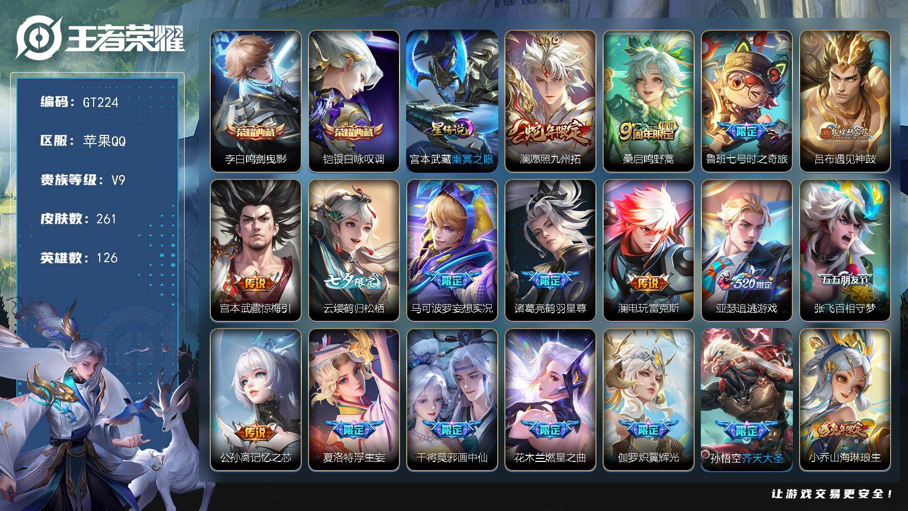 PX_2553511-可换绑【V9高质量精品号·2典藏·兔年全套·遇见神鼓·鹤归松栖·妄想实况·鹤羽星尊·追逃游戏·浮生妄·画中仙·燃星之曲·炽翼辉光·瑶时之祈愿·兰陵王默契交锋·武圣·凤求凰·傲雪梅枪·引擎之心·至尊宝·12万贵族积分】13按键,1星传说,7王者印记,五级铭文150,可二次GT224,苹果Q-V7-261皮肤-2典藏皮肤-40传说-59史诗【英雄全皮】:金蝉全皮【荣耀典藏】:李白鸣剑曳影,铠银白咏叹调【星元皮肤】:宫本武藏幽冥之眼【传说皮肤】:澜愿照九州拓,桑启鸣野蒿,鲁班七号时之奇旅,吕布遇见神鼓,宫本武藏惊梅引,云缨鹤归松栖,马可波罗妄想实况,诸葛亮鹤羽星尊,澜电玩雷克斯,亚瑟追逃游戏,张飞百相守梦,公孙离记忆之芯,夏洛特浮生妄,干将莫邪画中仙,花木兰燃星之曲,伽罗炽翼辉光,孙悟空齐天大圣,小乔山海琳琅生,曜山海苍雷引,李信山海炽霜斩,吕布怒海麟威,李白诗剑行,百里守约碎云,马超无双飞将,孙策末日机甲,瑶时之祈愿,赵云淬星耀世,李元芳飞鸢探春,兰陵王默契交锋,铠绛天战甲,镜炽阳神光,虞姬启明星使,关羽武圣,李信一念神魔,刘备时之恋人,虞姬云霓雀翎,花木兰冠军飞将,后羿黄金射手座,李白凤求凰,宫本武藏地狱之眼【限定皮肤】:大乔绒语心约,姜子牙天穹之誓,狄仁杰阴阳师,小乔山海琳琅生,赵云皇家上将,赵云引擎之心,孙尚香蔷薇恋人,鲁班七号时之奇旅,庄周云端筑梦师,扁鹊奇幻香踪,吕布遇见神鼓,马可波罗山海玄木吟,马可波罗妄想实况,狄仁杰魔术师,项羽海滩派对,关羽武圣,关羽百相守梦,韩信傲雪梅枪,兰陵王默契交锋,花木兰燃星之曲,亚瑟追逃游戏,孙悟空美猴王,孙悟空至尊宝,孙悟空齐天大圣,刘备百相守梦,张飞百相守梦,虞姬启明星使,杨戬潮玩骑兵,干将莫邪画中仙,诸葛亮鹤羽星尊,沈梦溪匿光破解者,裴擒虎擒涛扼浪,瑶时之祈愿,瑶山海碧波行,李信山海炽霜斩,伽罗炽翼辉光,嫦娥暖冬兔眠,曜山海苍雷引,西施玲珑珍味,鲁班大师探海日志,桑启海盐诗旅,夏洛特浮生妄,金蝉唐三藏,暃星界游侠,戈娅驭风魔法,艾琳流音漫舞,赵怀真鹤归松栖,云缨鹤归松栖,司空震地狱燃心,阿古朵江河有灵,张良古海寻踪,鬼谷子天穹祈灯,伽罗琥珀纪元,沈梦溪龙舞盛年,鲁班七号蔬乡物语,李元芳蔬乡物语,刘邦剑破天穹,程咬金群星魔术团,关羽决胜骁骑,镜青焰无极,项羽苍威无极,刘备异域游侠,周瑜熔金海岸【年限皮肤】:孙悟空美猴王,李白凤求凰,小乔山海琳琅生,曜山海苍雷引,李信山海炽霜斩,瑶山海碧波行,马可波罗山海玄木吟,澜愿照九州拓【赛季限定】:桑启海盐诗旅,裴擒虎擒涛扼浪,鲁班大师探海日志,张良古海寻踪,鬼谷子天穹祈灯,刘邦剑破天穹,姜子牙天穹之誓,钟馗虚灵犬护,亚瑟荣光之誓,牛魔星界战将,项羽九幽镇关【战令限定】:暃星界游侠,嫦娥暖冬兔眠,扁鹊奇幻香踪,杨戬潮玩骑兵,戈娅驭风魔法,西施玲珑珍味,司空震地狱燃心,艾琳流音漫舞,鲁班七号蔬乡物语,李元芳蔬乡物语,镜青焰无极,项羽苍威无极,周瑜线条小狗【史诗皮肤】:周瑜线条小狗,项羽九幽镇关,黄忠百相守梦,狂铁龙之律动,阿轲化蝶舞,牛魔星界战将,关羽决胜骁骑,镜青焰无极,鲁班七号蔬乡物语,伽罗琥珀纪元,阿古朵江河有灵,司空震地狱燃心,赵怀真鹤归松栖,戈娅驭风魔法,刘禅电玩爆裂旋风,沈梦溪匿光破解者,关羽百相守梦,刘备百相守梦,扁鹊奇幻香踪,镜玫瑰异探,瑶山海碧波行,马可波罗山海玄木吟,暃星界游侠,弈星滕王阁序,金蝉唐三藏,澜赏金猎手,韩信傲雪梅枪,橘右京修罗,狄仁杰鹰眼统帅,白起星夜王子,程咬金功夫厨神,李元芳逐浪之夏,蔡文姬舞动绿茵,铠曙光守护者,百里守约特工魅影,庄周云端筑梦师,安琪拉心灵骇客,兰陵王暗隐猎兽者,小乔缤纷独角兽,夏侯惇乘风破浪,花木兰水晶猎龙者,赵云引擎之心,孙悟空至尊宝,张飞乱世虎臣,吕布末日机甲,李白千年之狐,曹操幽灵船长,吕布圣诞狂欢,墨子金属风暴,妲己魅力维加斯,孙尚香水果甜心,孙尚香蔷薇恋人,宫本武藏鬼剑武藏,廉颇地狱岩魂,狄仁杰魔术师,王昭君偶像歌手,甄姬冰雪圆舞曲,赵云未来纪元,赵云皇家上将,露娜紫霞仙子【其他皮肤】:张良罗小黑战记,亚瑟荣光之誓,钟馗虚灵犬护,戈娅玫蓝誓约,达摩爆裂喵拳,东皇太一金福满堂,姜子牙星梦巡礼,影魅影绮裳,典韦铁骨偃魂,苍苍林狼骑,吕布逐霄战戟,米莱狄怪诞之夜,大乔绒语心约,周瑜熔金海岸,姜子牙天穹之誓,貂蝉长夏之忆,刘备异域游侠,大司命暗都幽影,项羽苍威无极,程咬金群星魔术团,盘古经纬探寻者,刘邦剑破天穹,扁鹊无尽旅途,李元芳蔬乡物语,钟无艳春野之旅,沈梦溪龙舞盛年,廉颇功夫炙烤,朵莉亚金色潮汐,嫦娥漠中幻影,鬼谷子天穹祈灯,曹操决胜大满贯,亚连破局者,钟无艳聚星闪耀,张良古海寻踪,艾琳流音漫舞,李元芳妄想特派,姬小满零食大作战,西施玲珑珍味,鲁班大师探海日志,莱西奥西部游侠,太乙真人劲辣红锅,杨戬潮玩骑兵,裴擒虎擒涛扼浪,赵怀真太极少年,猪八戒潮玩探月行,海月幻泉雾影,嫦娥暖冬兔眠,桑启海盐诗旅,蒙恬蔚蓝守将,程咬金无双福将,鲁班大师乓乓大师,露娜瓷语鉴心,刘禅秘密基地,狂铁特工战影,盾山圆桌骑士,沈梦溪鲨炮海盗猫,吕布野性能量,小乔丁香结,明世隐虹云星官,大乔守护之力,苏烈坚韧之力,李白敏锐之力,孙尚香沉稳之力,老夫子功夫老勺,狂铁命运角斗场,王昭君幻想奇妙夜,关羽龙腾万里,狄仁杰阴阳