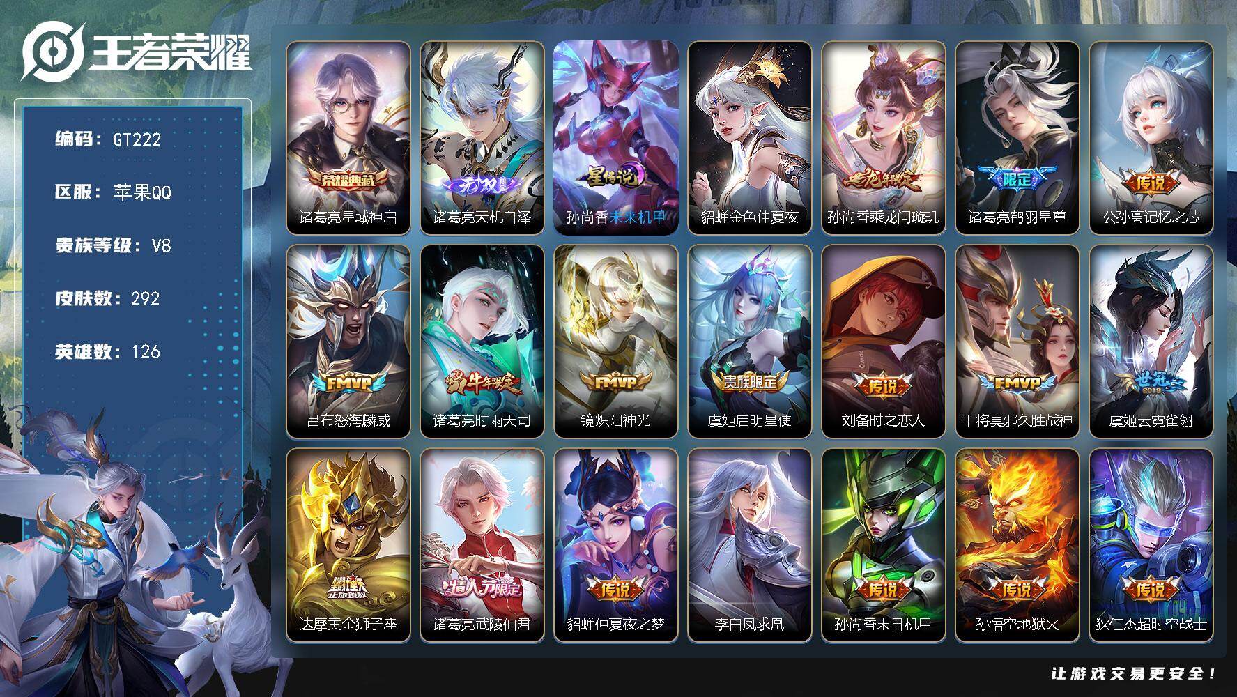 PX_2553512-可换绑【高质量诸葛亮号·诸葛亮全皮·发育路42段·1无双·1典藏·孙尚香龙限·凤求凰·雪豹霜爪·伽罗琥珀纪元·李元芳伽罗KPL·玉兔公主·白鹤梁神女·至尊宝·虞姬霸王别姬】5按键,2星传说,15王者印记,满级铭文,无二次包过GT222,苹果Q-V8-292皮肤-1典藏皮肤-1无双-17传说-79史诗【英雄全皮】:诸葛亮全皮【荣耀典藏】:诸葛亮星域神启【无双皮肤】:诸葛亮天机白泽【星元皮肤】:貂蝉金色仲夏夜,孙尚香未来机甲【传说皮肤】:孙尚香乘龙问璇玑,诸葛亮鹤羽星尊,公孙离记忆之芯,吕布怒海麟威,诸葛亮时雨天司,镜炽阳神光,虞姬启明星使,刘备时之恋人,干将莫邪久胜战神,虞姬云霓雀翎,达摩黄金狮子座,诸葛亮武陵仙君,貂蝉仲夏夜之梦,李白凤求凰,孙尚香末日机甲,孙悟空地狱火,狄仁杰超时空战士【限定皮肤】:白起狰,蔡文姬夏日便利店,大乔绒语心约,虞姬夏日便利店,姜子牙天穹之誓,狄仁杰阴阳师,虞姬凯尔特女王,赵云皇家上将,嬴政优雅恋人,庄周高山流水,高渐离死亡摇滚,钟无艳王者之锤,钟无艳超时空战士,孙膑妖精王,扁鹊炼金王,扁鹊奇幻香踪,白起夜都怪侠,芈月重明,元歌无心,夏侯惇朔风刀,甄姬游园惊梦,甄姬落雪兰心,曹操烛龙,典韦穷奇,马可波罗暗影游猎,狄仁杰魔术师,狄仁杰万华元夜,达摩沙漠行僧,项羽海滩派对,老夫子醍醐杖,程咬金演武夺筹,兰陵王金庭之子,孙悟空至尊宝,牛魔御旌,李元芳匿光侦查者,李元芳云中旅人,虞姬霸王别姬,虞姬启明星使,钟馗驱傩正仪,杨玉环遇见飞天,杨戬潮玩骑兵,雅典娜黎明之约,蔡文姬繁星吟游,太乙真人饕餮,鬼谷子原初探秘者,鬼谷子五谷丰年,诸葛亮武陵仙君,诸葛亮时雨天司,诸葛亮鹤羽星尊,大乔白鹤梁神女,黄忠火炮绅士,苏烈千军破阵,百里玄策原初追逐者,弈星混沌棋,梦奇顽趣,公孙离玉兔公主,沈梦溪大漠名商,明世隐疑决卦,裴擒虎李小龙,裴擒虎擒涛扼浪,狂铁御狮,米莱狄御霄,云中君纤云弄巧,伽罗天狼溯光者,盾山御銮,嫦娥拒霜思,嫦娥暖冬兔眠,西施玲珑珍味,鲁班大师探海日志,桑启海盐诗旅,暃星界游侠,戈娅驭风魔法,艾琳女武神,艾琳流音漫舞,司空震地狱燃心,阿古朵江河有灵,张良古海寻踪,蒙犽百解令,蒙恬荣光圣徽,高渐离燃音魔法,妲己灵卜魔法,鬼谷子天穹祈灯,伽罗琥珀纪元,孙尚香乘龙问璇玑,沈梦溪龙舞盛年,鲁班七号蔬乡物语,李元芳蔬乡物语,刘邦剑破天穹,程咬金群星魔术团,镜青焰无极,项羽苍威无极,刘备异域游侠,周瑜熔金海岸【年限皮肤】:李白凤求凰,诸葛亮时雨天司,孙尚香乘龙问璇玑【赛季限定】:孙膑妖精王,扁鹊炼金王,虞姬凯尔特女王,白起狰,太乙真人饕餮,曹操烛龙,芈月重明,典韦穷奇,狂铁御狮,米莱狄御霄,牛魔御旌,盾山御銮,夏侯惇朔风刀,弈星混沌棋,明世隐疑决卦,老夫子醍醐杖,鬼谷子原初探秘者,狄仁杰万华元夜,程咬金演武夺筹,钟馗驱傩正仪,苏烈千军破阵,达摩沙漠行僧,兰陵王金庭之子,沈梦溪大漠名商,李元芳云中旅人,桑启海盐诗旅,裴擒虎擒涛扼浪,鲁班大师探海日志,张良古海寻踪,鬼谷子天穹祈灯,刘邦剑破天穹,姜子牙天穹之誓,东皇太一噬灭天穹,钟馗虚灵犬护,甄姬逆浪荇歌,百里玄策原初追逐者,雅典娜黎明之约,梦奇顽趣,蒙恬荣光圣徽【战令限定】:马可波罗暗影游猎,黄忠火炮绅士,白起夜都怪侠,钟无艳超时空战士,甄姬落雪兰心,暃星界游侠,嫦娥暖冬兔眠,扁鹊奇幻香踪,杨戬潮玩骑兵,戈娅驭风魔法,西施玲珑珍味,司空震地狱燃心,艾琳流音漫舞,高渐离燃音魔法,妲己灵卜魔法,鲁班七号蔬乡物语,李元芳蔬乡物语,镜青焰无极,项羽苍威无极,蔡文姬夏日便利店,虞姬夏日便利店【史诗皮肤】:百里守约雪豹霜爪,蔡文姬夏日便利店,镜青焰无极,鲁班七号蔬乡物语,伽罗琥珀纪元,蒙恬荣光圣徽,高渐离燃音魔法,妲己灵卜魔法,周瑜雪夜绮愿,蒙犽百解令,阿古朵江河有灵,司空震地狱燃心,李元芳匿光侦查者,戈娅驭风魔法,刘禅电玩爆裂旋风,扁鹊奇幻香踪,暃星界游侠,梦奇顽趣,元歌无心,鬼谷子五谷丰年,钟无艳超时空战士,公孙离玉兔公主,雅典娜黎明之约,黄忠火炮绅士,嫦娥拒霜思,庄周高山流水,大乔白鹤梁神女,伽罗天狼溯光者,云中君纤云弄巧,裴擒虎李小龙,百里玄策原初追逐者,马可波罗暗影游猎,不知火舞魅语,大乔白蛇,蔡文姬繁星吟游,公孙离无限星赏官,狄仁杰鹰眼统帅,伽罗箭羽风息,杨玉环遇见飞天,阿轲节奏热浪,白起星夜王子,程咬金功夫厨神,李元芳逐浪之夏,蔡文姬舞动绿茵,铠曙光守护者,百里守约特工魅影,安琪拉心灵骇客,甄姬游园惊梦,诸葛亮黄金分割率,兰陵王暗隐猎兽者,小乔缤纷独角兽,夏侯惇乘风破浪,刘邦德古拉伯爵,花木兰水晶猎龙者,孙悟空至尊宝,虞姬霸王别姬,韩信白龙吟,张飞乱世虎臣,吕布末日机甲,李白千年之狐,曹操幽灵船长,吕布圣诞狂欢,墨子金属风暴,妲己女仆咖啡,妲己魅力维加斯,嬴政摇滚巨星,嬴政暗夜贵公子,嬴政优雅恋人,孙尚香水果甜心,宫本武藏鬼剑武藏,狄仁杰魔术师,王昭君偶像歌手,甄姬冰雪圆舞曲,貂蝉圣诞恋歌,赵云未来纪元,赵云皇家上将,钟无艳王者之锤,阿轲暗夜猫娘,露娜紫霞仙子,鲁班七号电玩小子【其他皮肤】:鬼谷子克喵,甄姬逆浪荇歌,雅典娜潮玩士官长,露娜命运加冕,阿古朵布丁狗之约,张良灵野札记,钟馗虚灵犬护,姜子牙星梦巡礼,东皇太一噬灭天穹,大乔绒语心约,虞姬夏日便利店,周瑜熔金海岸,姜子牙