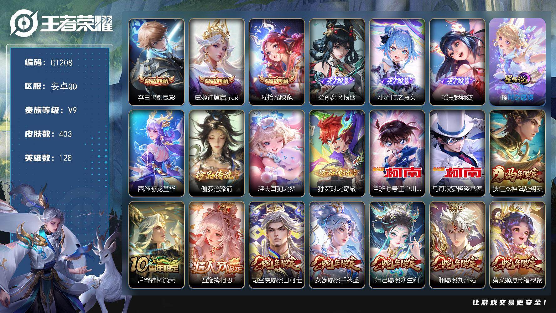 PX_2553515-可换绑,【高质量极品v9女号·游走41段·金标大乔·瑶全皮带紫瑶·西施全皮·3无双公孙离瑶小乔·3典藏瑶李白虞姬·5珍品怪盗基德柯南·蛇年全套·心动手记·挚爱花嫁·大乔时之奇旅·牛年公孙离·龙限大乔·贵族积分10w】18按键,2星传说,17王者印记,五级铭文160,可二次GT208,安卓Q-V9-403皮肤-3典藏皮肤-3无双-5珍品传说-28传说-114史诗【英雄全皮】:刘禅全皮,孙权全皮,瑶全皮,敖隐全皮,西施全皮,戈娅全皮,空空儿全皮,影全皮,少司缘全皮【荣耀典藏】:李白鸣剑曳影,虞姬神鉴启示录,瑶拾光映像【无双皮肤】:公孙离离恨烟,小乔时之魔女,瑶真我赫兹【珍品传说】:伽罗沧流箭,瑶大耳狗之梦,孙策时之奇旅,鲁班七号江户川柯南,马可波罗怪盗基德【星元皮肤】:瑶时之愿境,西施游龙堇华【传说皮肤】:狄仁杰神骥赴朔漠,后羿神树通天,西施续相思,司空震愿照山河定,女娲愿照千秋盛,妲己愿照众生和,澜愿照九州拓,蔡文姬愿照福禄聚,虞姬愿照岁时盈,云缨幻光神枪,王昭君映山客,桑启鸣野蒿,朵莉亚心动手记,大乔时之奇旅,马可波罗妄想实况,夏洛特浮生妄,小乔山海琳琅生,大乔挚爱花嫁,瑶时之祈愿,西施游龙清影,公孙离祈雪灵祝,镜炽阳神光,虞姬启明星使,曜云鹰飞将,貂蝉猫影幻舞,干将莫邪久胜战神,后羿黄金射手座,孙尚香末日机甲【限定皮肤】:公孙离离恨烟,蒙犽顽岩魄,蔡文姬夏日便利店,大乔绒语心约,虞姬夏日便利店,姜子牙天穹之誓,杨戬破阵退雄兵,狄仁杰阴阳师,小乔山海琳琅生,赵云皇家上将,墨子神迹守卫,妲己时之彼端,孙尚香蔷薇恋人,庄周高山流水,元歌无心,甄姬游园惊梦,甄姬落雪兰心,马可波罗暗影游猎,马可波罗山海玄木吟,马可波罗妄想实况,狄仁杰魔术师,狄仁杰万华元夜,达摩沙漠行僧,项羽海滩派对,老夫子航海奇遇记,程咬金演武夺筹,王昭君午后时光,兰陵王金庭之子,李元芳银河之约,李元芳云中旅人,虞姬启明星使,钟馗驱傩正仪,杨玉环遇见飞天,女娲朔望之晖,干将莫邪胡桃夹子,雅典娜黎明之约,鬼谷子原初探秘者,鬼谷子五谷丰年,大乔白鹤梁神女,大乔挚爱花嫁,大乔时之奇旅,苏烈千军破阵,百里玄策原初追逐者,梦奇顽趣,公孙离蜜橘之夏,公孙离祈雪灵祝,公孙离玉兔公主,沈梦溪大漠名商,明世隐吟游魔法,裴擒虎擒涛扼浪,狂铁电玩高手,米莱狄胡桃异想国,瑶时之祈愿,瑶山海碧波行,云中君纤云弄巧,嫦娥拒霜思,嫦娥暖冬兔眠,西施玲珑珍味,西施至美乘鲤谣,蒙犽狂想玩偶喵,鲁班大师探海日志,桑启海盐诗旅,夏洛特浮生妄,暃星界游侠,戈娅驭风魔法,艾琳女武神,艾琳流音漫舞,阿古朵江河有灵,张良古海寻踪,蒙恬荣光圣徽,高渐离燃音魔法,妲己灵卜魔法,鬼谷子天穹祈灯,小乔时之魔女,大乔乘龙忆丹青,沈梦溪龙舞盛年,鲁班七号蔬乡物语,李元芳蔬乡物语,刘邦剑破天穹,程咬金群星魔术团,镜青焰无极,项羽苍威无极,朵莉亚心动手记,周瑜熔金海岸【年限皮肤】:公孙离祈雪灵祝,小乔山海琳琅生,瑶山海碧波行,马可波罗山海玄木吟,大乔乘龙忆丹青,司空震愿照山河定,女娲愿照千秋盛,妲己愿照众生和,澜愿照九州拓,蔡文姬愿照福禄聚,虞姬愿照岁时盈【赛季限定】:鬼谷子原初探秘者,狄仁杰万华元夜,程咬金演武夺筹,钟馗驱傩正仪,苏烈千军破阵,达摩沙漠行僧,兰陵王金庭之子,沈梦溪大漠名商,李元芳云中旅人,桑启海盐诗旅,裴擒虎擒涛扼浪,鲁班大师探海日志,张良古海寻踪,鬼谷子天穹祈灯,刘邦剑破天穹,姜子牙天穹之誓,东皇太一噬灭天穹,太乙真人谧流熔炉,钟馗虚灵犬护,甄姬逆浪荇歌,亚瑟荣光之誓,百里玄策原初追逐者,雅典娜黎明之约,梦奇顽趣,蒙恬荣光圣徽,牛魔星界战将,项羽九幽镇关【战令限定】:女娲朔望之晖,李元芳银河之约,马可波罗暗影游猎,蒙犽狂想玩偶喵,米莱狄胡桃异想国,老夫子航海奇遇记,墨子神迹守卫,明世隐吟游魔法,狂铁电玩高手,王昭君午后时光,甄姬落雪兰心,暃星界游侠,嫦娥暖冬兔眠,戈娅驭风魔法,西施玲珑珍味,艾琳流音漫舞,高渐离燃音魔法,妲己灵卜魔法,鲁班七号蔬乡物语,李元芳蔬乡物语,镜青焰无极,项羽苍威无极,蔡文姬夏日便利店,虞姬夏日便利店,亚连破空之剑,孙悟空神迹守卫,百里守约百相守梦,老夫子百相守梦,孙膑茶境仙,马超访茗客,刘禅鸭鸭历险记,沈梦溪鸭鸭历险记,周瑜百相守梦,孙策百相守梦,莱西奥光弋星穹,明世隐往忆晖光,周瑜线条小狗,小乔线条小狗【史诗皮肤】:太乙真人瓦猫非猫,明世隐百晓客,周瑜线条小狗,小乔线条小狗,项羽九幽镇关,少司缘巫礼祀神,女娲万灵启世,百里玄策罗小黑战记,莱西奥光弋星穹,公孙离涂山容容,西施织梦人,黄忠百相守梦,周瑜百相守梦,扁鹊灵蛊蚀心,狂铁龙之律动,刘禅鸭鸭历险记,阿轲化蝶舞,赵怀真器灵浮梦炉,孙膑茶境仙,牛魔星界战将,百里守约百相守梦,艾琳陌上桑,亚连破空之剑,姬小满战舞者,大司命东方月初,少司缘涂山红红,蒙犽顽岩魄,蔡文姬夏日便利店,黄忠怒海争锋,镜青焰无极,鲁班七号蔬乡物语,大乔乘龙忆丹青,蒙恬荣光圣徽,高渐离燃音魔法,妲己灵卜魔法,西施至美乘鲤谣,阿古朵江河有灵,百里守约真我赫兹,戈娅驭风魔法,刘禅电玩爆裂旋风,杨玉环银翎春语,瑶山海碧波行,马可波罗山海玄木吟,暃星界游侠,梦奇顽趣,元歌无心,鬼谷子五谷丰年,狂铁电玩高手,明世隐吟游魔法,艾琳奇遇舞章,公孙离玉兔公主,雅典娜黎明之约,嫦娥拒霜思,庄