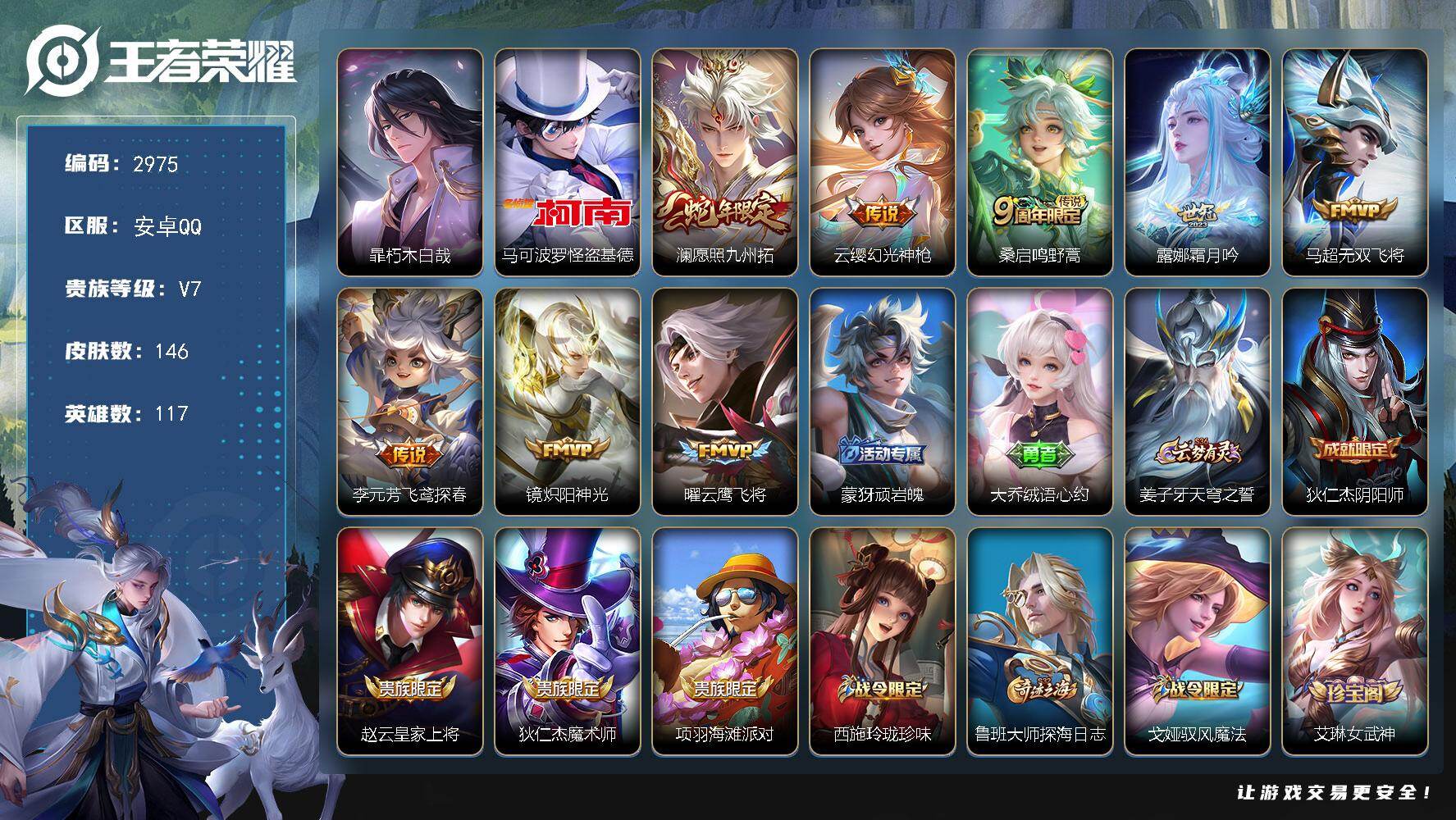 PX_2557183-Q-V7-尊贵铂金III段位-117英雄-146皮肤-2珍品传说-8传说-28史诗 【英雄全皮】:影全皮 【珍品传说】:暃朽木白哉,马可波罗怪盗基德 【传说皮肤】:澜愿照九州拓,云缨幻光神枪,桑启鸣野蒿,露娜霜月吟,马超无双飞将,李元芳飞鸢探春,镜炽阳神光,曜云鹰飞将 【限定皮肤】:蒙犽顽岩魄,大乔绒语心约,姜子牙天穹之誓,狄仁杰阴阳师,赵云皇家上将,狄仁杰魔术师,项羽海滩派对,西施玲珑珍味,鲁班大师探海日志,戈娅驭风魔法,艾琳女武神,张良古海寻踪,高渐离燃音魔法,妲己灵卜魔法,鬼谷子天穹祈灯,刘邦剑破天穹,镜青焰无极,项羽苍威无极,刘备异域游侠,周瑜熔金海岸 【年限皮肤】:澜愿照九州拓 【赛季限定】:鲁班大师探海日志,张良古海寻踪,鬼谷子天穹祈灯,刘邦剑破天穹,姜子牙天穹之誓 【战令限定】:戈娅驭风魔法,西施玲珑珍味,高渐离燃音魔法,妲己灵卜魔法,镜青焰无极,项羽苍威无极,孙膑茶境仙,马超访茗客,周瑜线条小狗,小乔线条小狗 【史诗皮肤】:周瑜线条小狗,小乔线条小狗,阿轲化蝶舞,赵怀真器灵浮梦炉,姬小满飞车小橘子,孙膑茶境仙,马可波罗星界特工,蒙犽顽岩魄,镜青焰无极,高渐离燃音魔法,妲己灵卜魔法,镜真我赫兹,戈娅驭风魔法,小乔青蛇,狄仁杰鹰眼统帅,孙策猫狗日记,铠曙光守护者,百里守约特工魅影,兰陵王暗隐猎兽者,小乔缤纷独角兽,刘邦德古拉伯爵,李白千年之狐,妲己魅力维加斯,嬴政摇滚巨星,孙尚香水果甜心,宫本武藏鬼剑武藏,狄仁杰魔术师,甄姬冰雪圆舞曲,赵云皇家上将,露娜紫霞仙子 【其他皮肤】:影百相守梦,白起死霸装,雅典娜潮玩士官长,阿古朵布丁狗之约,张良灵野札记,小乔秘证寻踪,苏烈春野闲踪,刘备浪漫序章,戈娅玫蓝誓约,明世隐景韶洛都,少司缘灵卦秘语,达摩爆裂喵拳,东皇太一金福满堂,西施雪境奇遇,影魅影绮裳,马超访茗客,苍苍林狼骑,吕布逐霄战戟,干将莫邪雾都夜雨,盘古敬我三分,大乔绒语心约,周瑜熔金海岸,姜子牙天穹之誓,刘备异域游侠,大司命暗都幽影,项羽苍威无极,刘邦剑破天穹,海诺时空谍影,妲己灵卜魔法,鬼谷子天穹祈灯,亚连破局者,张良古海寻踪,李元芳妄想特派,姬小满零食大作战,西施玲珑珍味,鲁班大师探海日志,海月幻泉雾影,刘邦虎啸剑宗,鲁班大师乓乓大师,露娜瓷语鉴心,狂铁特工战影,沈梦溪鲨炮海盗猫,吕布野性能量,小乔丁香结,李白敏锐之力,诸葛亮掌控之力,孙尚香沉