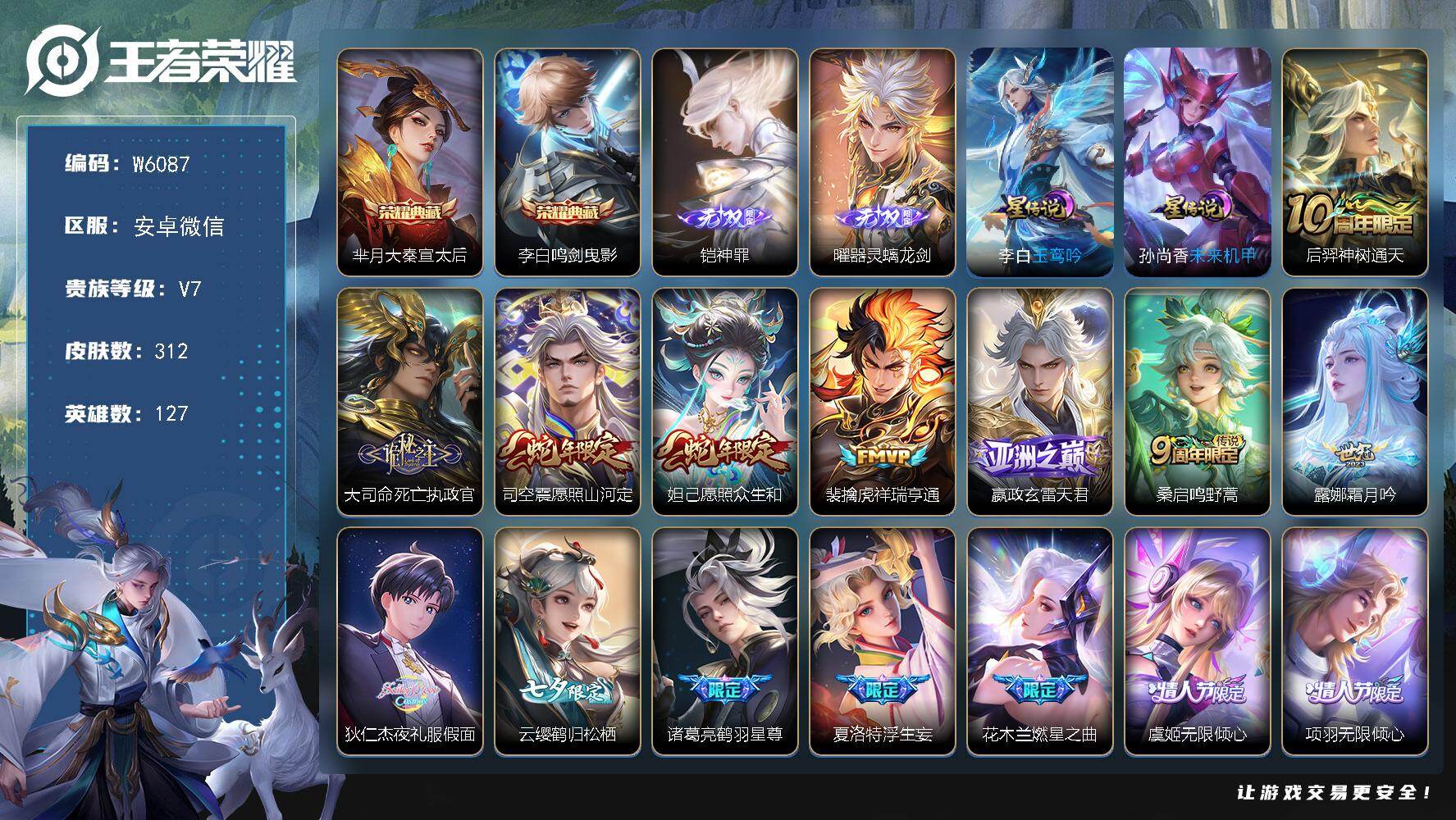 PX_2543631-【W6075】安卓Q区-可二次-贵8-127英雄-322皮肤-3典藏-2珍品传说-20传说-2星元-12按键-最初的交响/银白咏叹调/无限飓风号/至尊宝/时之奇旅/朽木白哉/愿照·九州拓/愿照·岁时盈/愿照·千秋盛/祥瑞亨通/玄雷天君/碎云/妄想实况/淬星耀世/绛天战甲/末日机甲/一念神魔/时之恋人/涂山容容/器灵·浮梦炉/飞衡/青龙志/蓝屏警告-贵族积分9.7W-营地ID:324870198 【星元皮肤】:宫本武藏幽冥之眼,孙尚香未来机甲