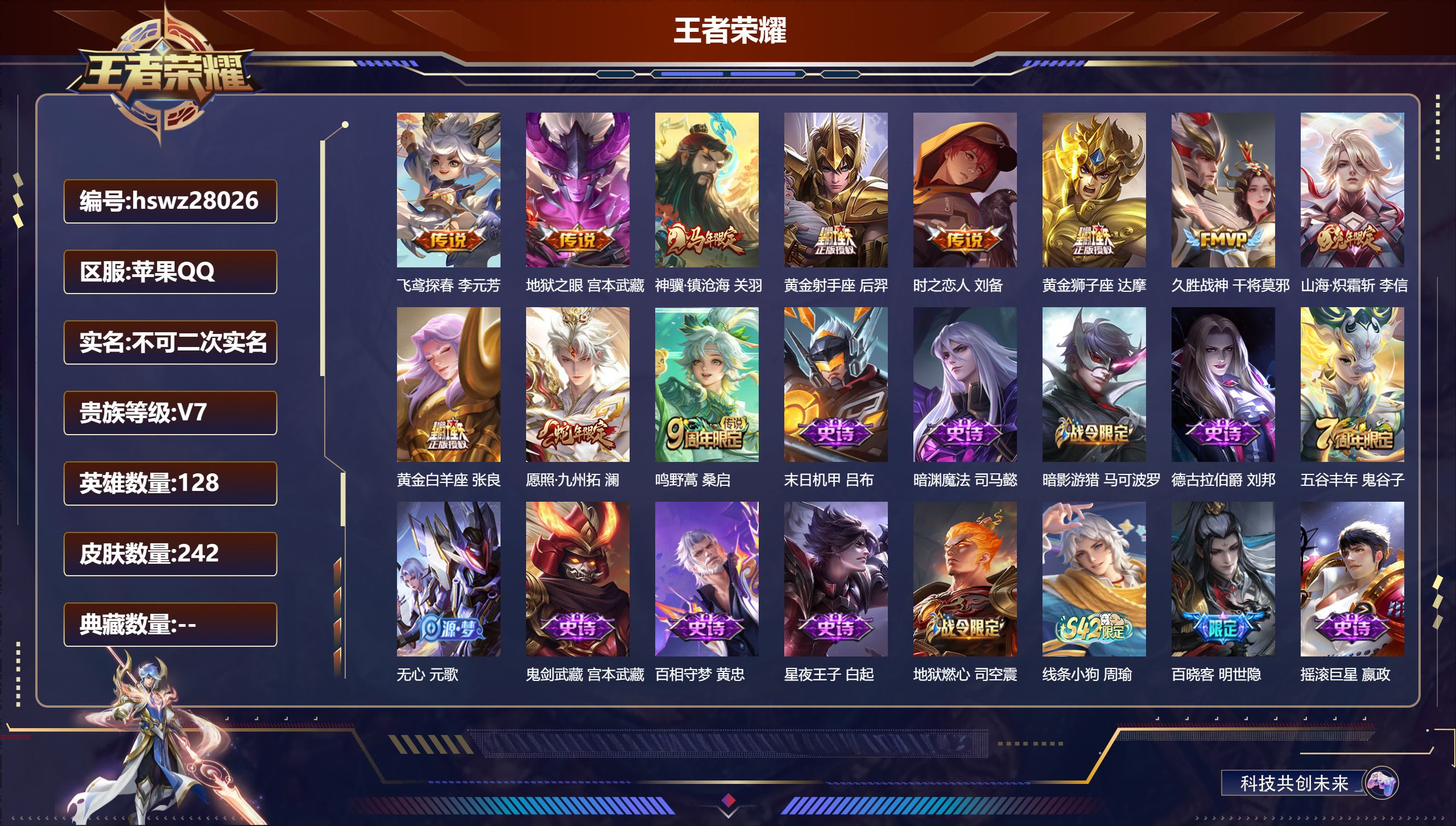 PX_2507290-??价比·沧流箭·幽冥之眼·齐天大圣·乞巧织情·飞鸢探春·炽阳神光·冠军飞将·地狱之眼·谪仙醉月·可二次】YXw17776-安卓Q-90英雄-79皮肤-3王者印记-60铭文-贵族积分2w【贵族7】【·1珍品·1星传说·7传说】【因赛季更新游戏段付以上号为准!】 【珍品传说】:伽罗沧流箭 【星元皮肤】:宫本武藏幽冥之眼 【传说皮肤】:孙悟空齐天大圣,王昭君乞巧织情,李元芳飞鸢探春,镜炽阳神光,花木兰冠军飞将,孙尚香末日机甲,宫本武藏地狱之眼 【限定皮肤】:李白谪仙醉月,狄仁杰阴阳师,赵云皇家上将,元歌无心,狄仁杰魔术师,项羽海滩派对,孙悟空齐天大圣,上官婉儿梁祝,沈梦溪龙舞盛年 【赛季限定】:钟馗虚灵犬护,甄姬逆浪荇歌,亚瑟荣光之誓 【战令限定】:莱西奥光弋星穹,明世隐往忆晖光,周瑜线条小狗,小乔线条小狗 【史诗皮肤】:周瑜线条小狗,小乔线条小狗,莱西奥光弋星穹,狂铁龙之律动,阿轲化蝶舞,李白谪仙醉月,元歌无心,司马懿暗渊魔法,沈梦溪月团寄思,上官婉儿梁祝,狄仁杰鹰眼统帅,阿轲节奏热浪,白起星夜王子,蔡文姬舞动绿茵,铠曙光守护者,雅典娜冰冠公主,兰陵王暗隐猎兽者,李白千年之狐,曹操幽灵船长,妲己魅力维加斯,嬴政暗夜贵公子,宫本武藏鬼剑武藏,狄仁杰魔术师,赵云皇家上将,露娜紫霞仙子 【其他皮肤】:鲁班七号班班快跑,桑启线条小狗,虞姬溯影追猎,蚩奼极光幻客,艾琳鹤鸣心笺,明世隐往忆晖光,亚瑟荣光之誓,哪吒罗小黑战记,甄姬逆浪荇歌,露娜命运加冕,张良灵野札记,苏烈春野闲踪,钟馗虚灵犬护,刘备浪漫序章,戈娅玫蓝誓约,大司命暗都幽影,沈梦溪龙舞盛年,姬小满零食大作战,沈梦溪鲨炮海盗猫,孙尚香沉稳之力,狂铁命运角斗场,王昭君幻想奇妙夜,狄仁杰阴阳师,宫本武藏万象初新,花木兰兔女郎,亚瑟死亡骑士,妲己少女阿狸,宫本武藏未来纪元,赵云忍炎影,阿轲爱心护理,韩信街头霸王,项羽海滩派对,云缨赤焰之缨,澜孤猎,镜冰刃幻境,马超幸存者,曜归虚梦演,瑶森,盘古创世神祝,上官婉儿修竹墨客,李信灼热之刃,伽罗花见巫女,司马懿魇语军师,元歌午夜歌剧院,马可波罗激情绿茵,孙悟空西部大镖客
