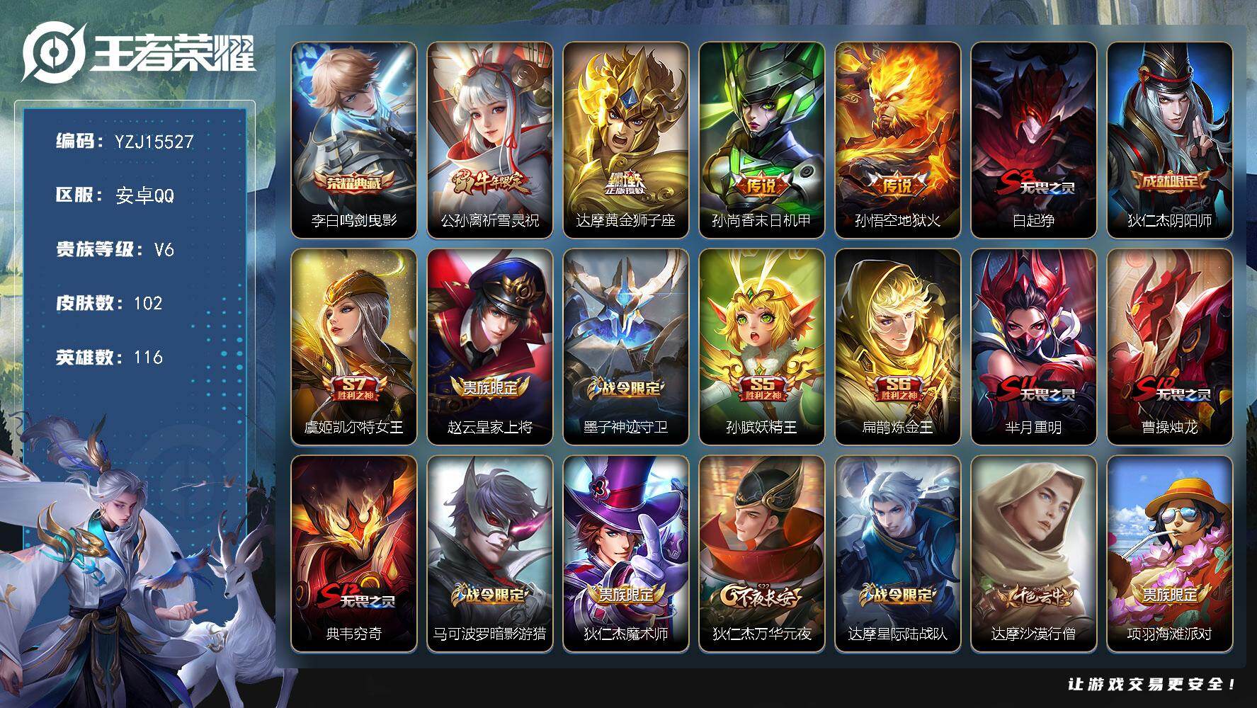 PX_2550916-安卓Q-V6-102皮肤1典藏4传说,全能高手,20段打野,20段对抗,10县标,【典藏】,鸣剑曳影,【传说】,祈雪灵祝,地狱火,黄金狮子座,末日机甲女,【热门】祈雪灵祝,天狼溯光者,暗影游猎,原初追逐者,电玩小子,原初探秘者,水晶猎龙者,热力回旋,修罗,白龙吟,千年之狐,赏金猎手,街头霸王,花好人间,妖精王,炼金王,凯尔特女王,狰,饕餮,烛龙,重明,穷奇,御狮,御旌,御銮,混沌棋,疑决卦,醍醐杖,万华元夜,演武夺筹,驱傩正仪,拳王,沙漠行僧,金庭之子,大漠名商,云中旅人,丁香结,海盐诗旅,皇家上将,擒涛扼浪,魅力维加斯,探海日志,胡桃异想国,繁星吟游,航海奇遇记,鹰眼统帅,魔术师,7王者印记,112英雄-营地ID:73461367